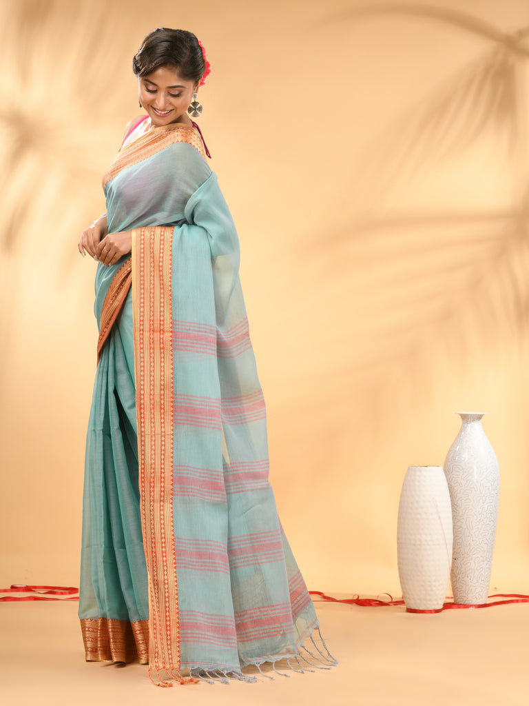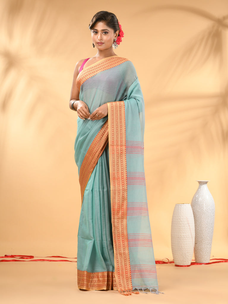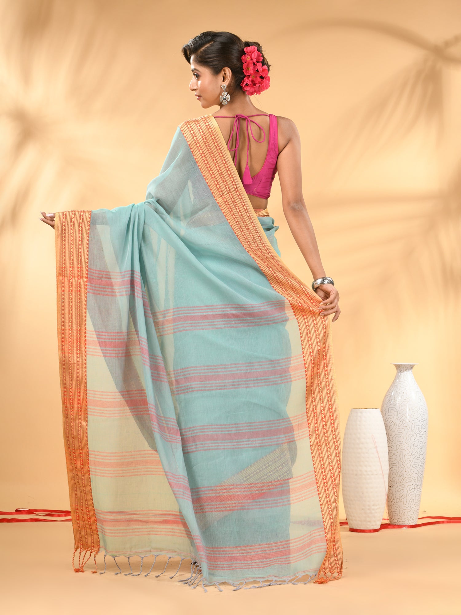 Elevate your ethnic wardrobe with the timeless charm of the Turquoise Blue Soft Mulmul Cotton Saree. Crafted from soft, breathable mulmul cotton, this saree features a soothing turquoise blue base complemented by vibrant borders and a contrasting pallu adorned with traditional woven stripes. Lightweight and elegant, it's perfect for everyday elegance, festive gatherings, or summer occasions. The saree drapes effortlessly, offering comfort without compromising on style.