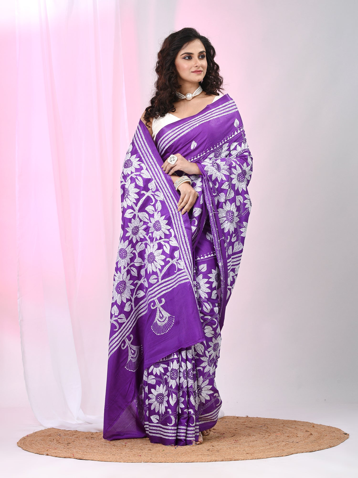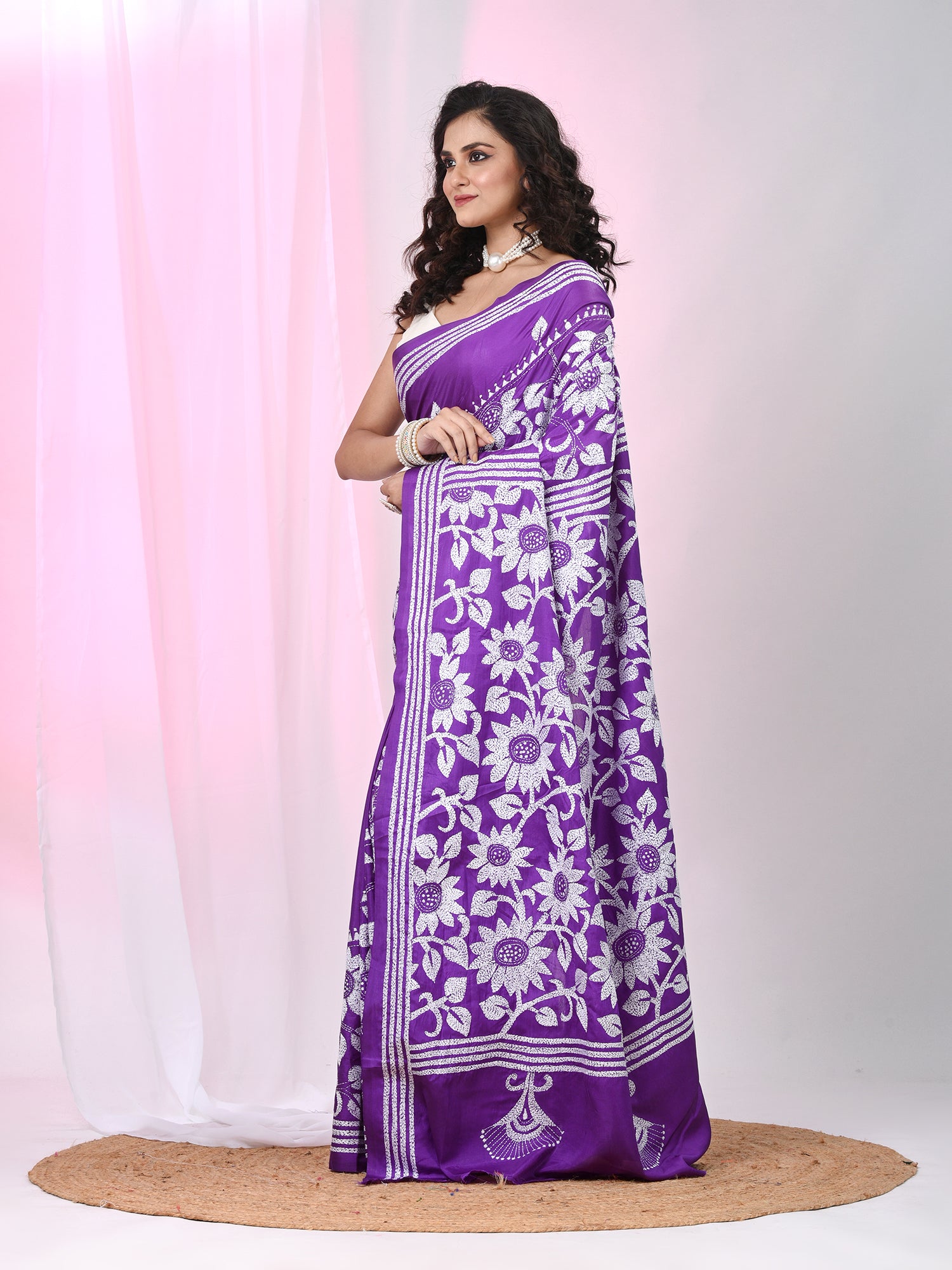 Exude grace and tradition with this exquisite violet silk blend Kantha stitch saree. Elegantly thread work with white threadwork in intricate floral patterns, this saree is a timeless masterpiece of craftsmanship. The smooth silk blend fabric offers a rich drape, while the detailed Kantha work adds a touch of sophistication and cultural heritage. Perfect for festive occasions, weddings, and traditional gatherings, this saree beautifully balances elegance and comfort.