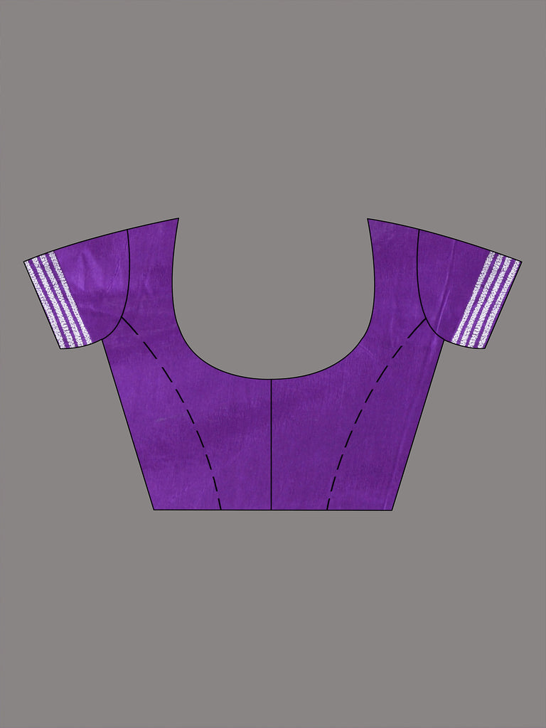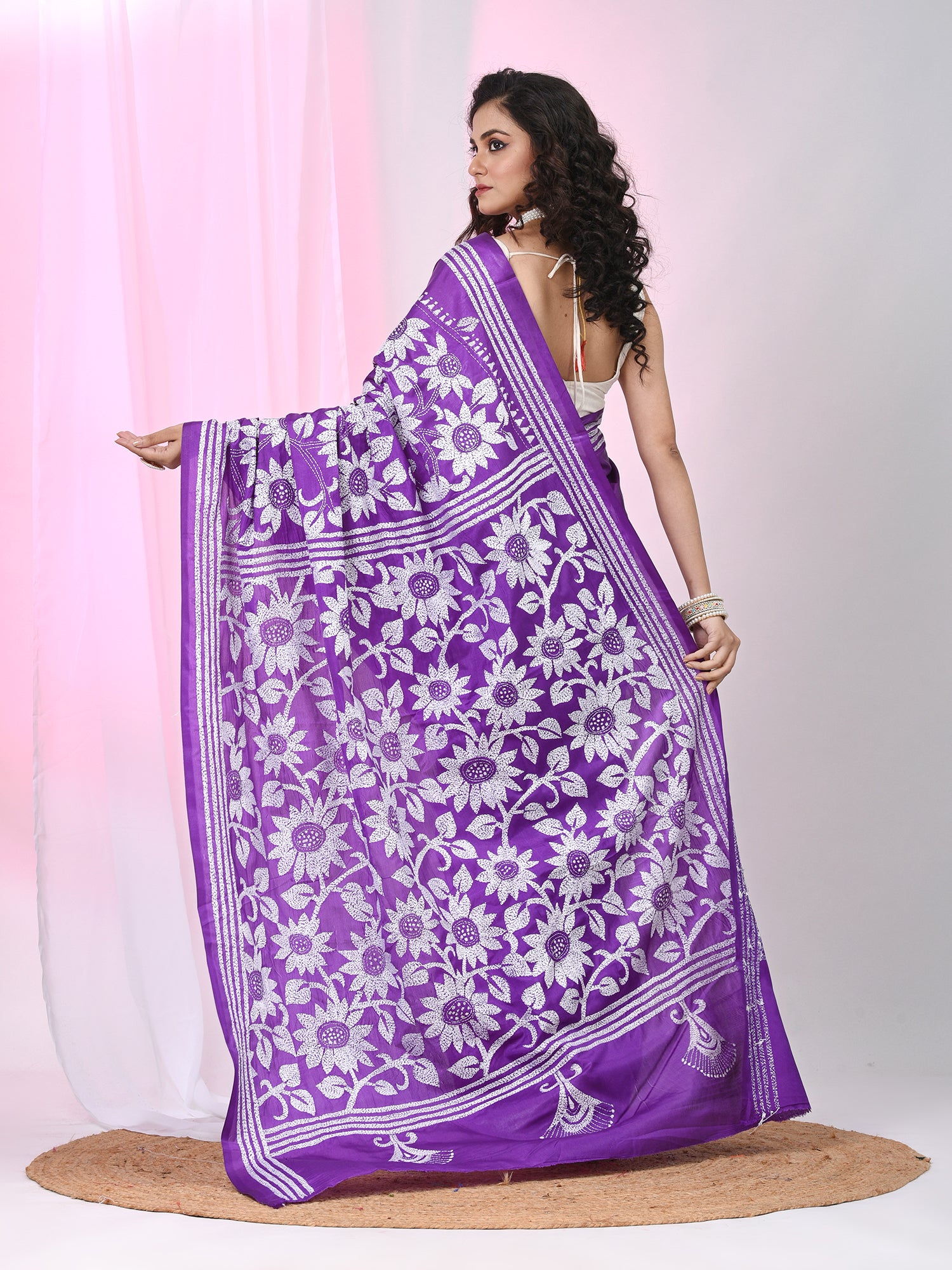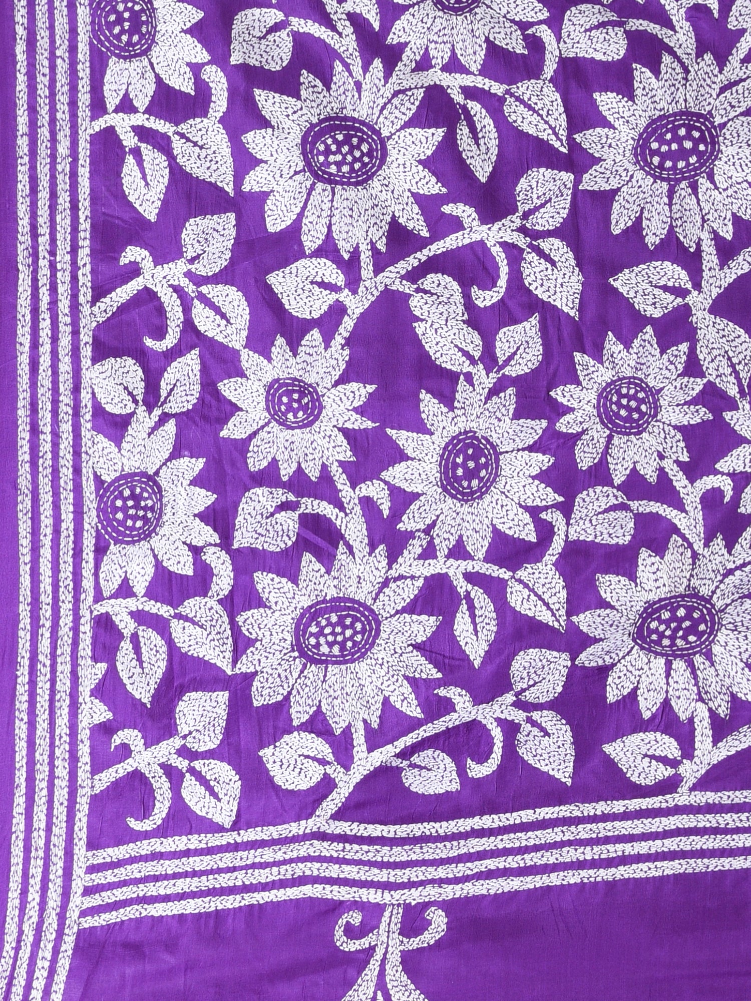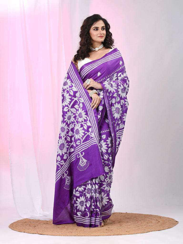Violet Silk Kantha Stitch Saree with White Floral Thread Work