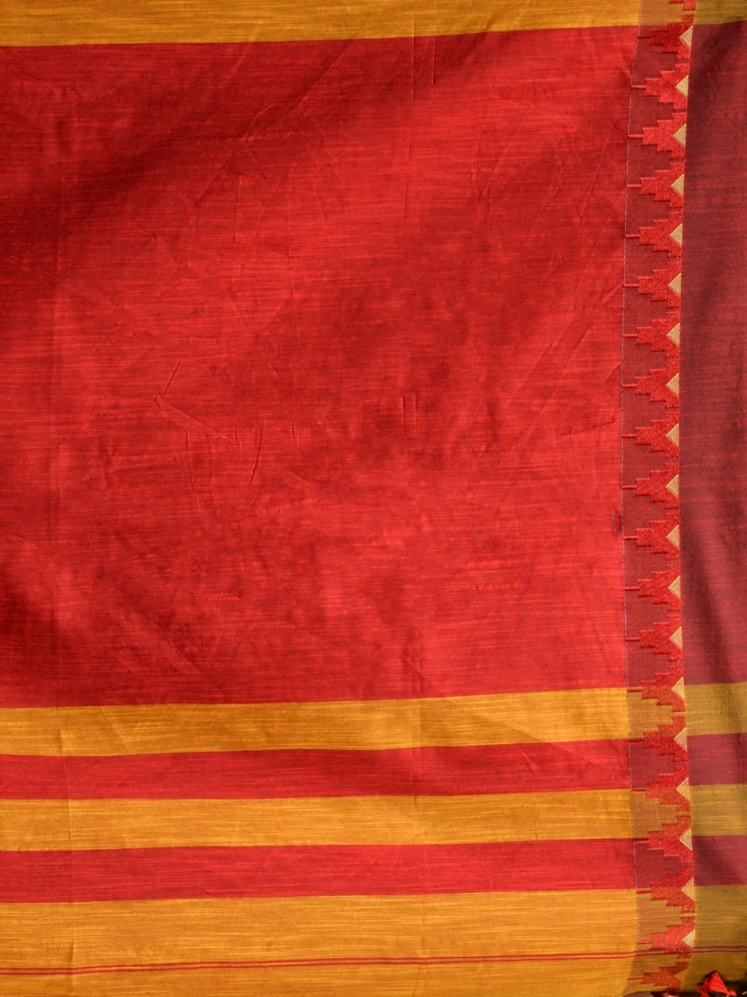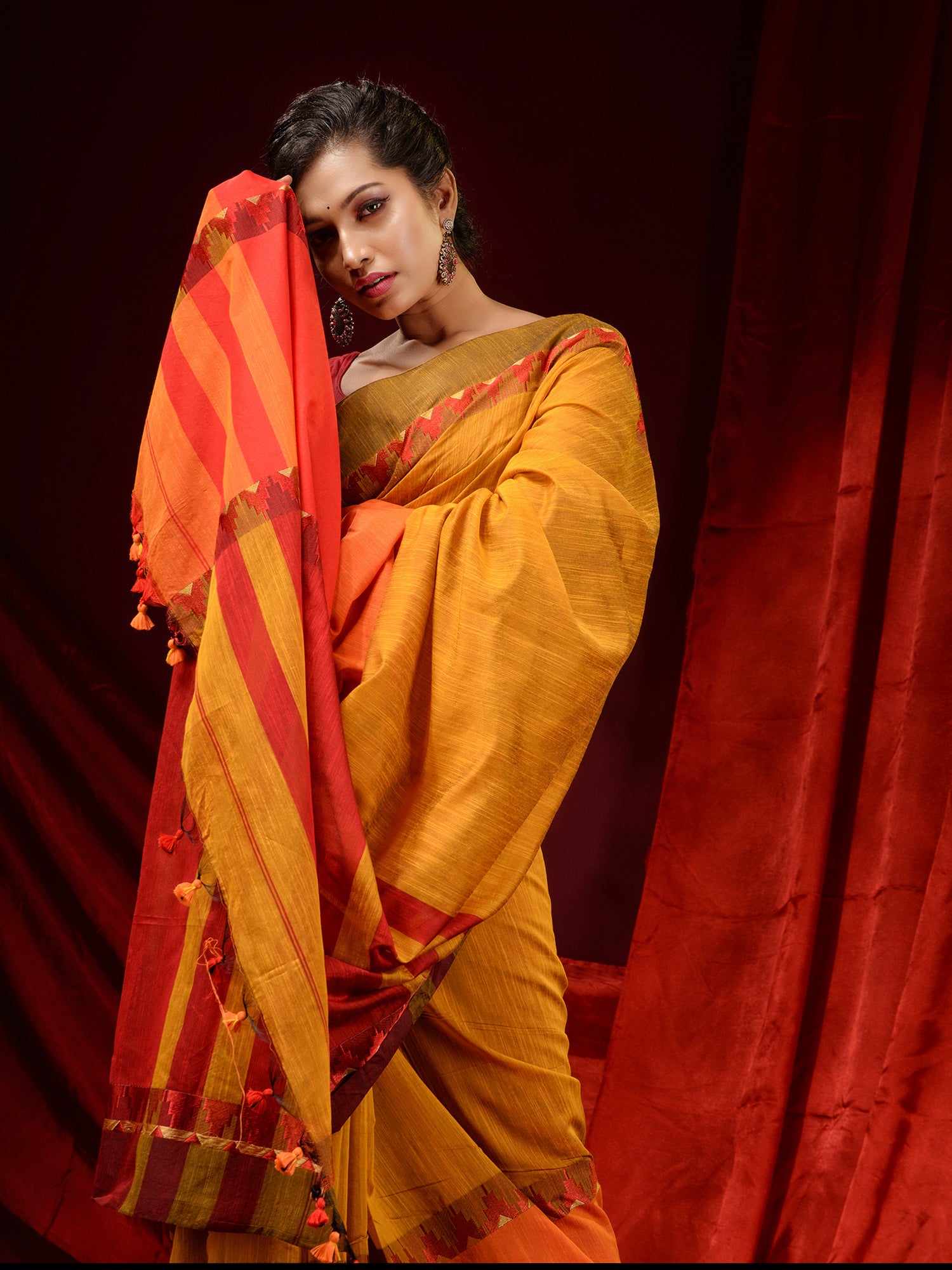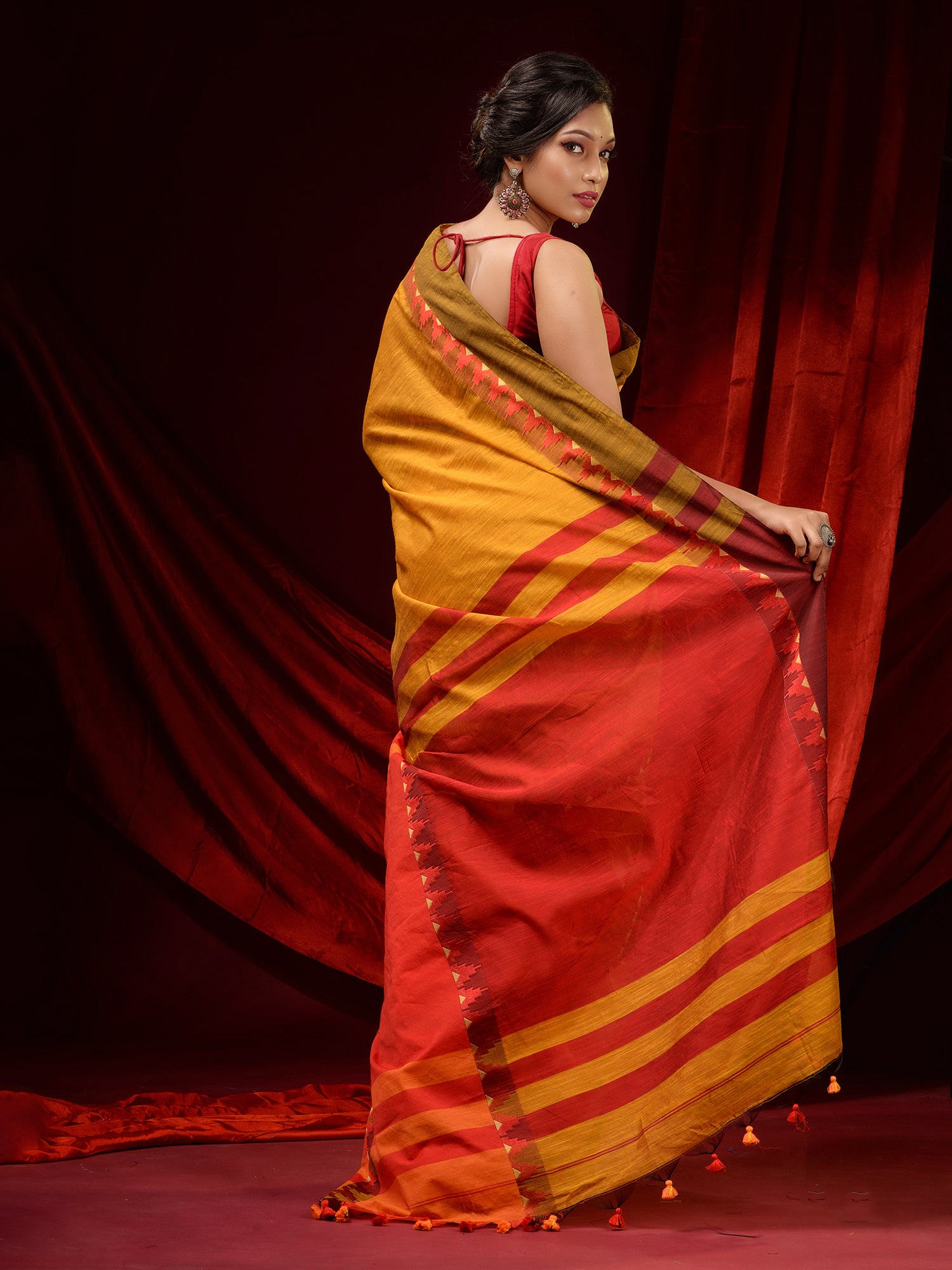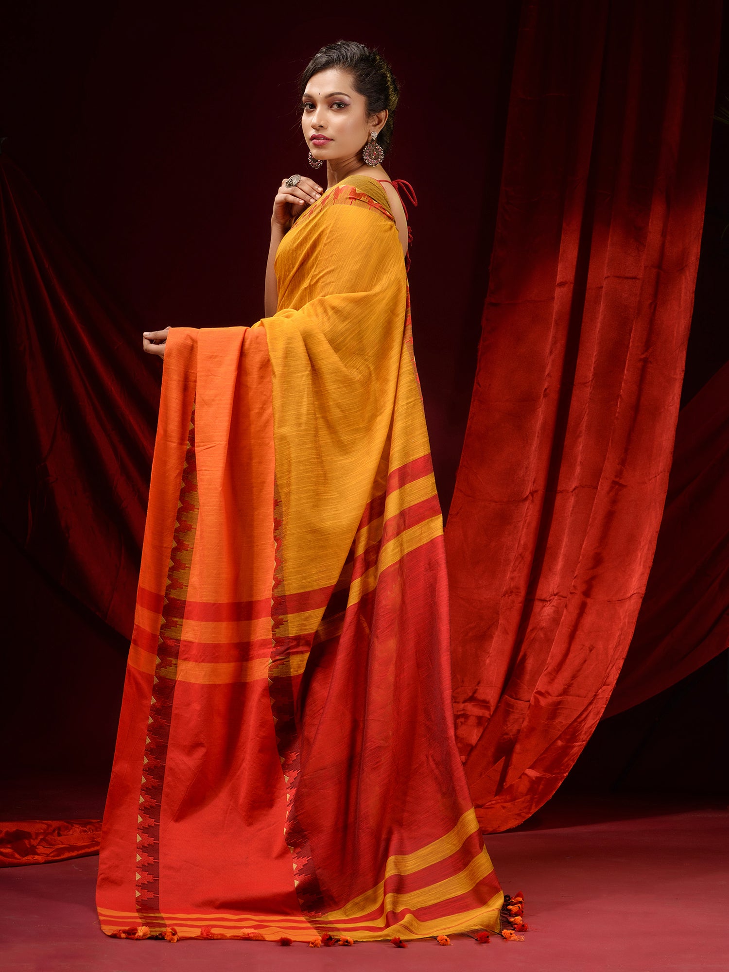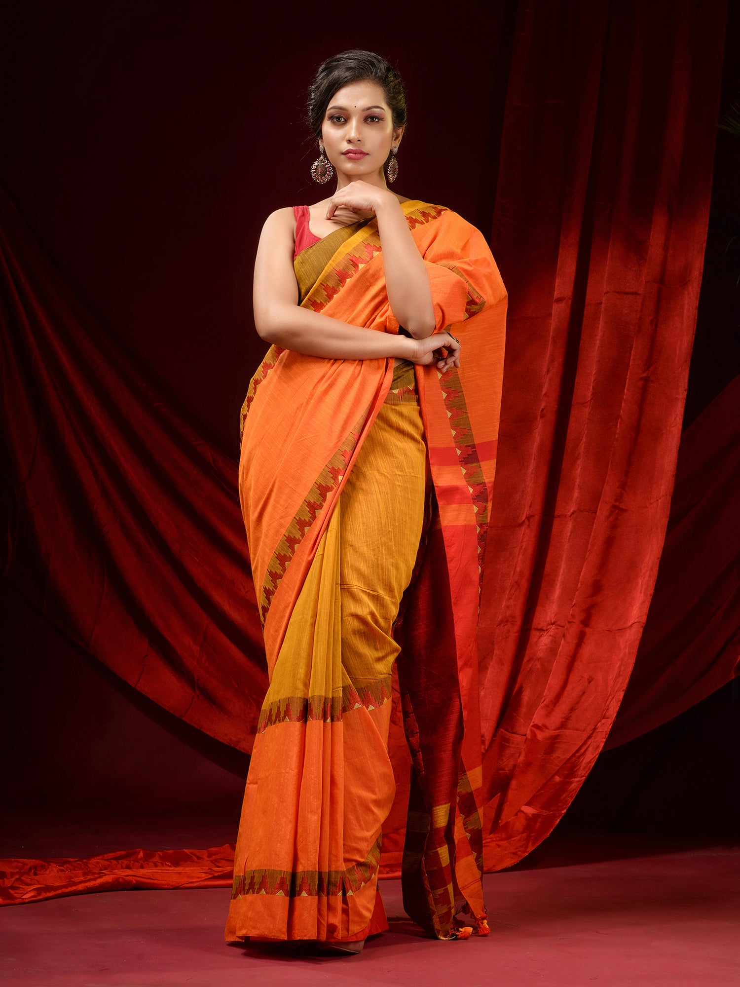 Yellow And Orange Pure Cotton Handwoven Saree With Temple Borders