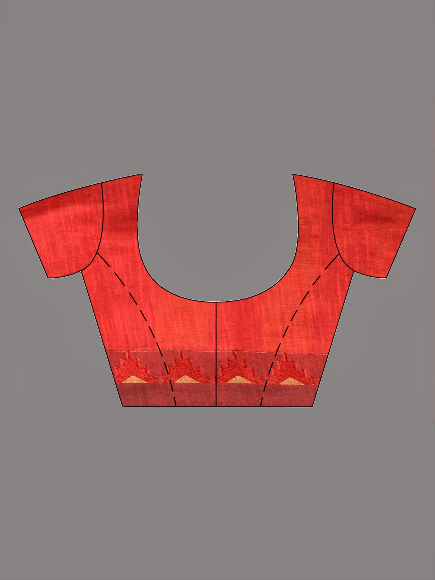 Get the utmost graceful look in this yellow and orange pure cotton handwoven saree. The colours are paired horizontally throughout the length and the borders have temple patterns. The pallu is in rust and orange to complete the look.