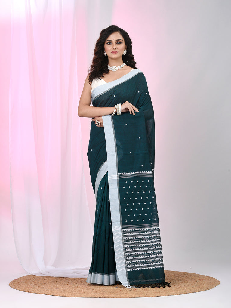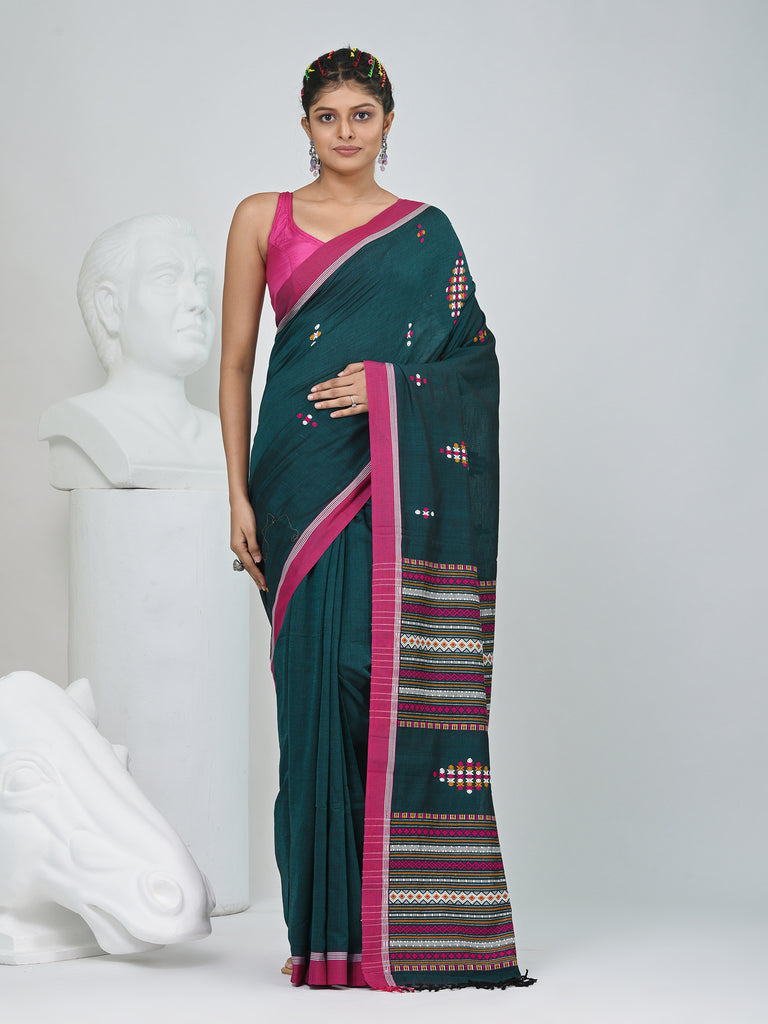 Elegant Teal Cotton Saree with Red Border & Woven Motifs