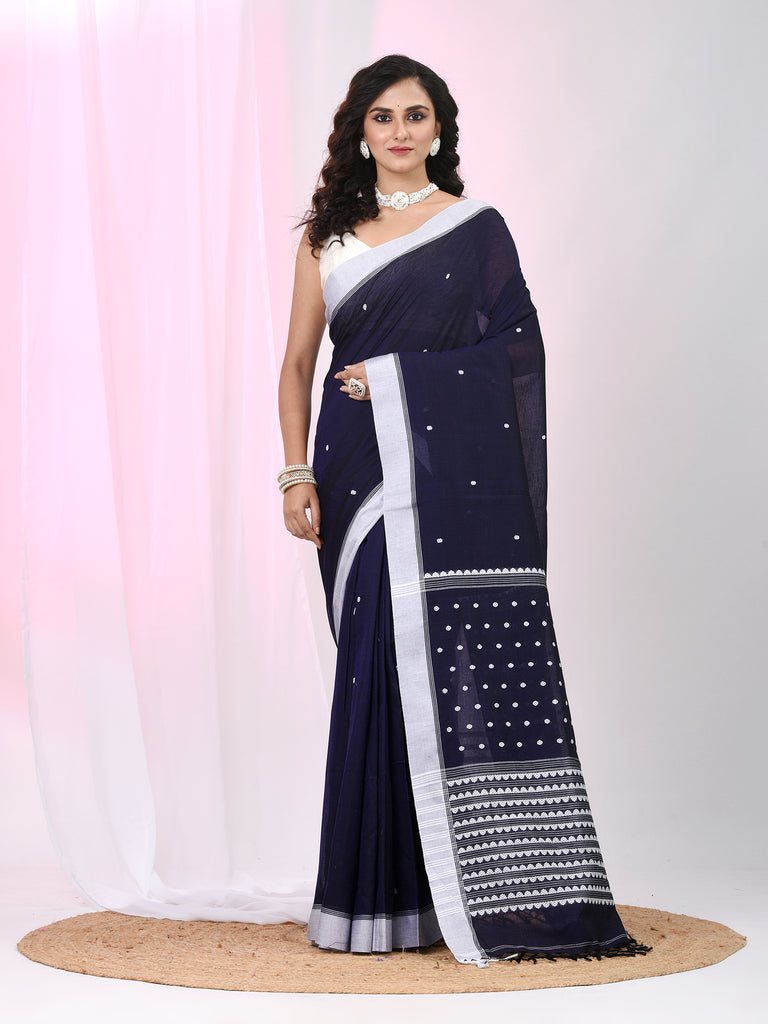 Sapphire Blue Cotton Saree with White Border and Woven Patterns