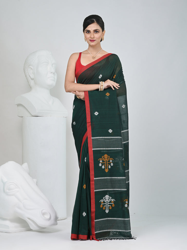 Green Handwoven Cotton Saree with Red Border And Traditional Motifs