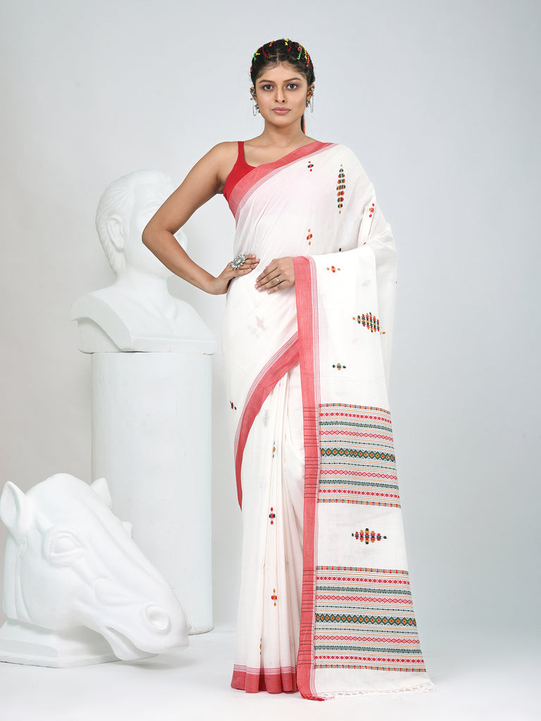 Elegant Off White Cotton Saree with Red Border & Woven Motifs