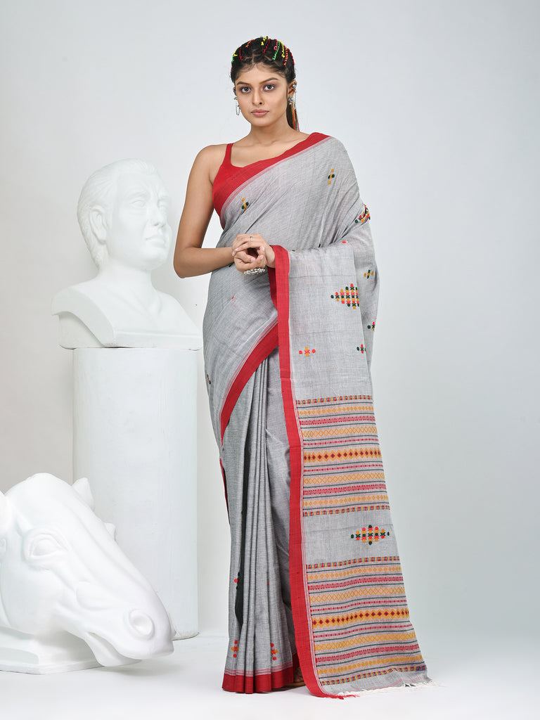 Grey Handwoven Cotton Saree with Red Border And Traditional Motifs