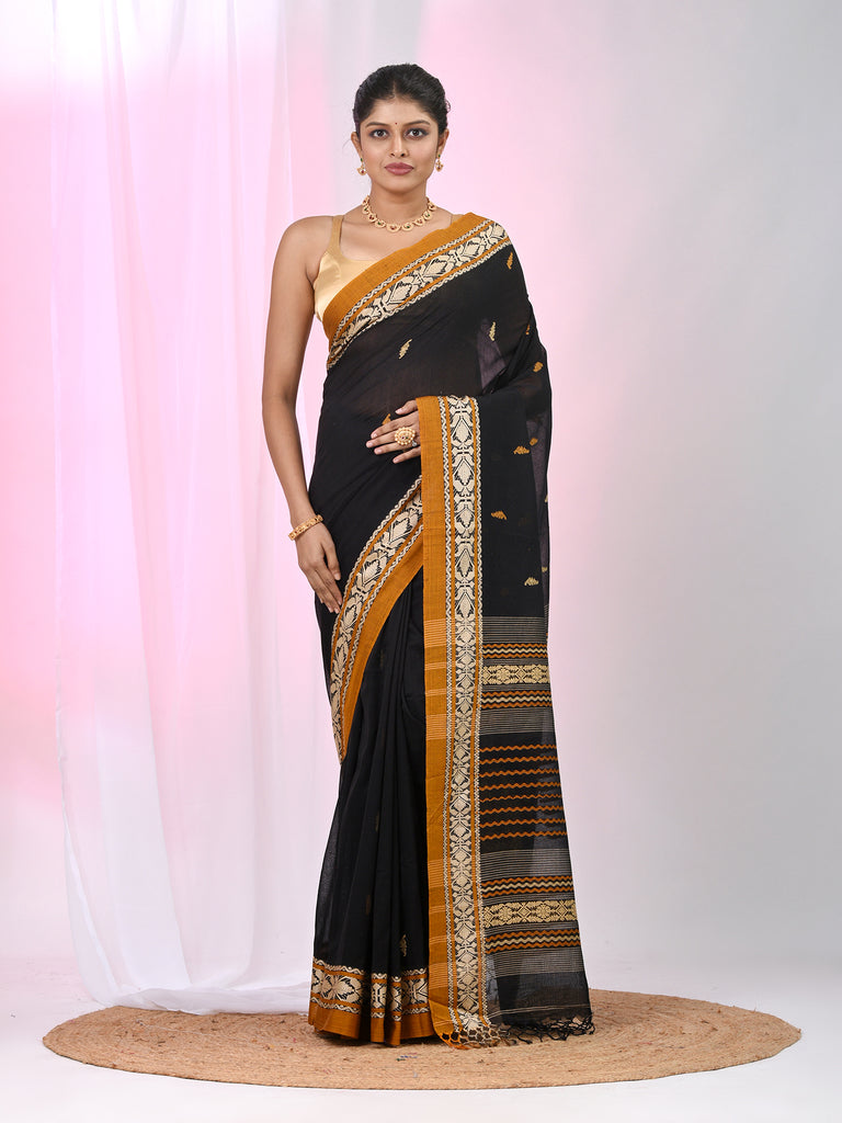 Classic Black & Mustard Handwoven Tant Cotton Saree with Texture Motifs