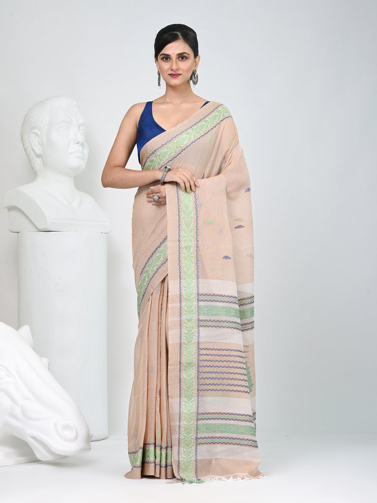 Elegant Beige & Red Handwoven Tant Cotton Saree with Traditional Motifs