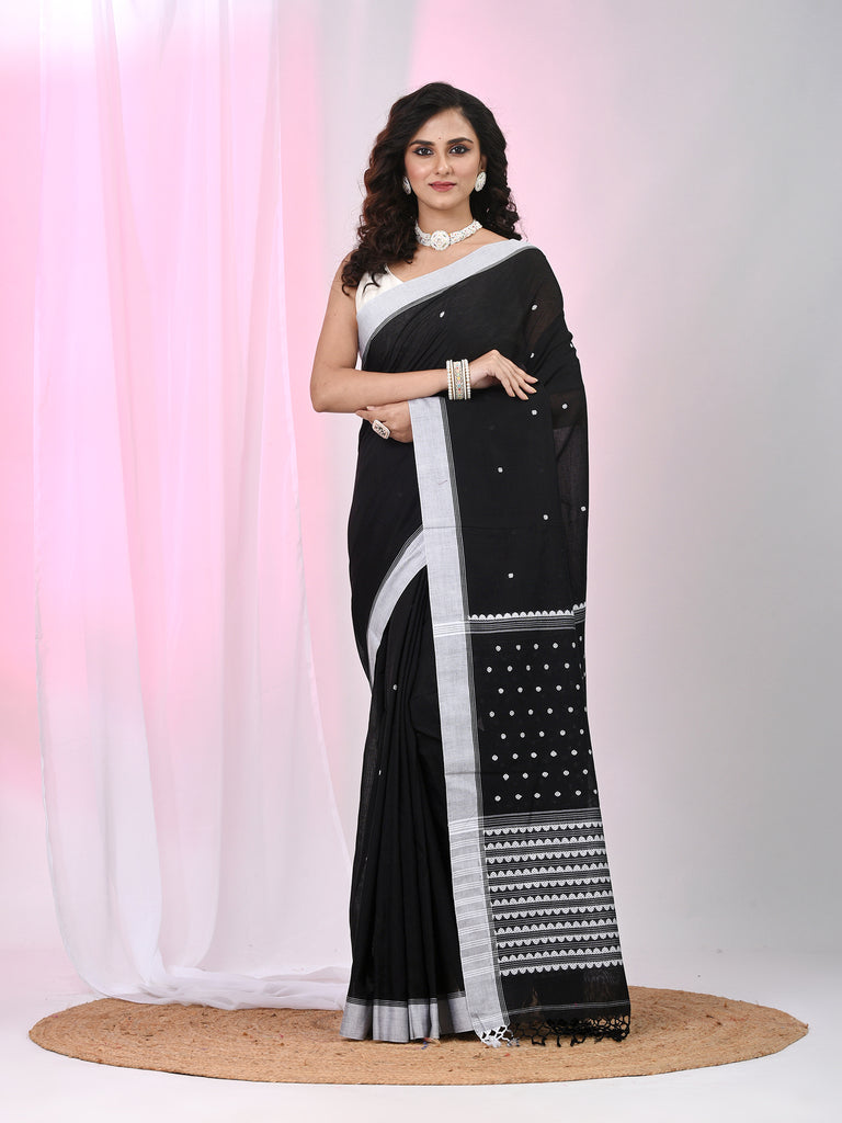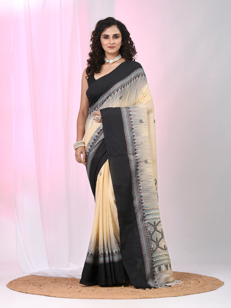 Black Cotton Saree with Beige Border And Traditional Woven Pallu
