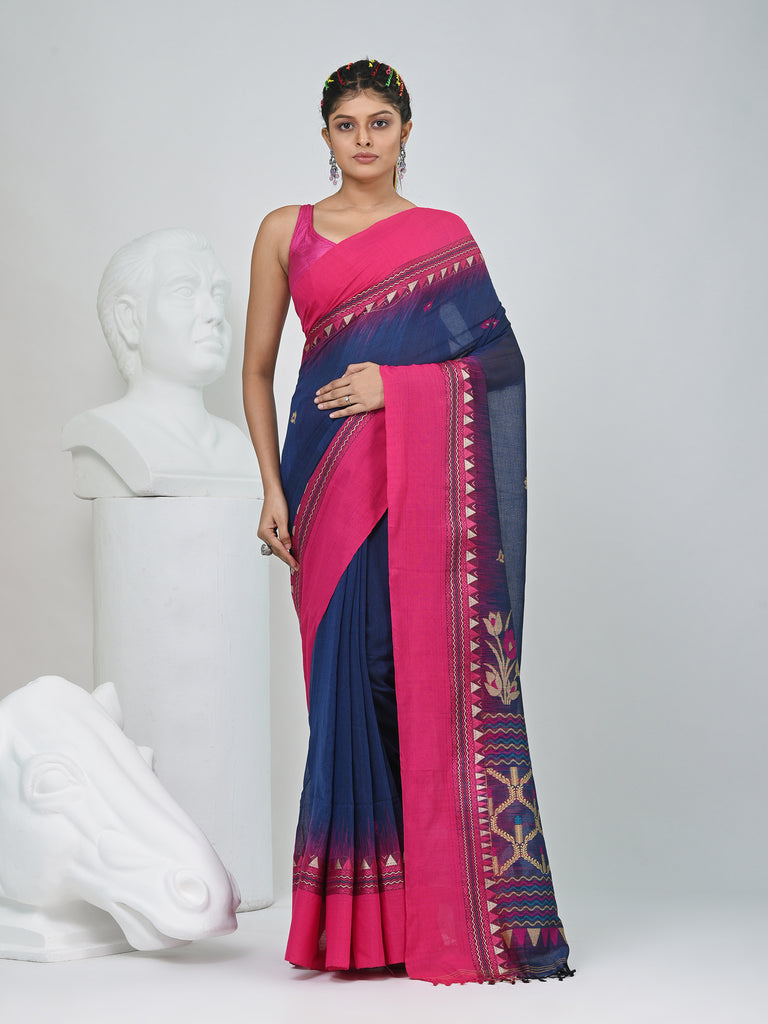 Navy Blue And Pink Cotton Saree with Traditional Woven Border
