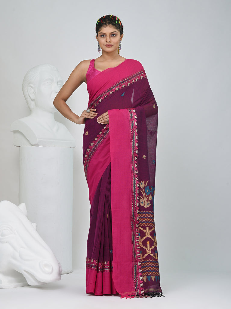 Magenta And Pink Cotton Saree with Traditional Woven Border