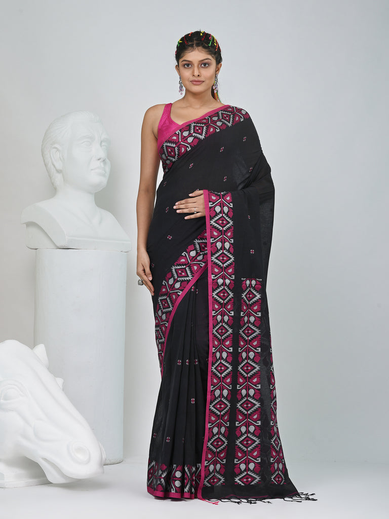 Elegant Black Cotton Saree with Geometric Floral Borders