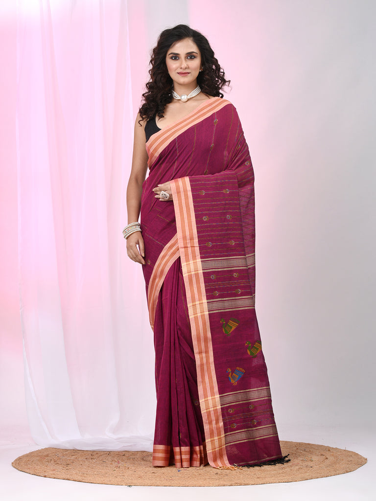 Fuchsia Cotton Saree with Beige Border & Bird Motif Design