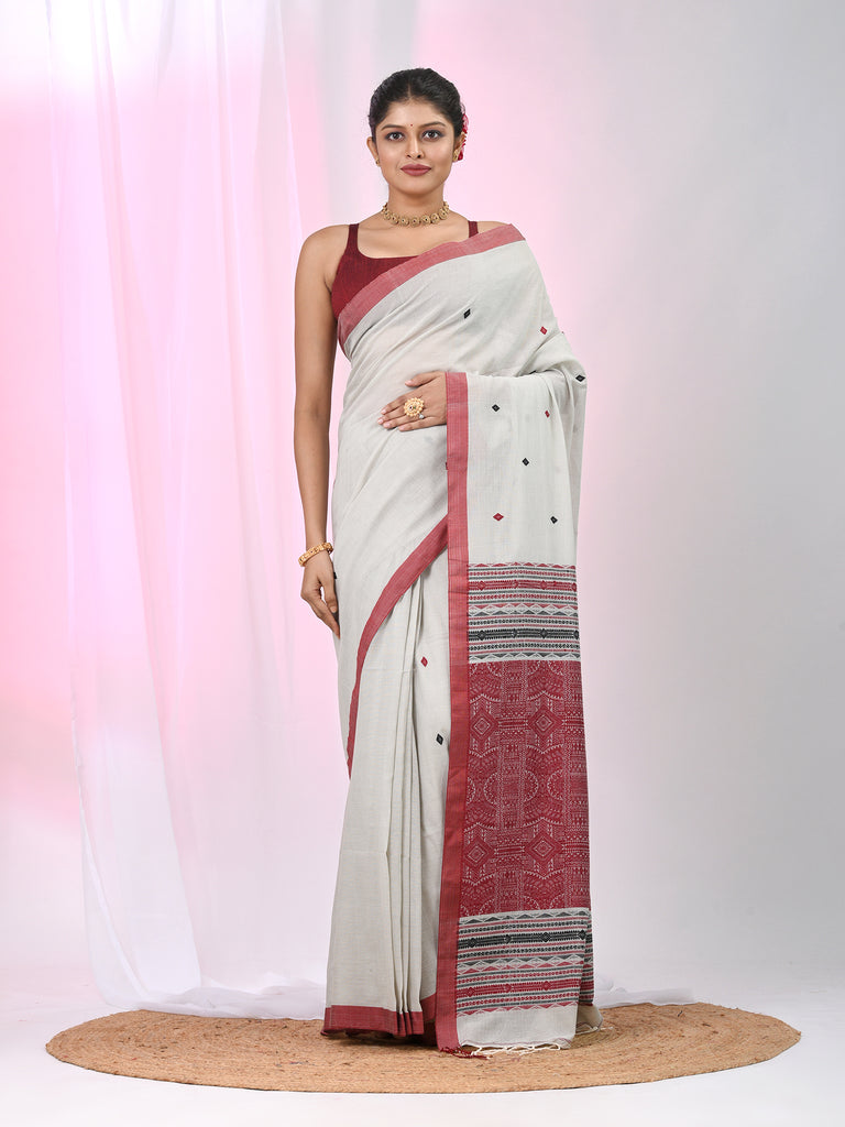 Elegant White Cotton Saree with Red and Green Diamond Motifs