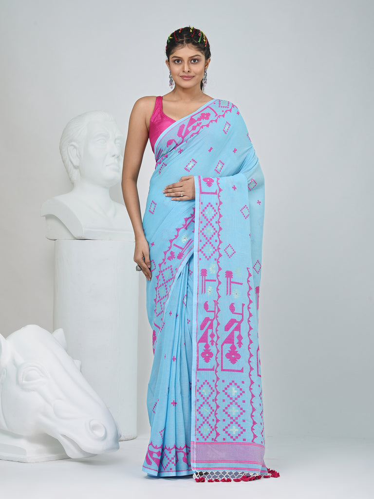 Sky Blue Cotton Saree with Traditional Woven Patterns and Tassel Border