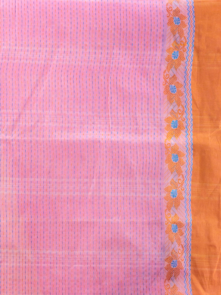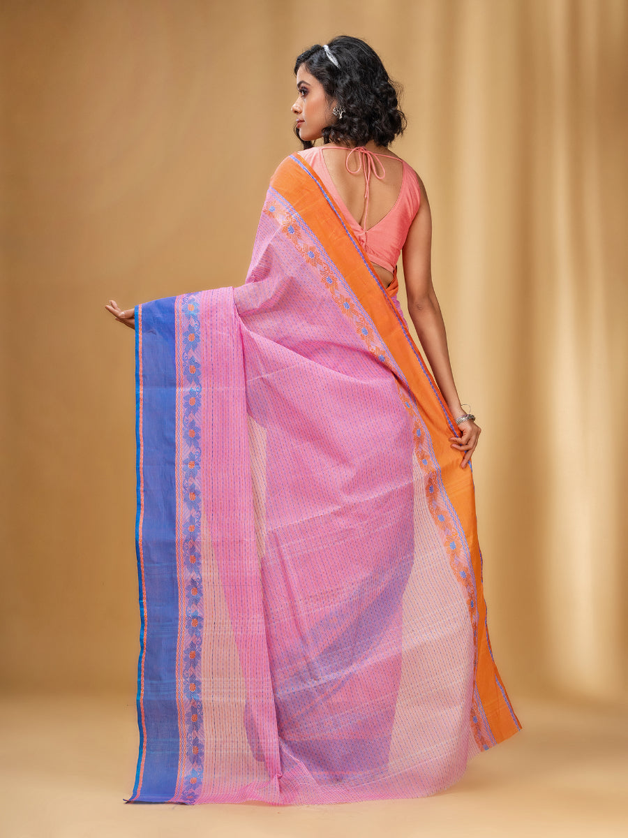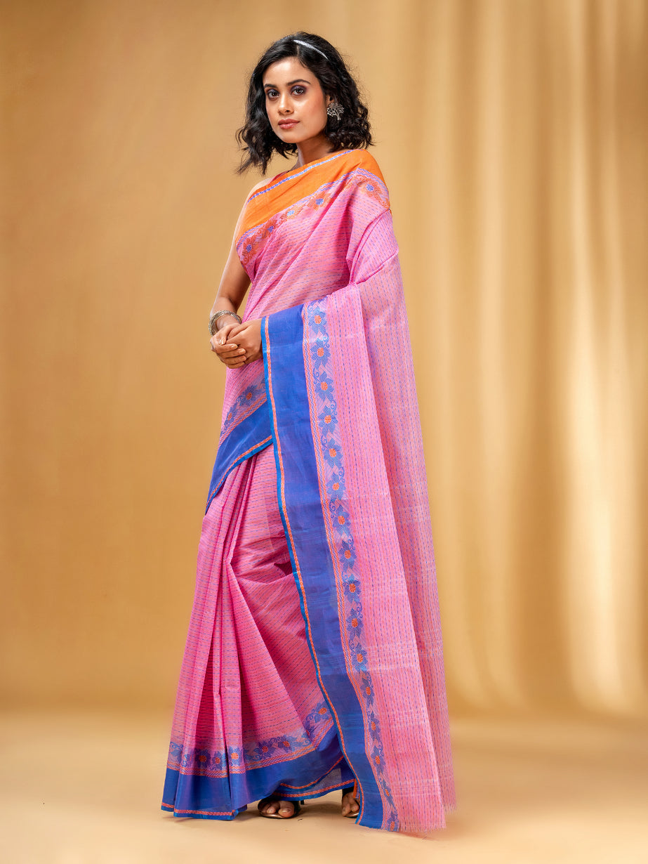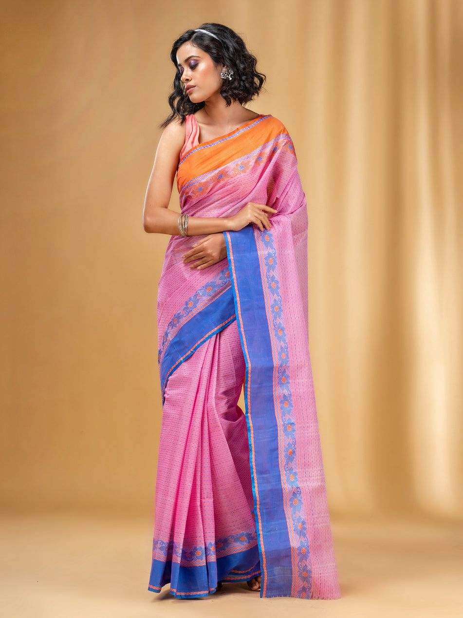 Get a poised and dainty look in this pink pure cotton taant saree. It has weave pattern all over the saree along with pallu. The dual borders have orange and blue on either side with fioral motifs along with length. The pallu is also highlighted with stripe pattern to compliment the look beautifully.