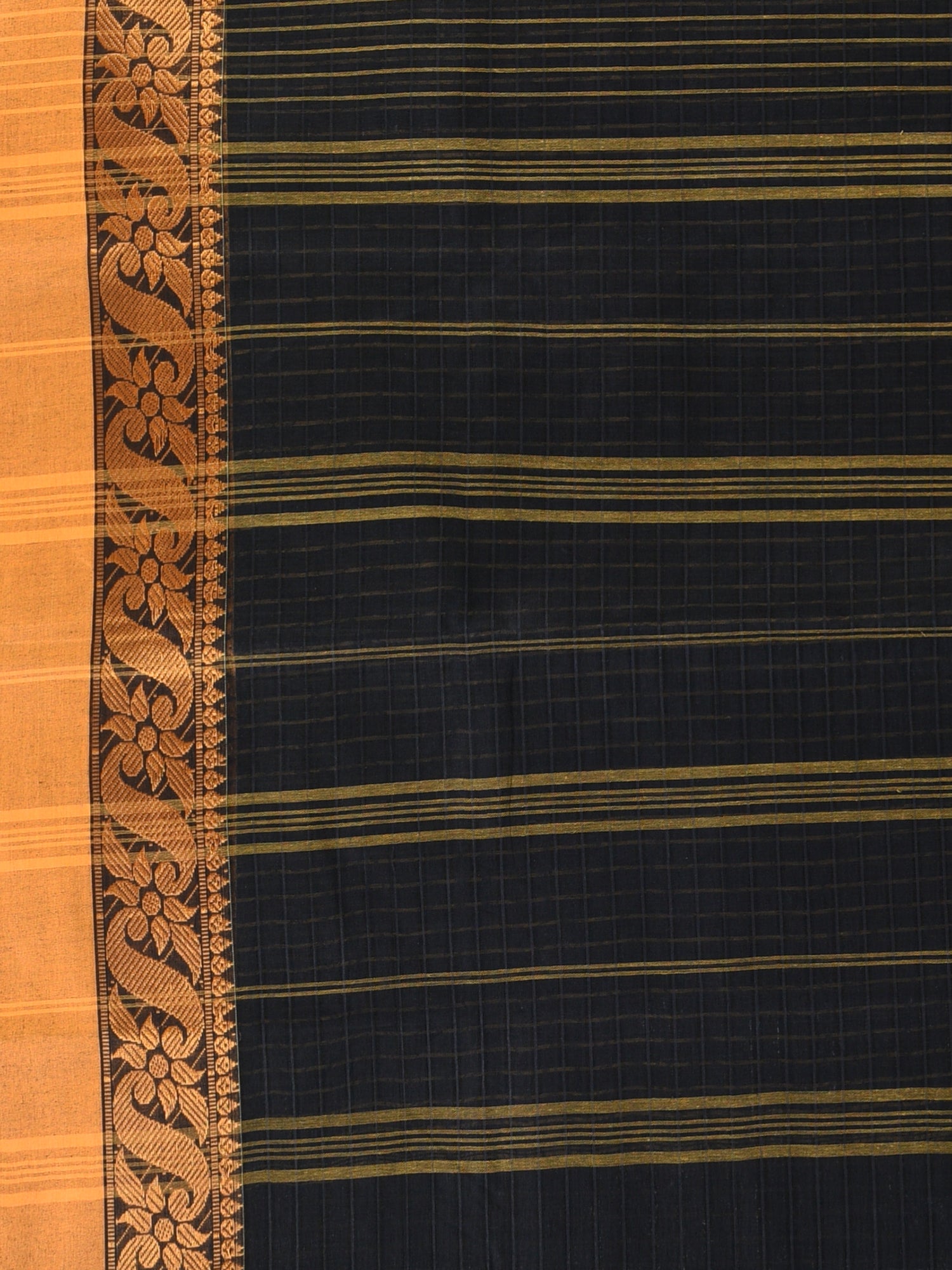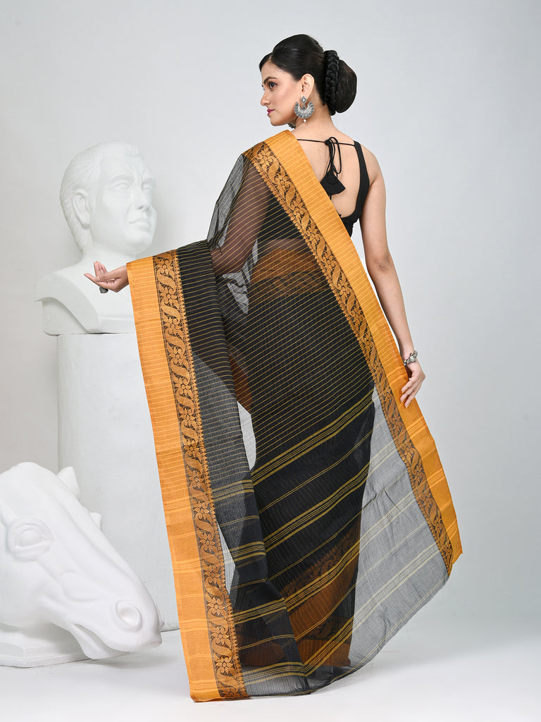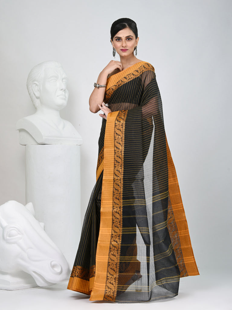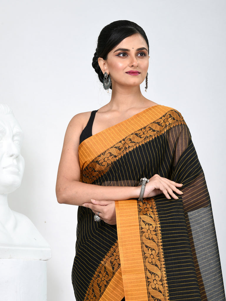 Classic Black and Mustard Striped Tant Saree with Intricate Borders
