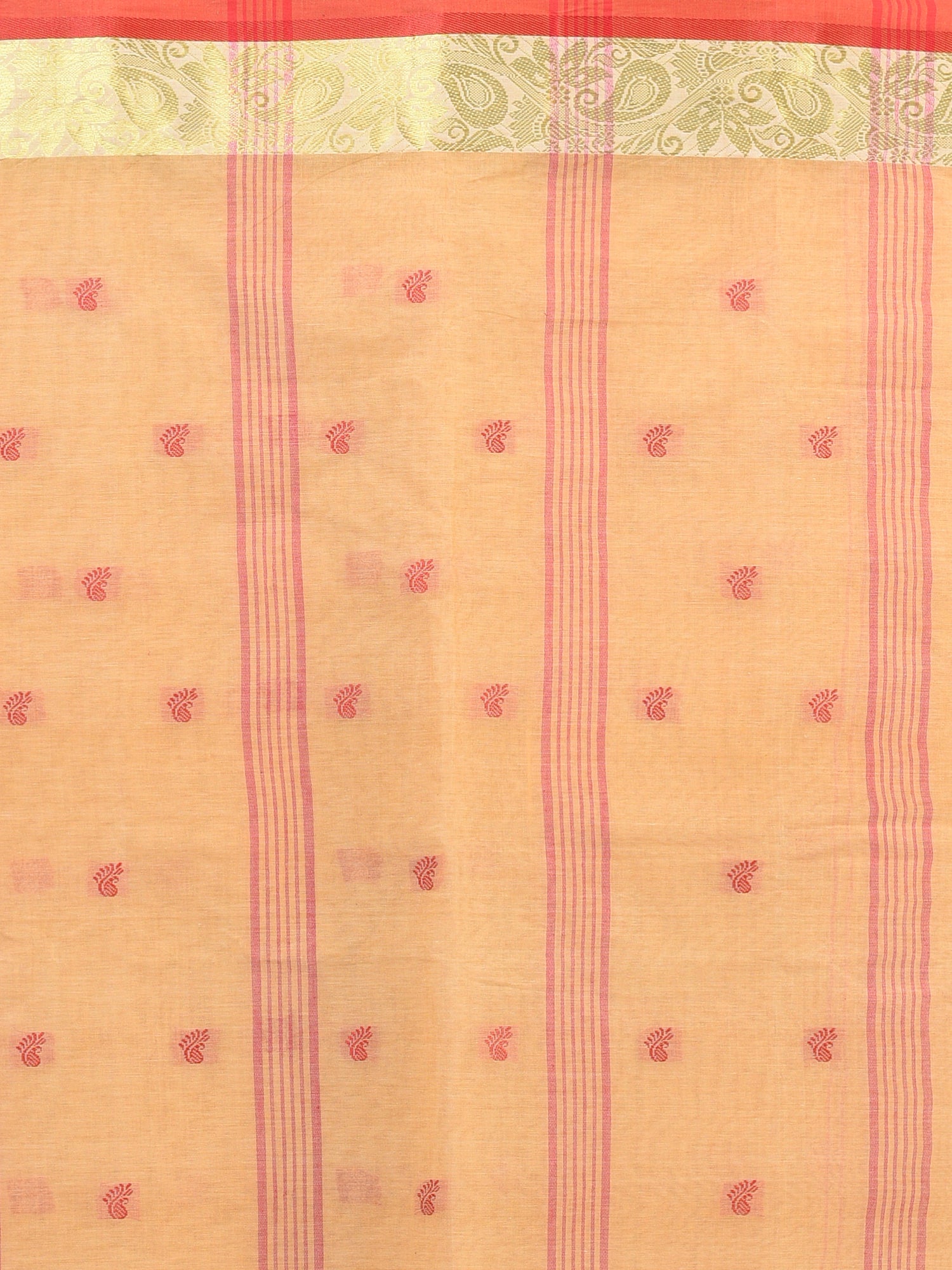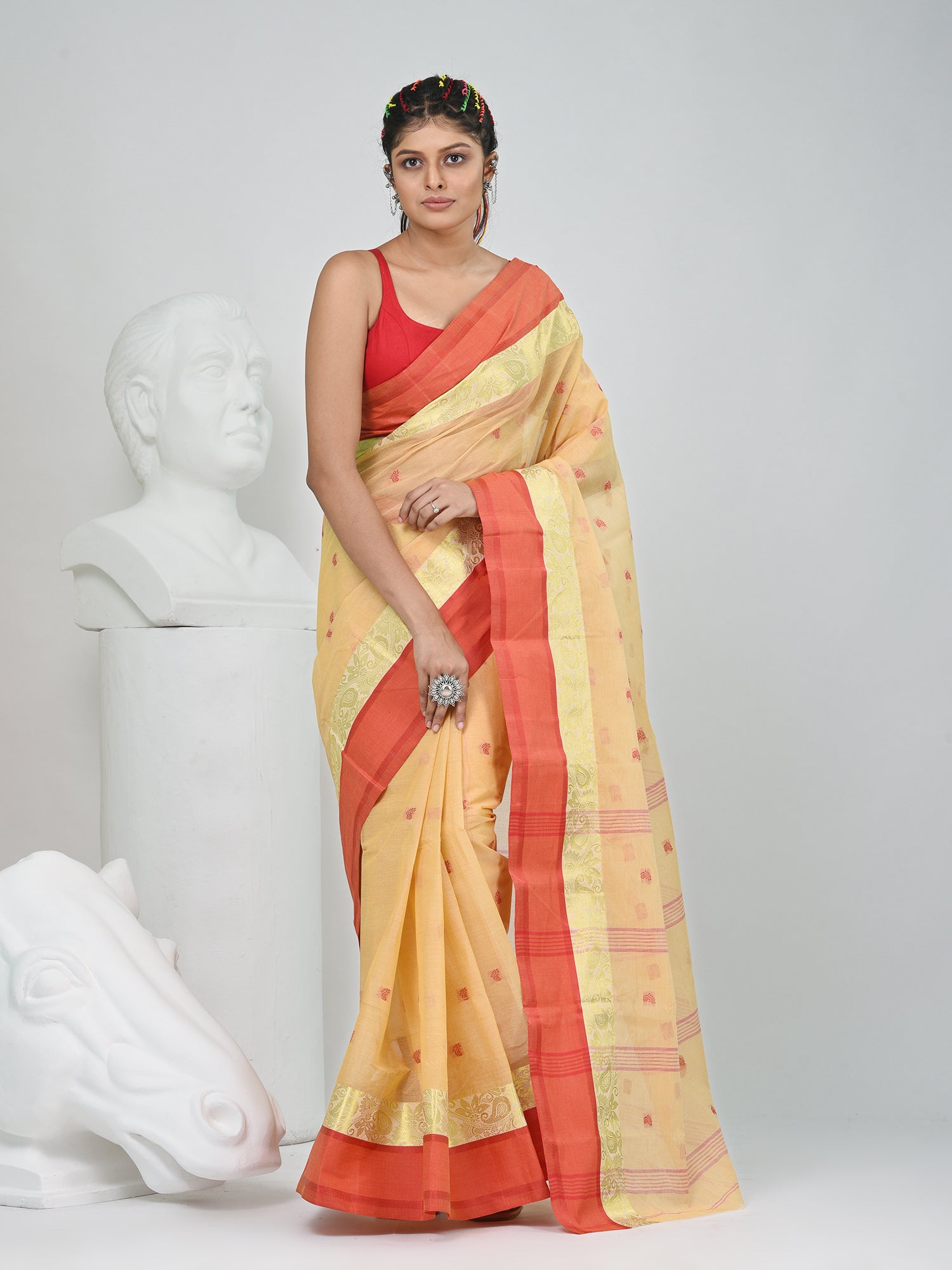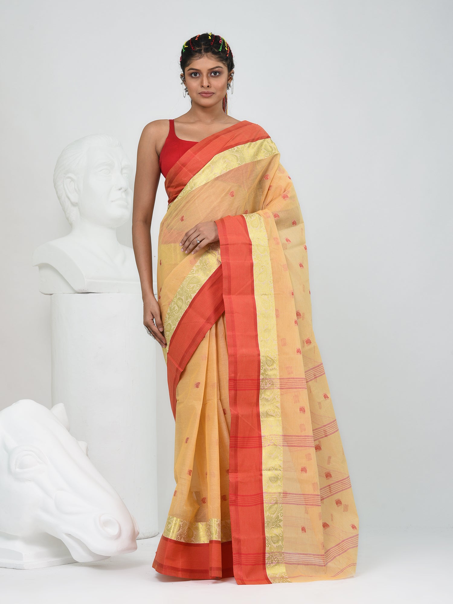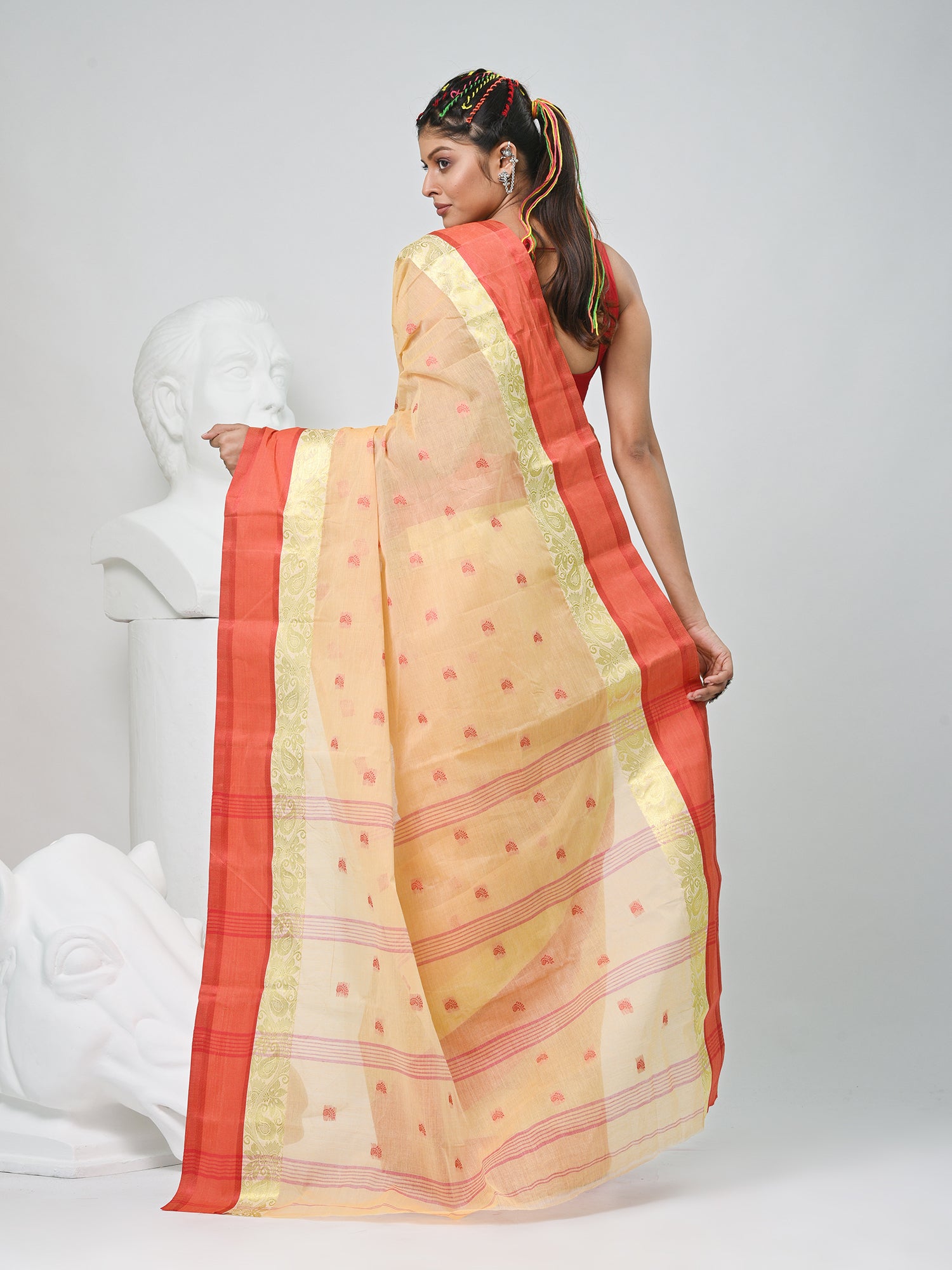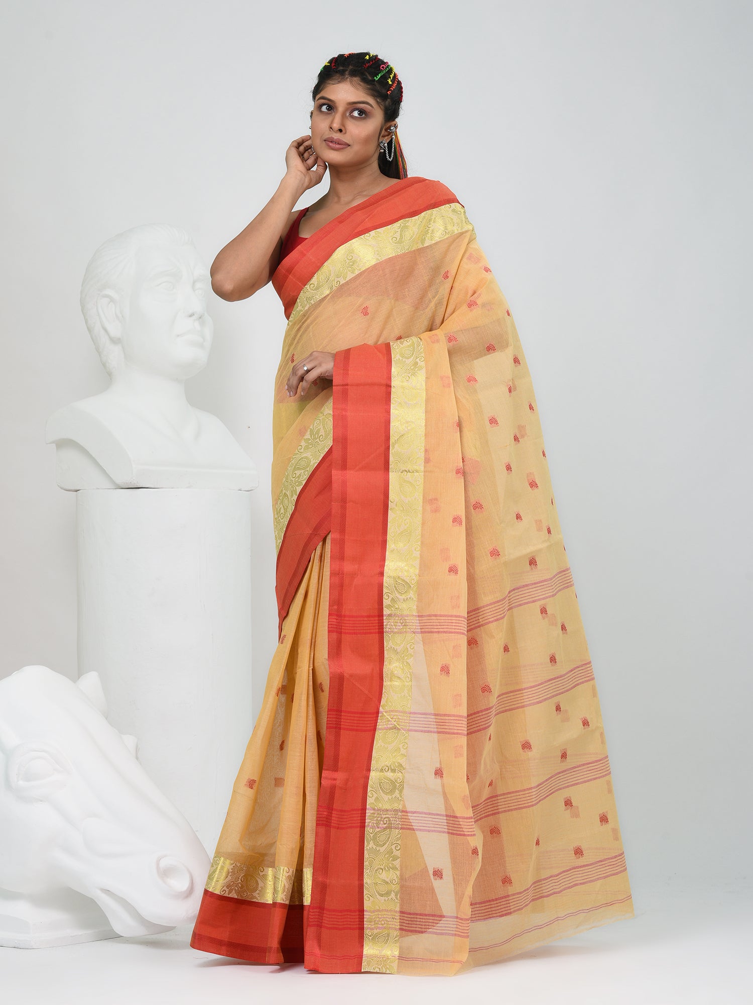 Embrace timeless elegance with this beautifully crafted Beige Tant Saree. Featuring a bold red border with intricate gold accents, this saree blends traditional charm with modern aesthetics. The lightweight cotton fabric offers comfort and ease, making it perfect for a variety of occasions, from festive celebrations to casual gatherings. The delicate gold motifs on the border add a touch of sophistication, while the overall design exudes grace and poise. Pair it with your favorite jewelry for a chic, classic look.