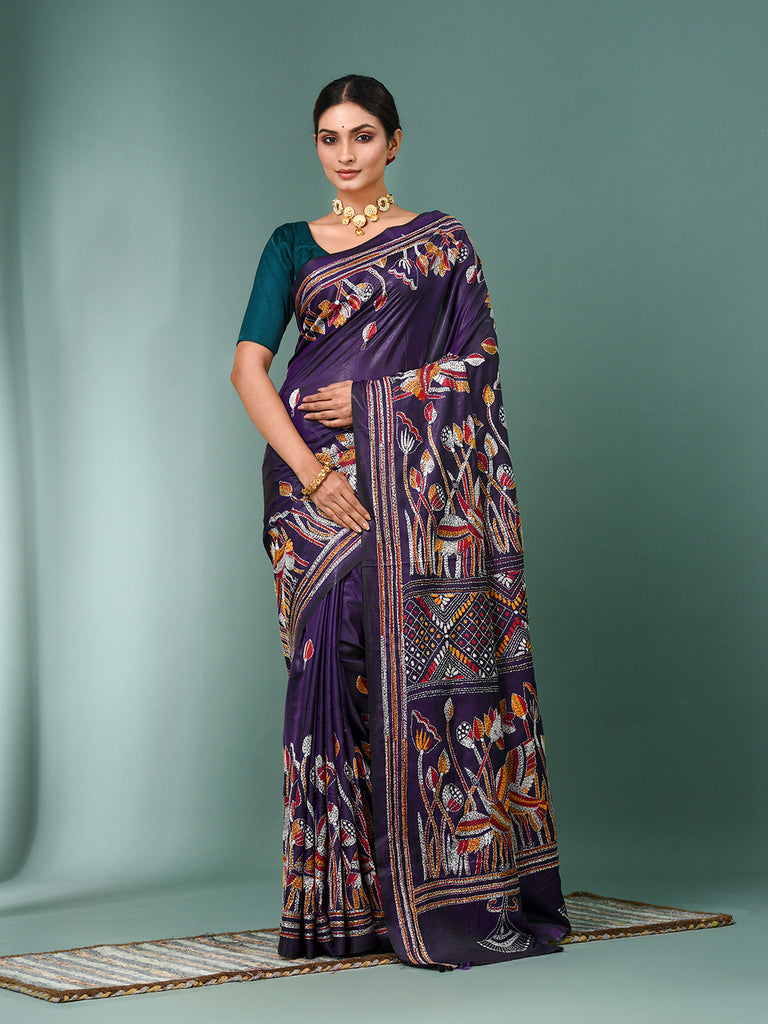 Purple Ethnic Motifs Katan Silk Saree With Zari Borders