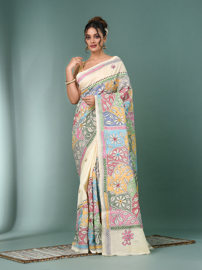 Off White Kantha Stitch Bangalore Silk Soft Saree