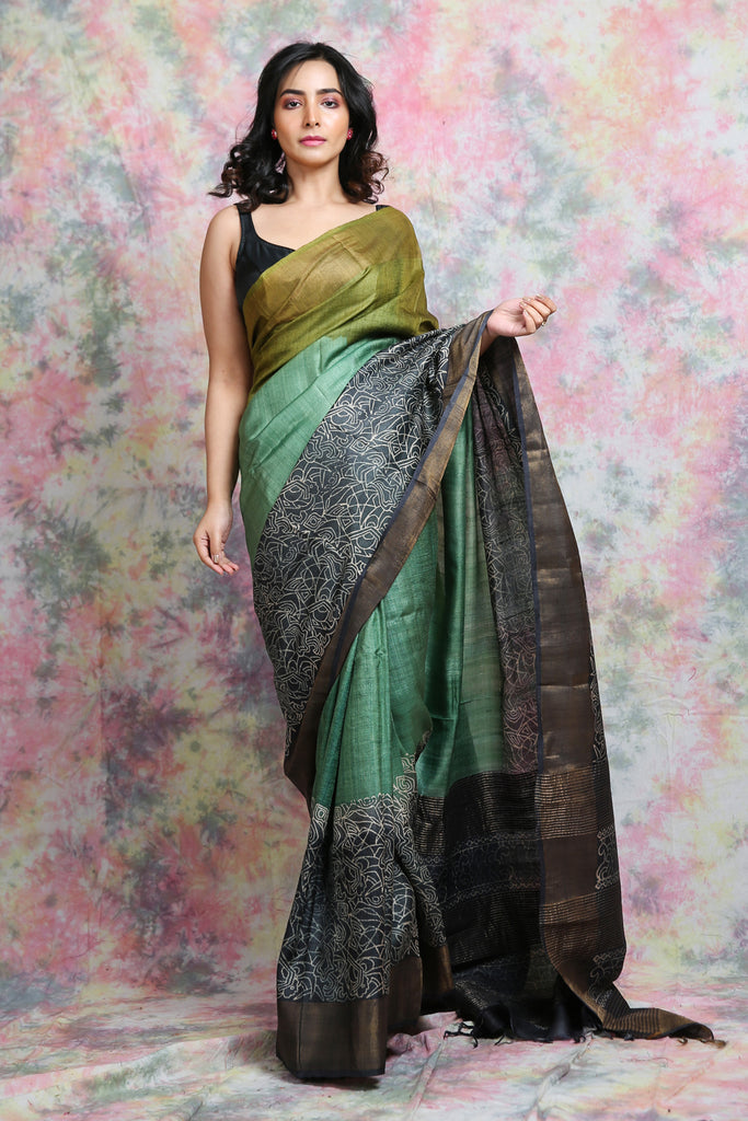Olive Green & Black Pure Silk Saree with Intricate Woven Pallu