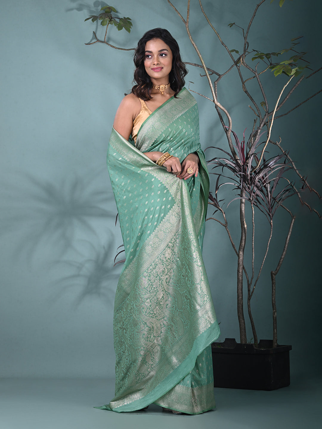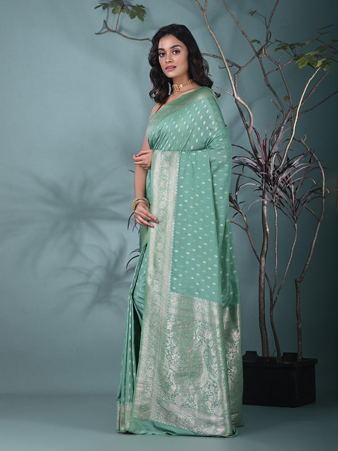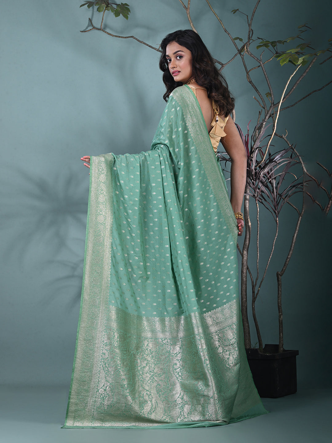 Elevate your elegance with this exquisite Sea Green Georgette Saree, designed for every special occasion. The soft, flowing georgette fabric ensures a comfortable and flattering drape, while the subtle sea green hue adds a touch of grace. The saree is beautifully enhanced with intricate silver zari work along the borders, creating a stunning contrast that adds sophistication and charm. This saree comes with a matching blouse piece, making it a complete ensemble for your next festive or wedding event. Perfect for traditional celebrations, receptions, or upscale gatherings, this saree exudes timeless beauty and understated luxury.