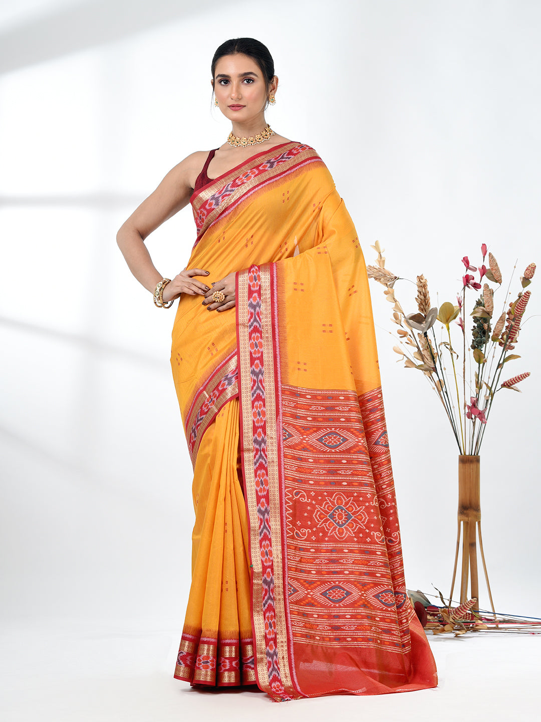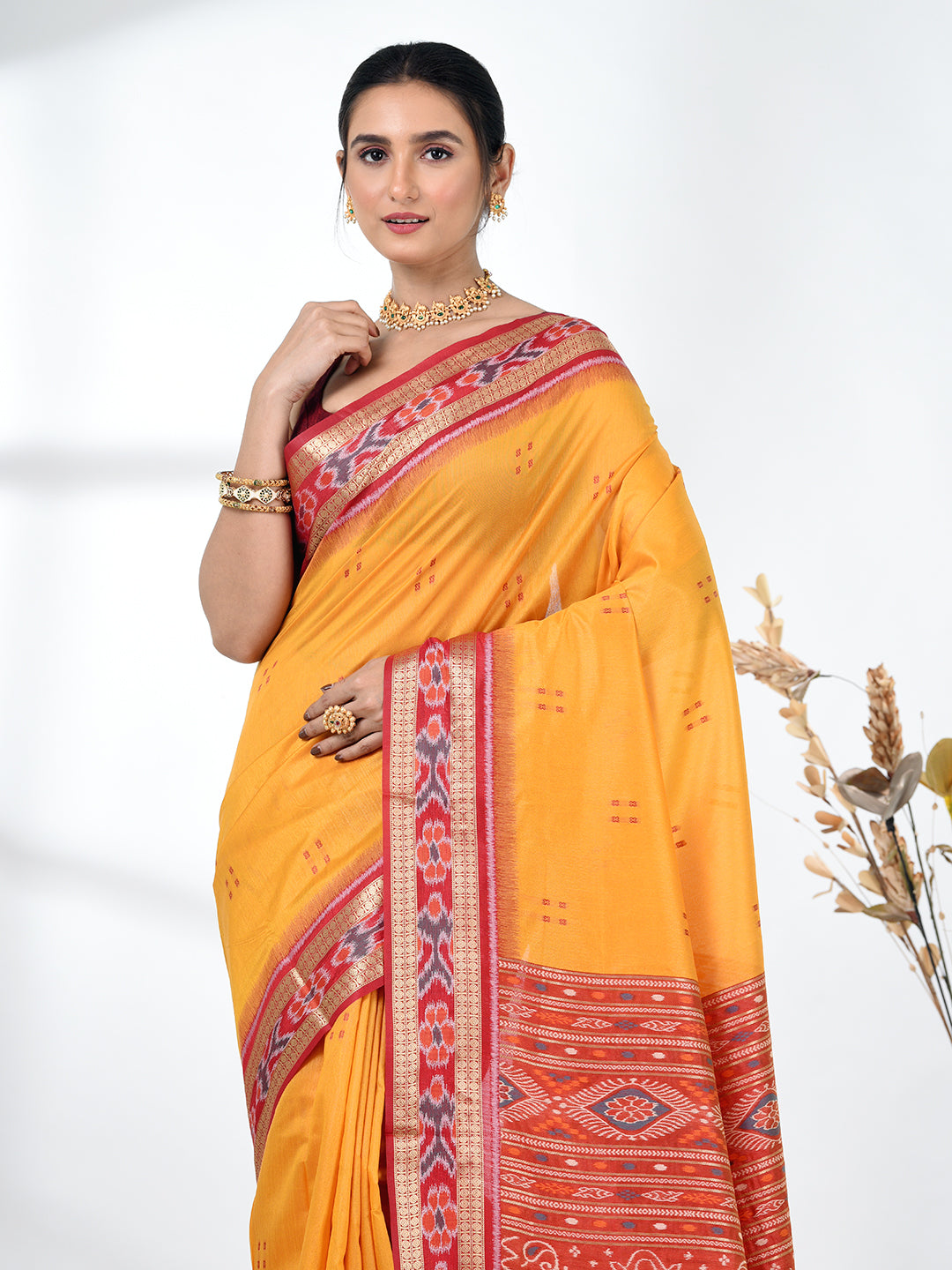 Elegant Yellow Tussar Silk Saree with Sambhal Puri Ikat Border