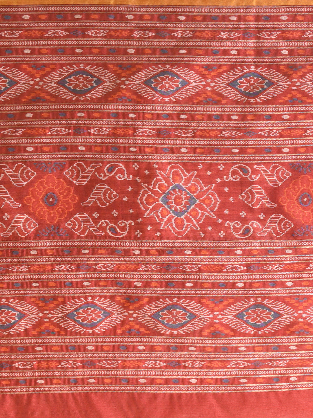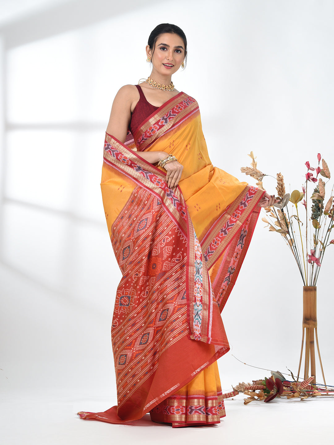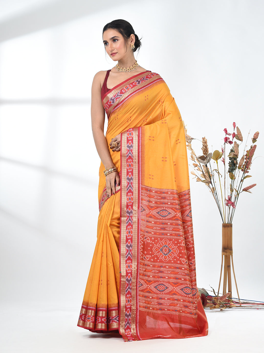 Add a touch of traditional charm to your wardrobe with this beautiful Yellow Tussar Silk Saree. The soft and luxurious Tussar fabric enhances the graceful flow of the saree, making it perfect for festive occasions or cultural celebrations. The rich yellow color is complemented by an intricately woven Sambhal Puri Ikat border, featuring vibrant patterns in hues of different colors, creating a stunning contrast. This saree offers a blend of heritage and elegance, with the unique ikat motifs adding a modern twist. The golden zari accent along the border adds a regal touch, making it an ideal choice for weddings, parties, and special gatherings.