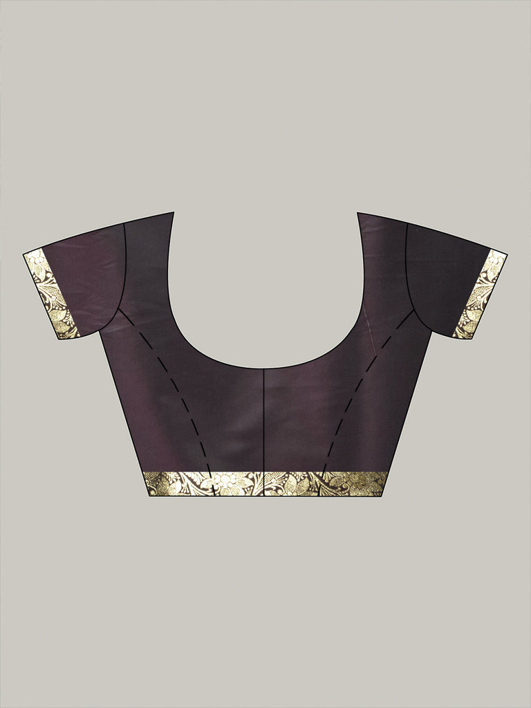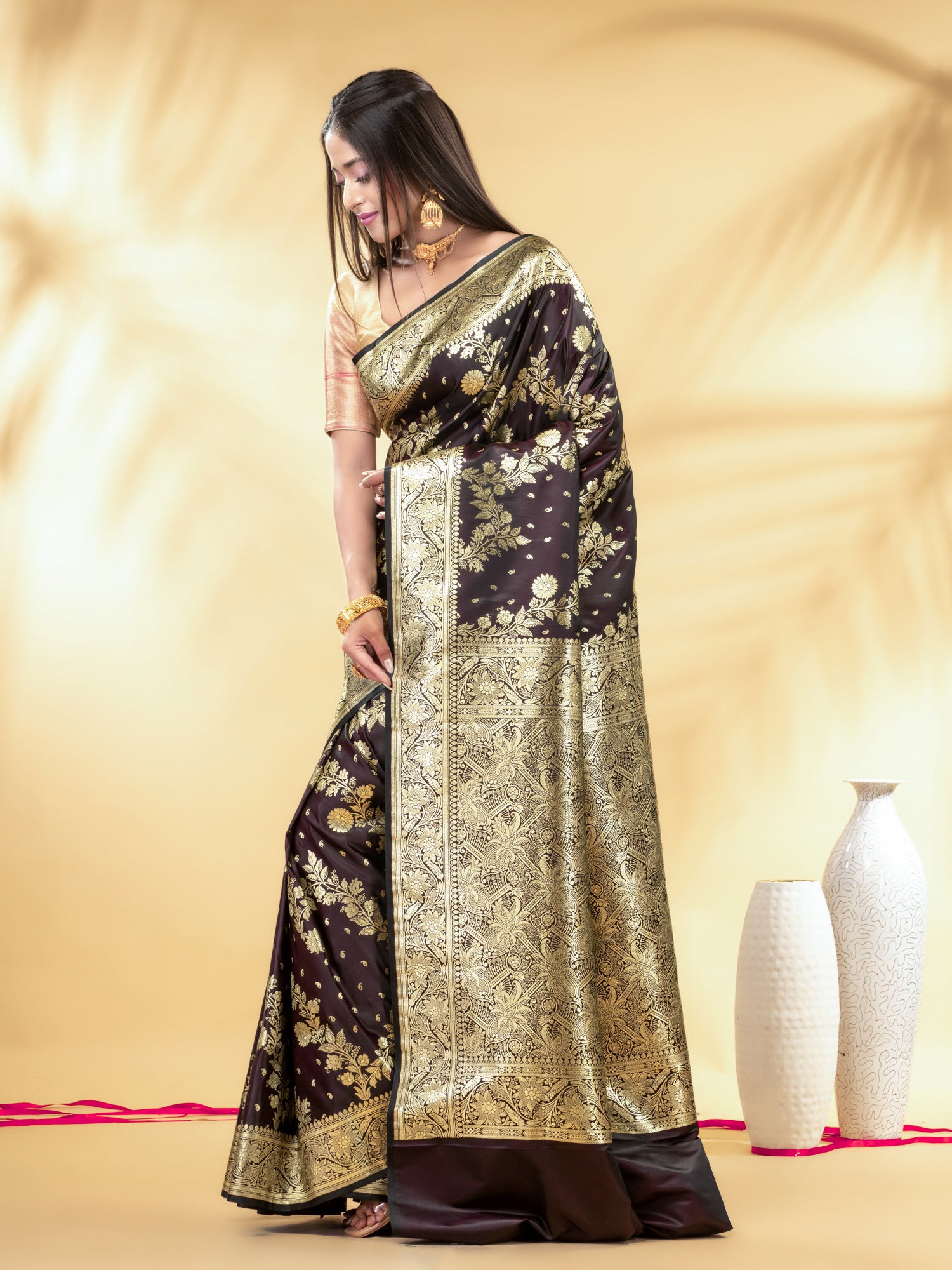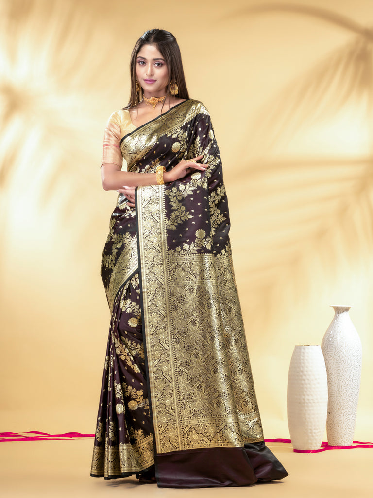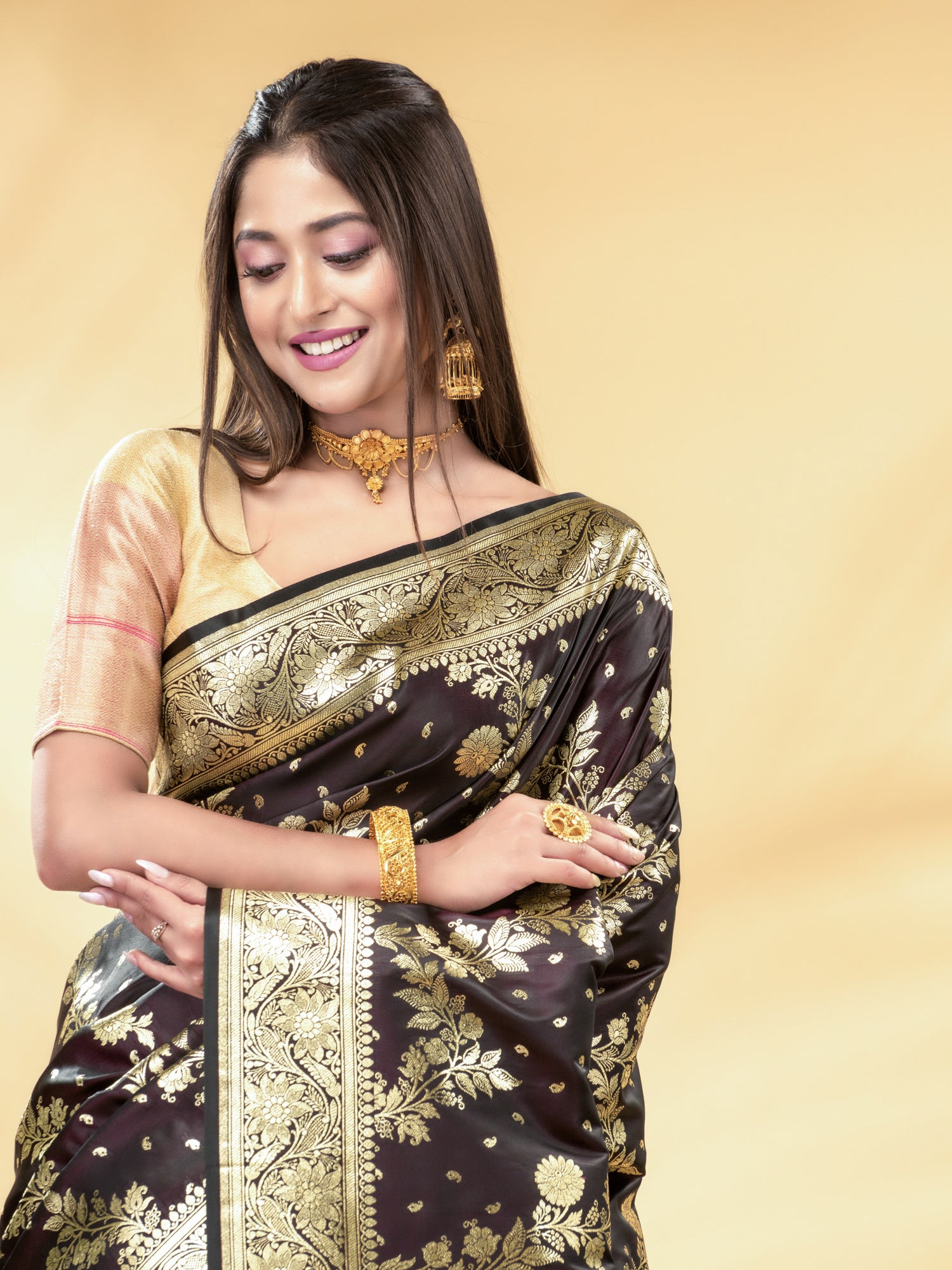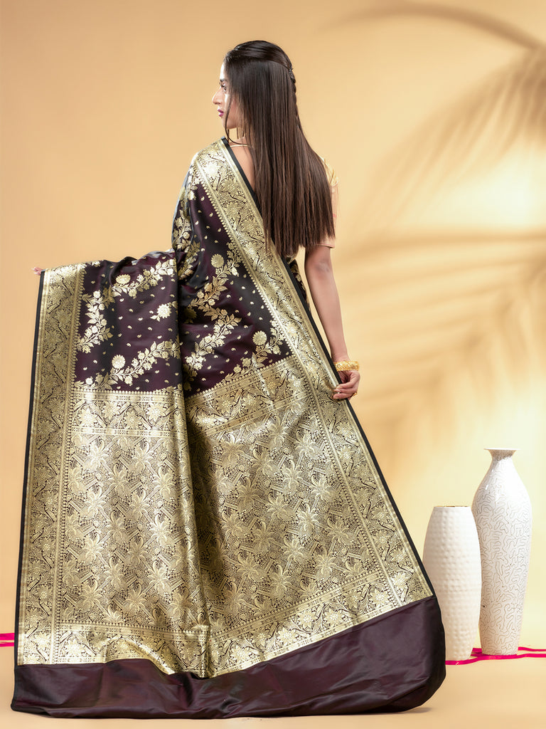 Unleash your inner royalty with this Maroon Dual Tone Katan Banarasi Silk Saree, a show-stopping piece that embodies opulence and grace. Crafted from premium Katan silk, this saree features a luxurious black base enriched with heavy gold zari floral motifs intricately woven across the body, border, and pallu. The highlight of this saree is its grand pallu and border, adorned with dense, detailed Banarasi patterns inspired by Mughal-era artistry—featuring florals, vines, and brocade work. The richness of the silk and the brilliance of the gold zari come together to create a dramatic and elegant look, ideal for weddings, receptions, or formal evening events. Pair this masterpiece with statement gold jewelry for an unforgettable festive or bridal ensemble.