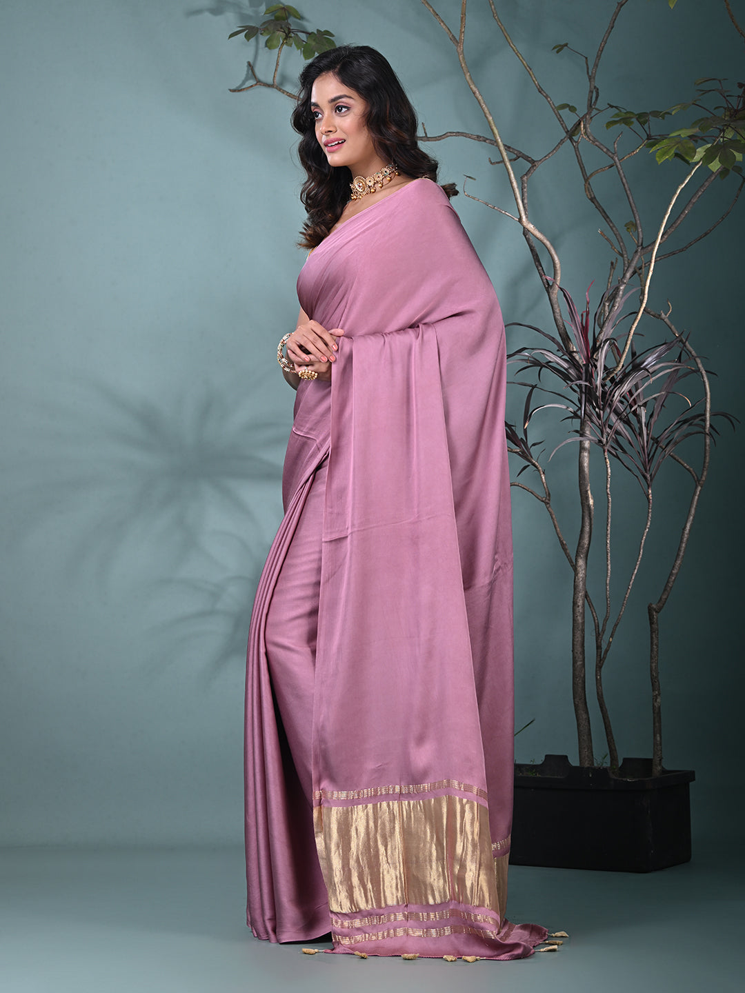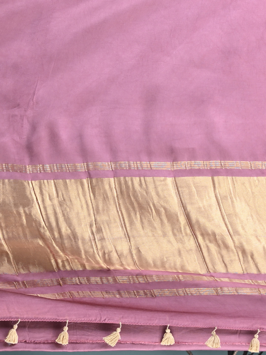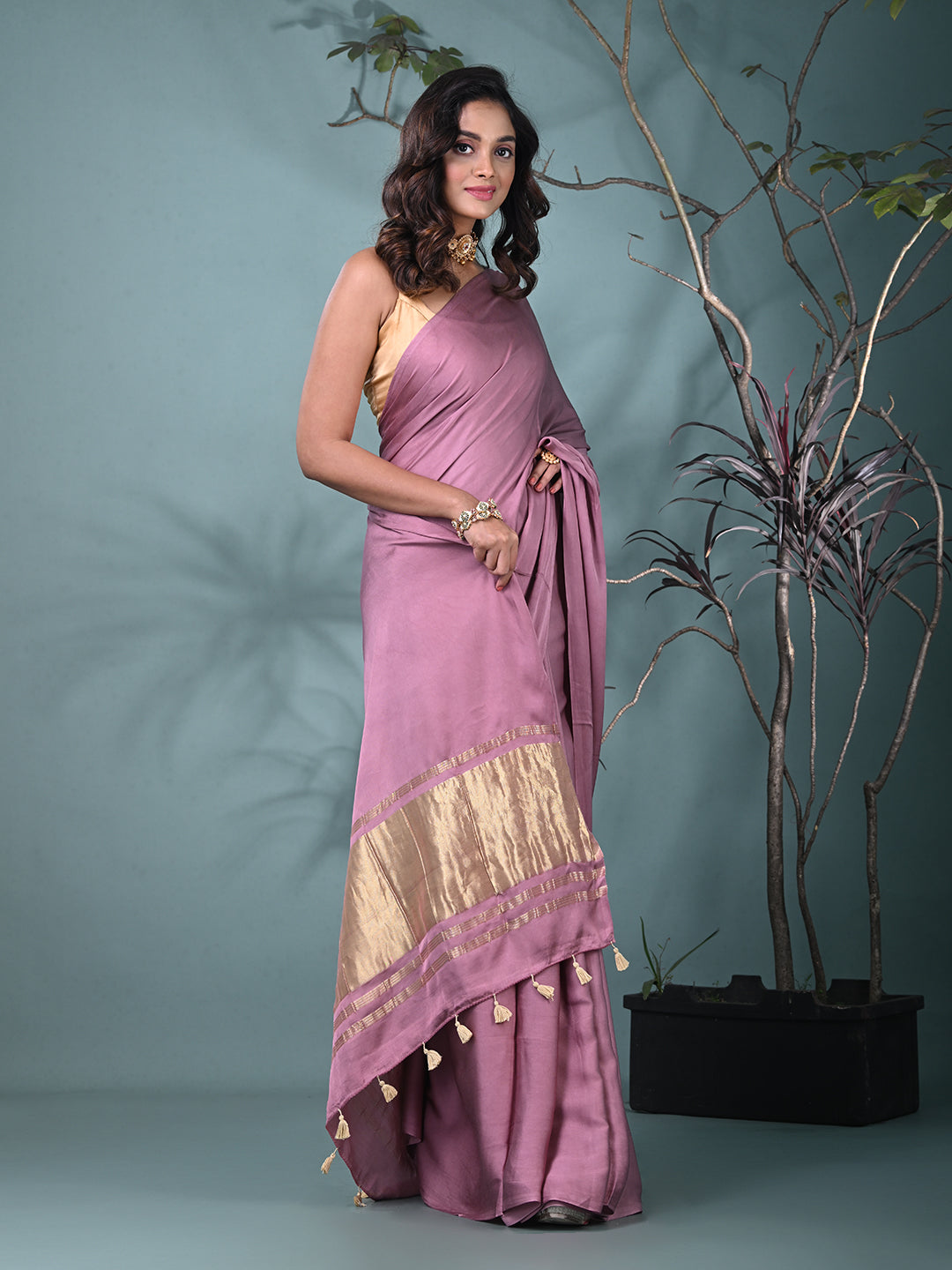 Mauve Modal Silk Saree with Golden Border and Tassels
