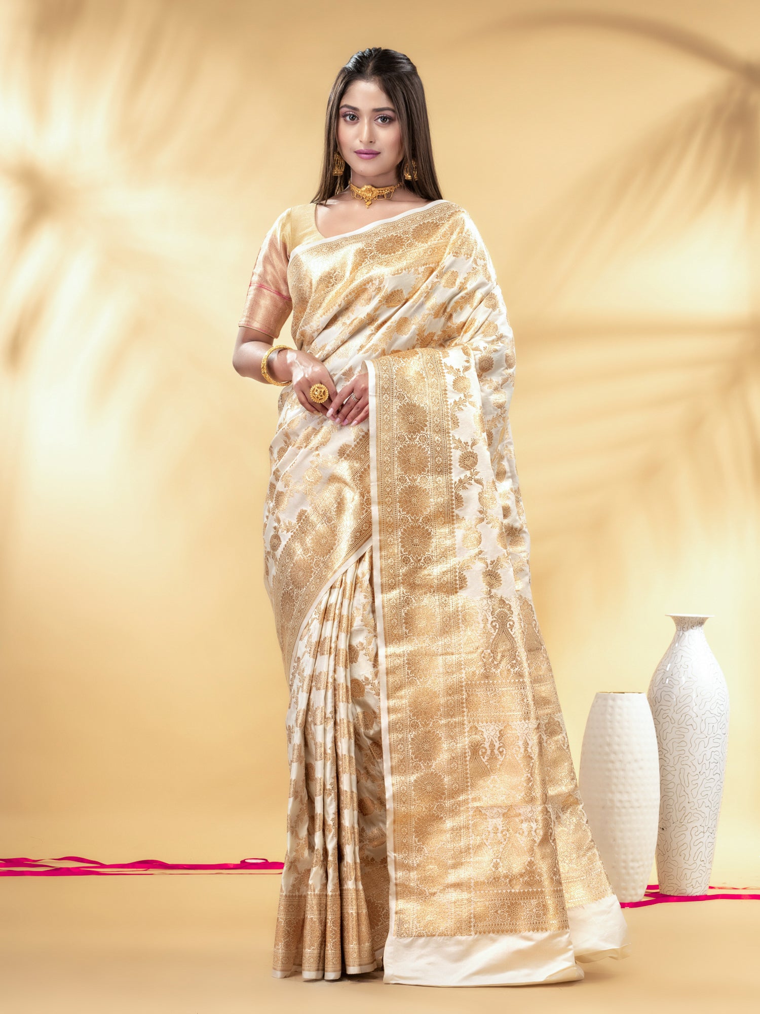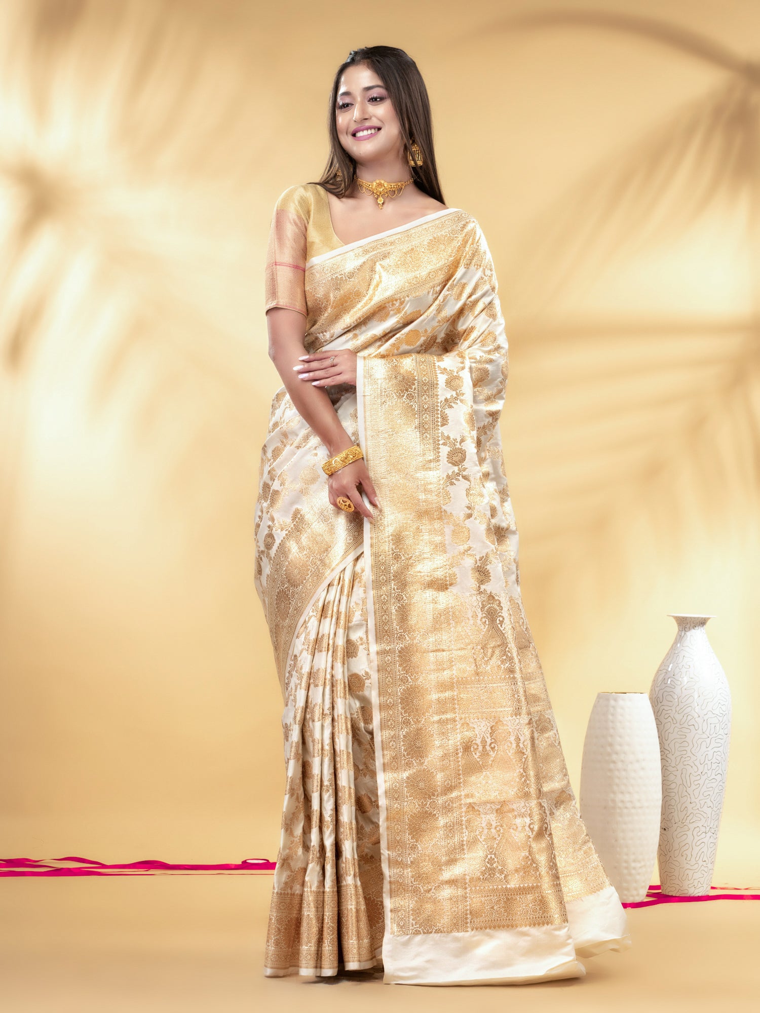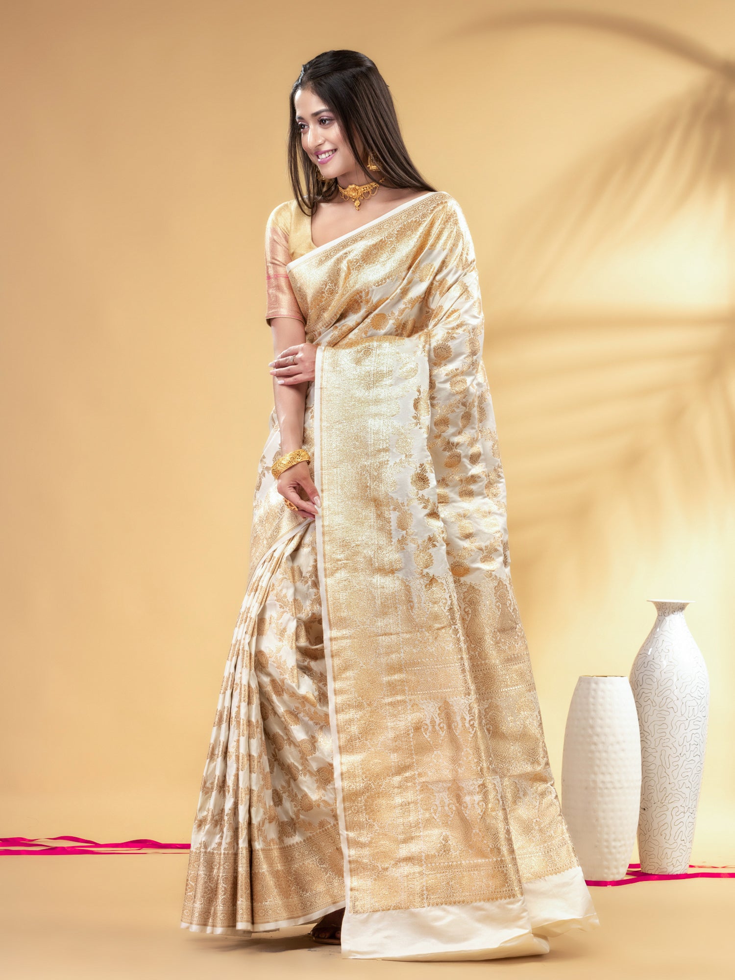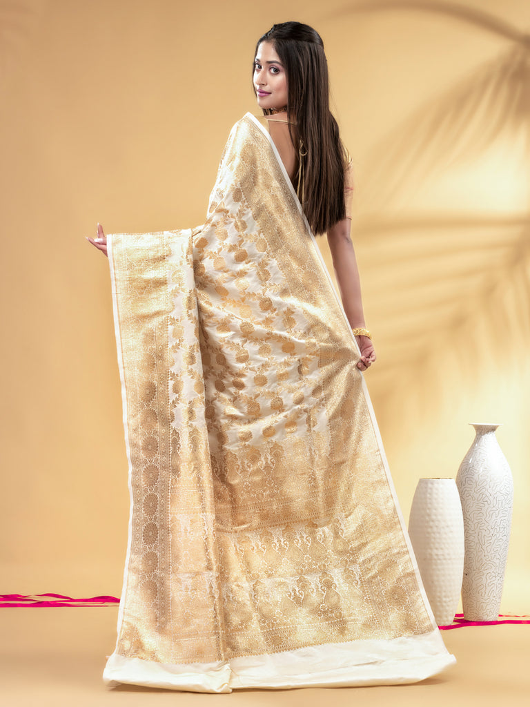 Off White Katan Banarasi Silk Saree with Intricate Golden Zari Weaving