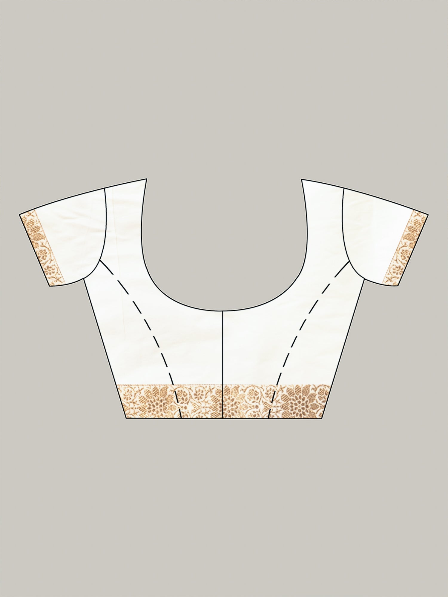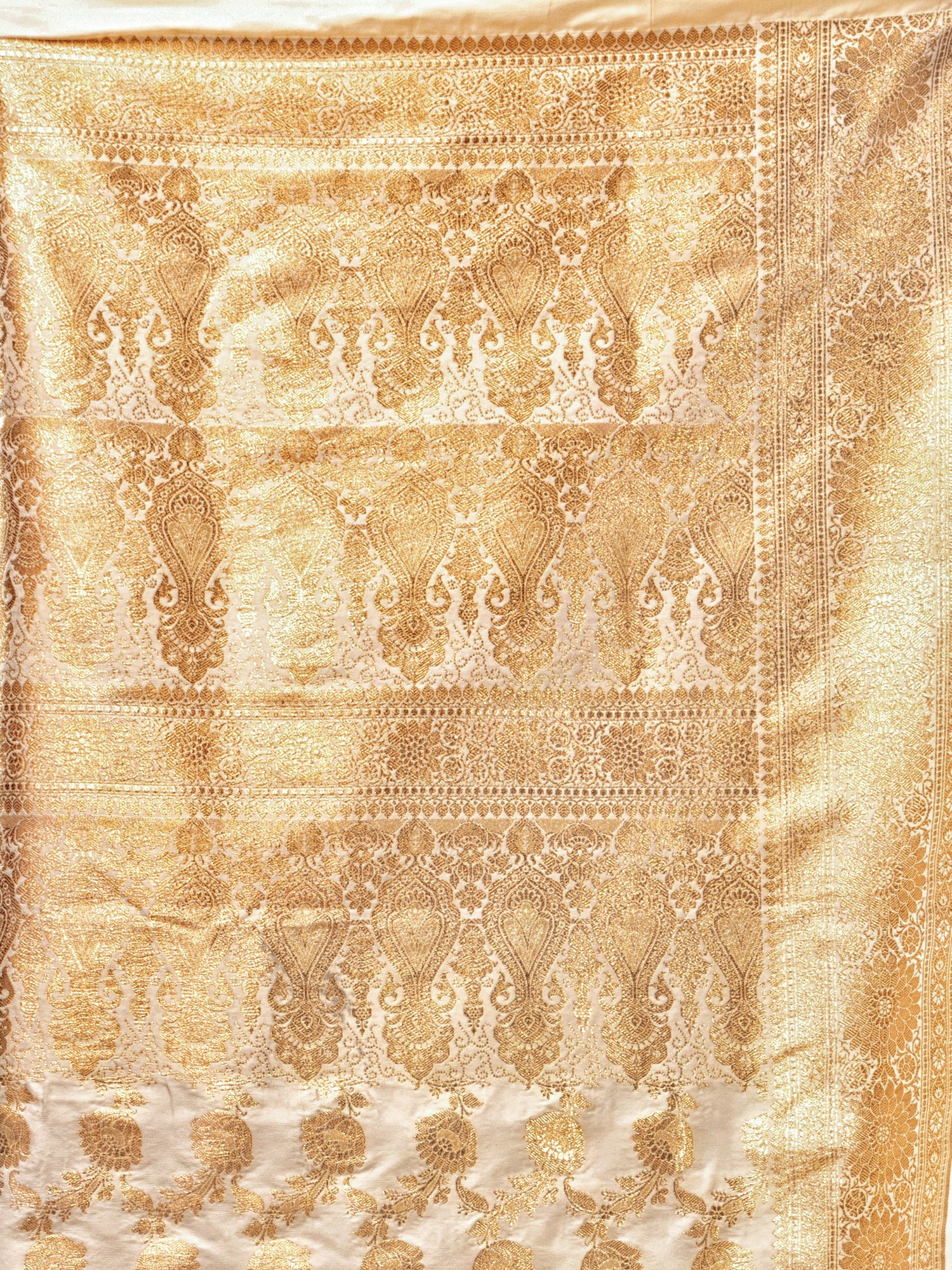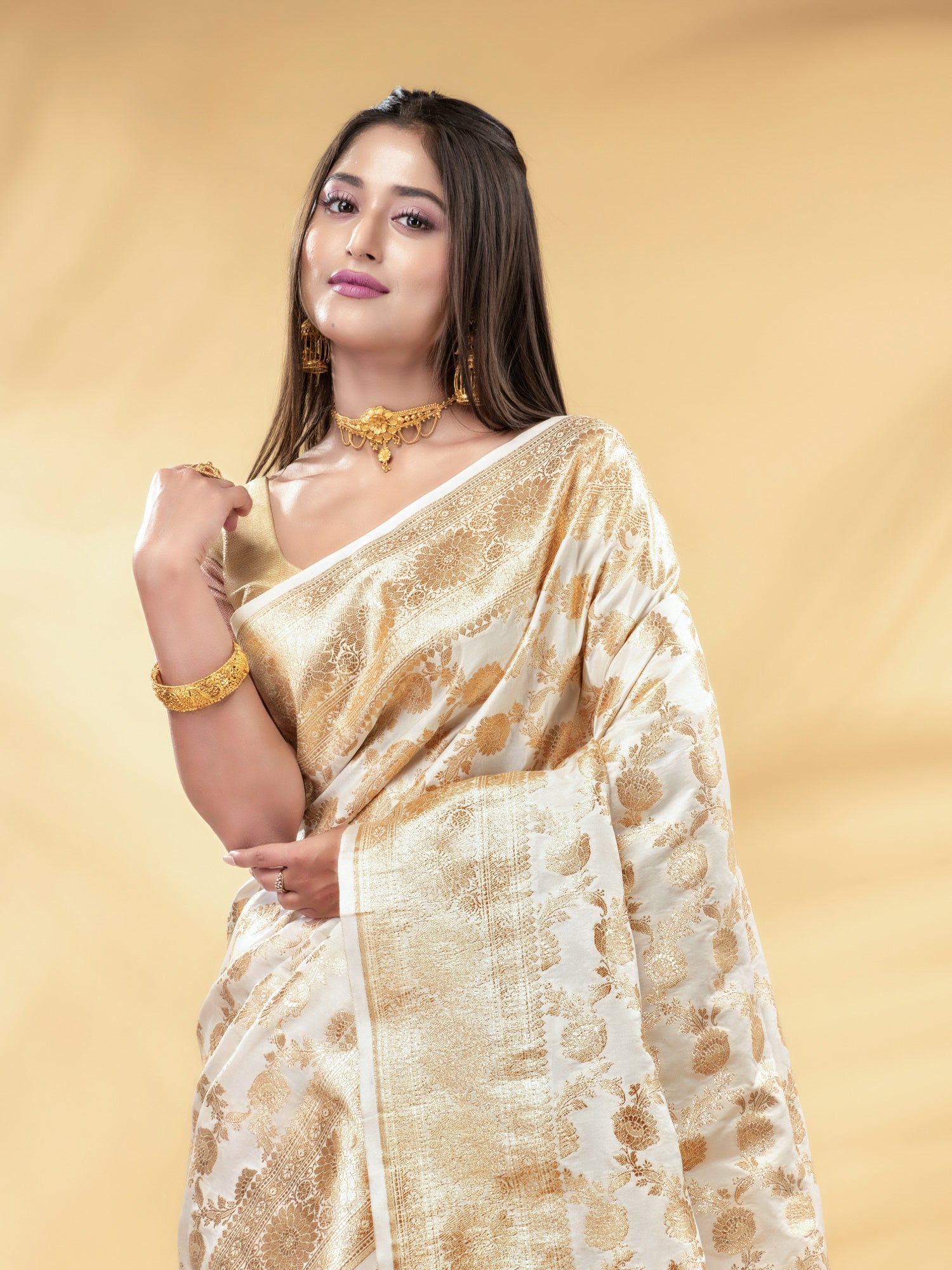 Off White Katan Banarasi Silk Saree with Intricate Golden Zari Weaving