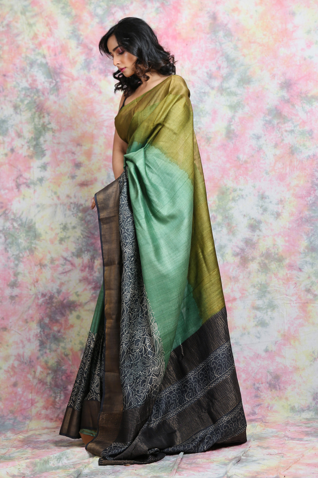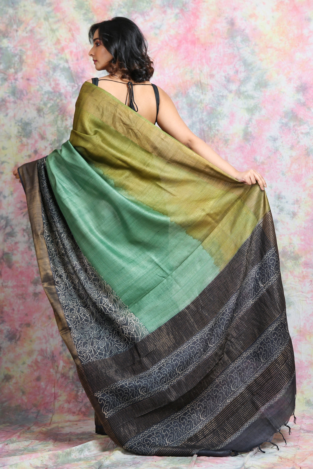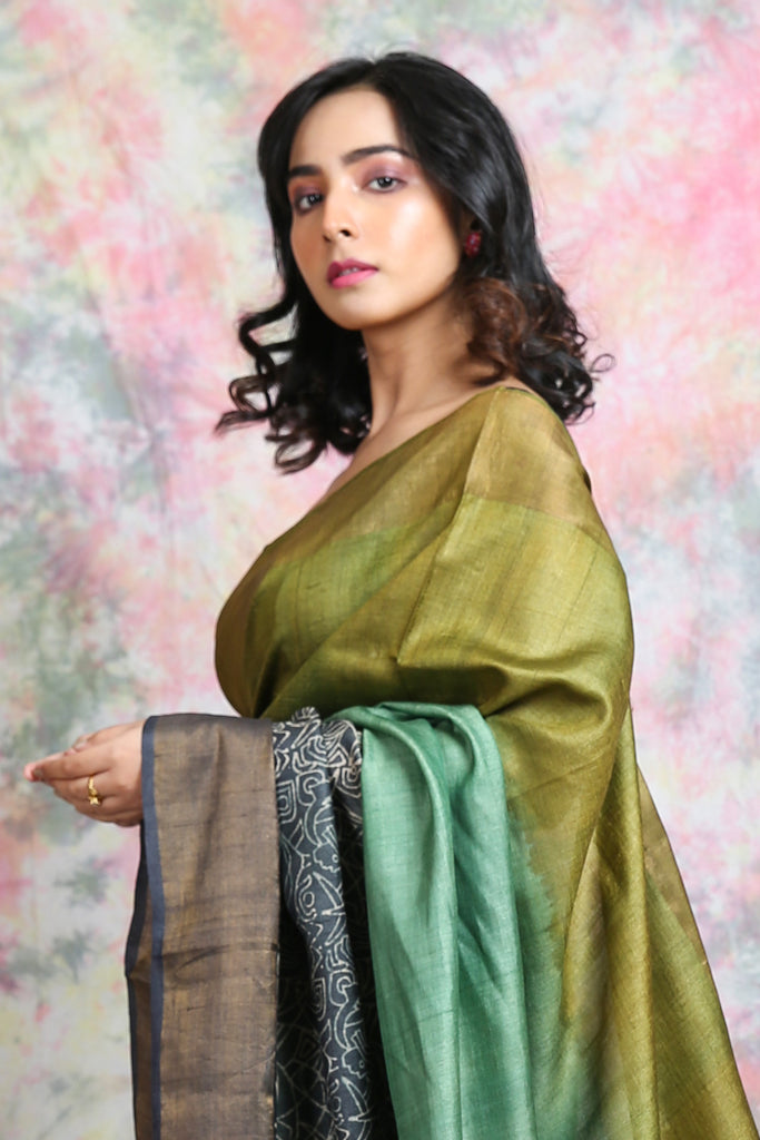 Exude timeless elegance with this pure silk saree, featuring a beautiful gradient of olive green and deep black. The saree is adorned with an intricately woven black pallu highlighted with fine white motifs, adding a touch of sophistication. Crafted from premium silk, it offers a rich texture, natural sheen, and graceful drape—perfect for weddings, festive gatherings, and formal occasions. The contrasting dark border enhances its charm, making it a versatile addition to your ethnic wardrobe.