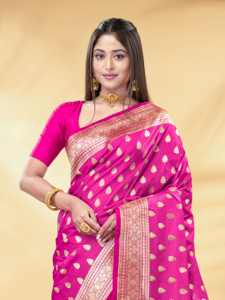 Celebrate tradition in style with this elegant Pink Katan Banarasi Silk Saree, a masterpiece of rich Indian craftsmanship. Made from luxurious pure Katan silk, the saree is adorned with delicate gold zari buta motifs spread diagonally across the body, exuding a timeless charm. The highlight of this saree is its exquisitely woven broad zari border and grand pallu, featuring intricate floral and mango patterns that reflect true Banarasi artistry. The vibrant rani pink color enhances the sheen of the zari, making it the perfect ensemble for weddings, festivals, bridal wear, and traditional events.