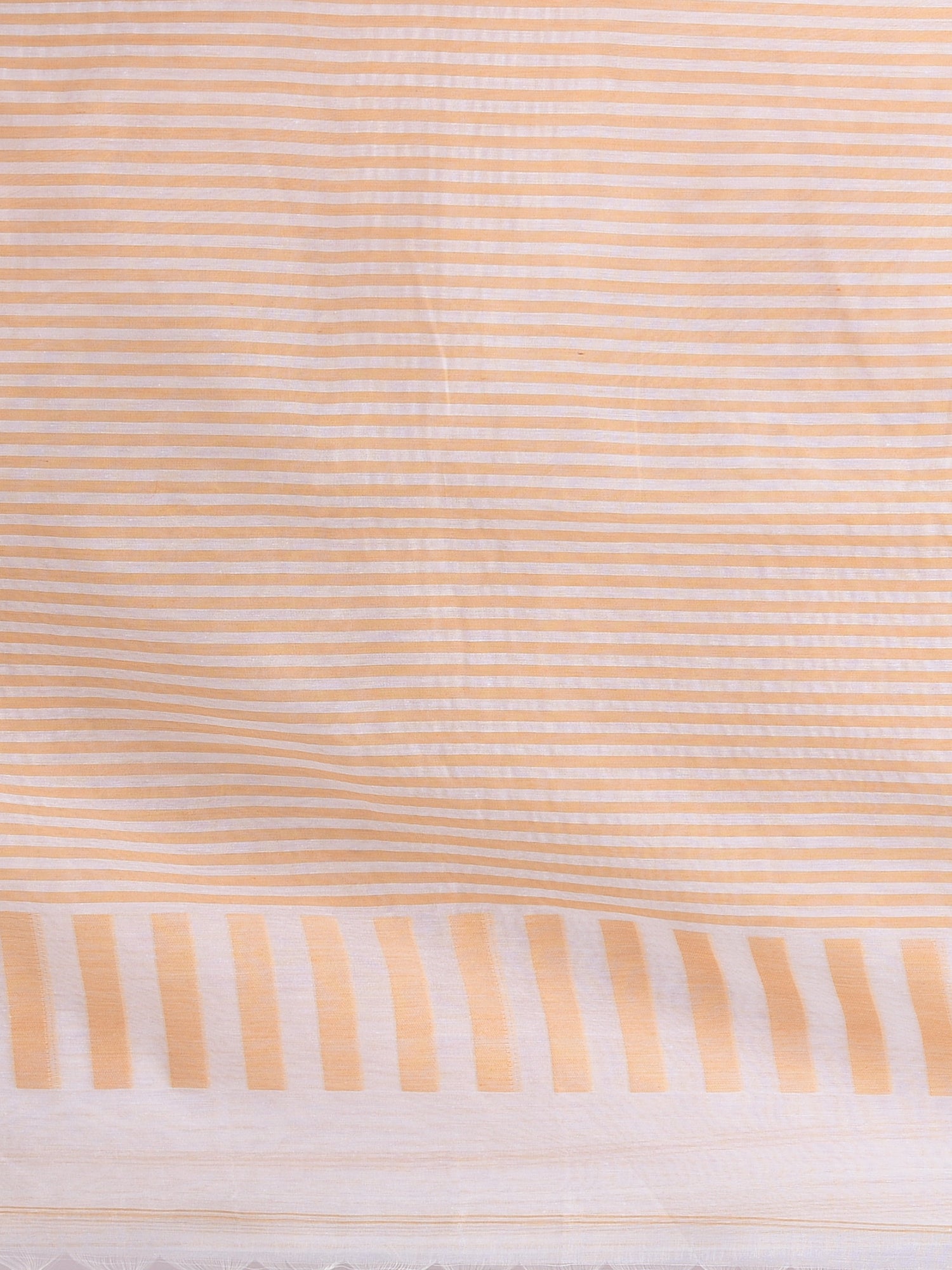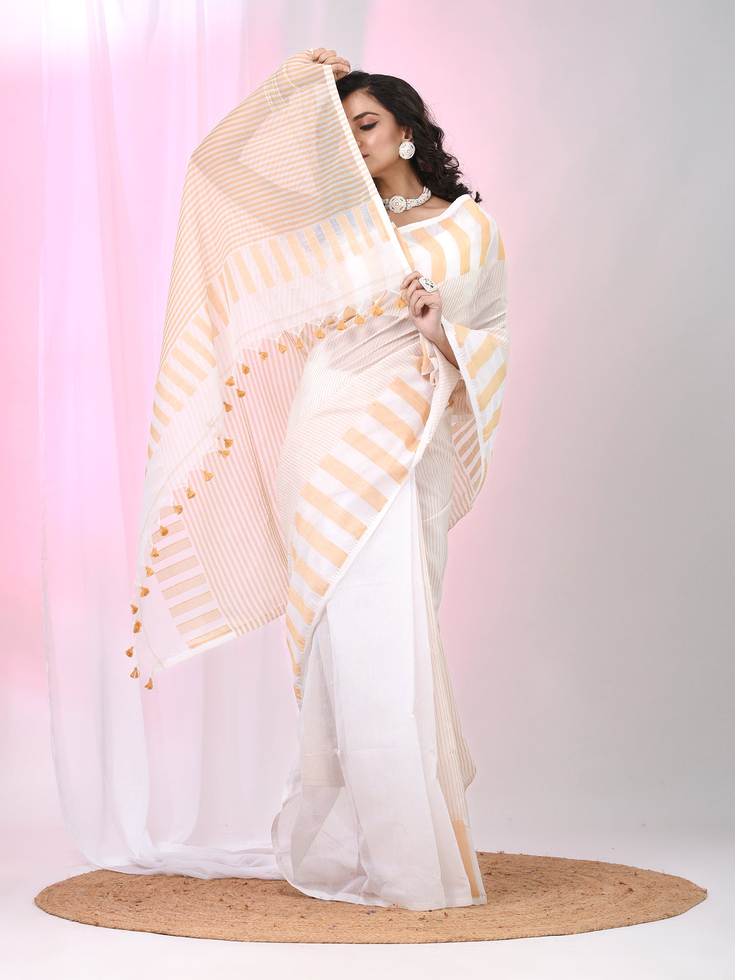 This exquisite handspun cotton saree features a timeless white and beige striped design, offering a fresh and elegant look. The lightweight fabric ensures comfort while maintaining a stylish appearance for any occasion. The saree is adorned with a playful pom-pom pallu that adds a touch of charm and vibrancy. Ideal for both casual and festive wear, this saree combines traditional craftsmanship with a modern twist, making it a must-have addition to your wardrobe. Perfect for any season, this cotton saree brings sophistication with ease.