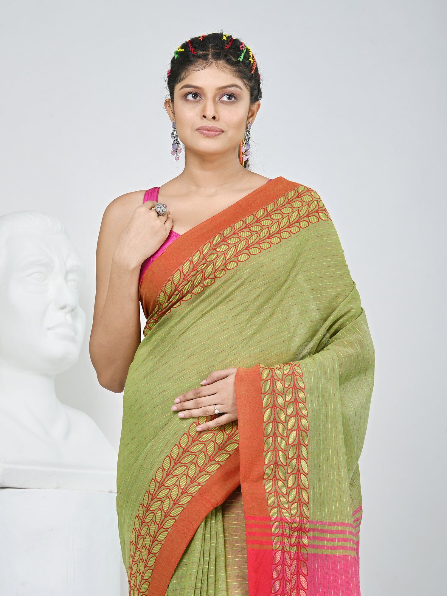 This stunning green handspun cotton saree is the perfect blend of tradition and modern aesthetics. The rich green body is complemented by vibrant red borders, adorned with delicate leaf motifs that add a touch of elegance. Crafted from soft, breathable cotton, this saree offers ultimate comfort without compromising on style. Whether you're attending a festive celebration or a special gathering, this piece will elevate your look with its striking combination of colors and intricate design details. Add this timeless classic to your wardrobe for an effortlessly chic appeal.