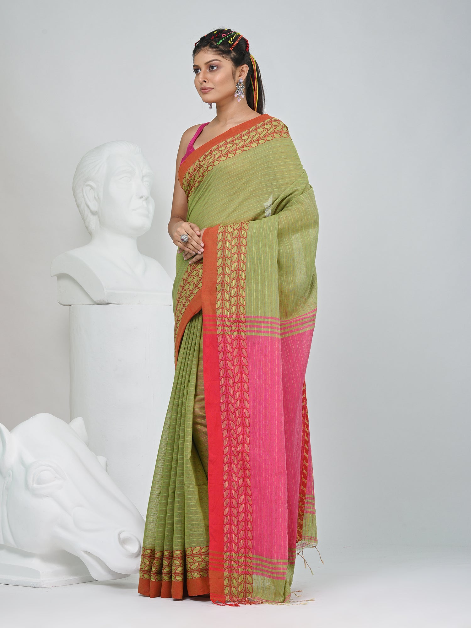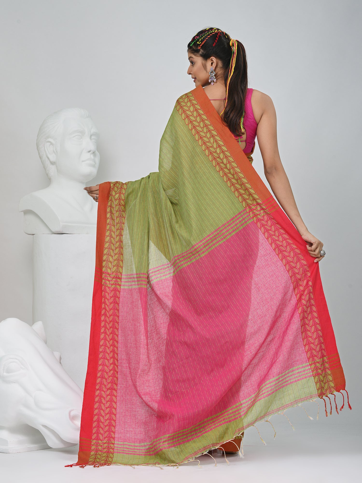 Green And Pink Handspun Cotton Saree with Vibrant Borders