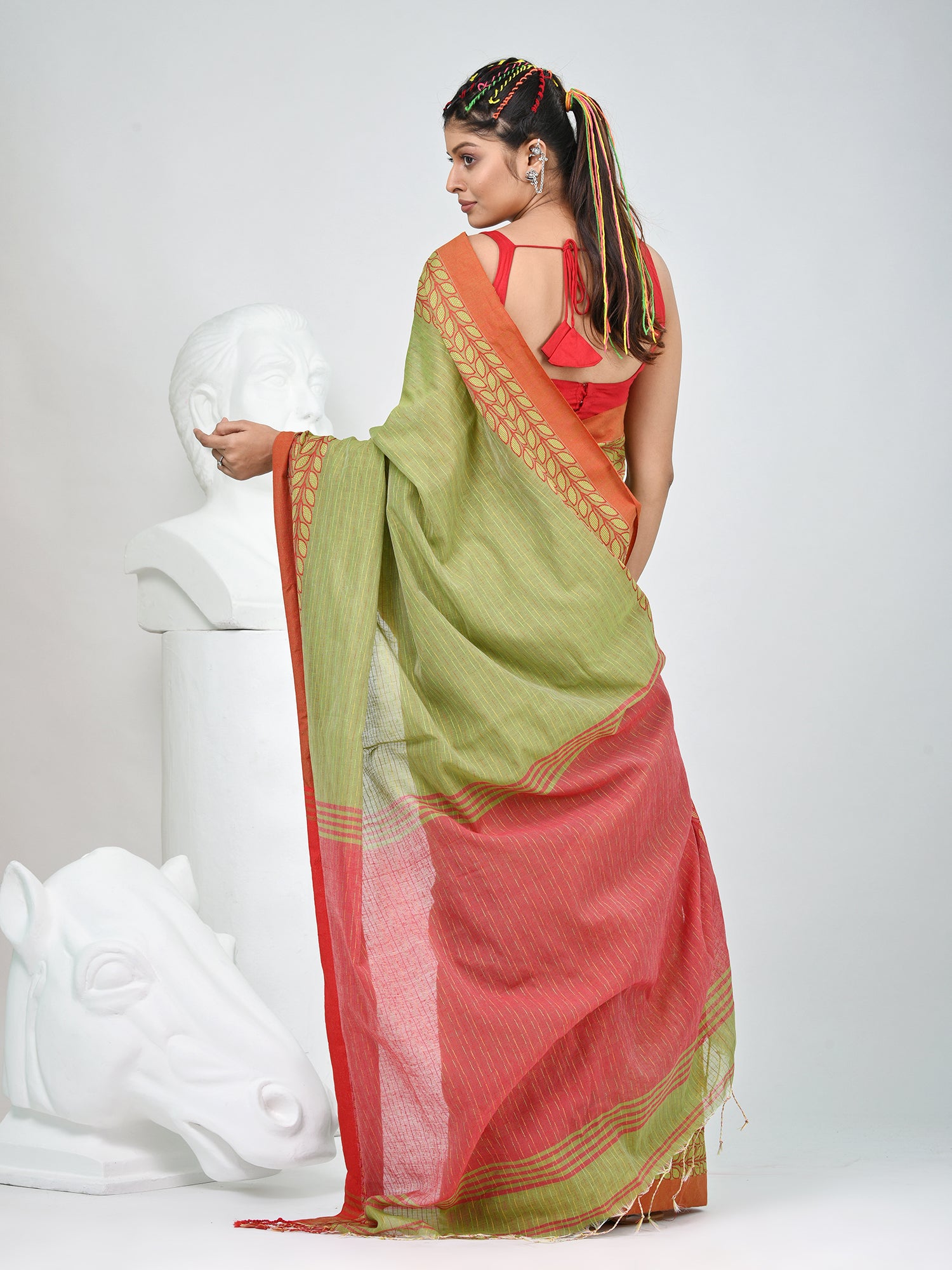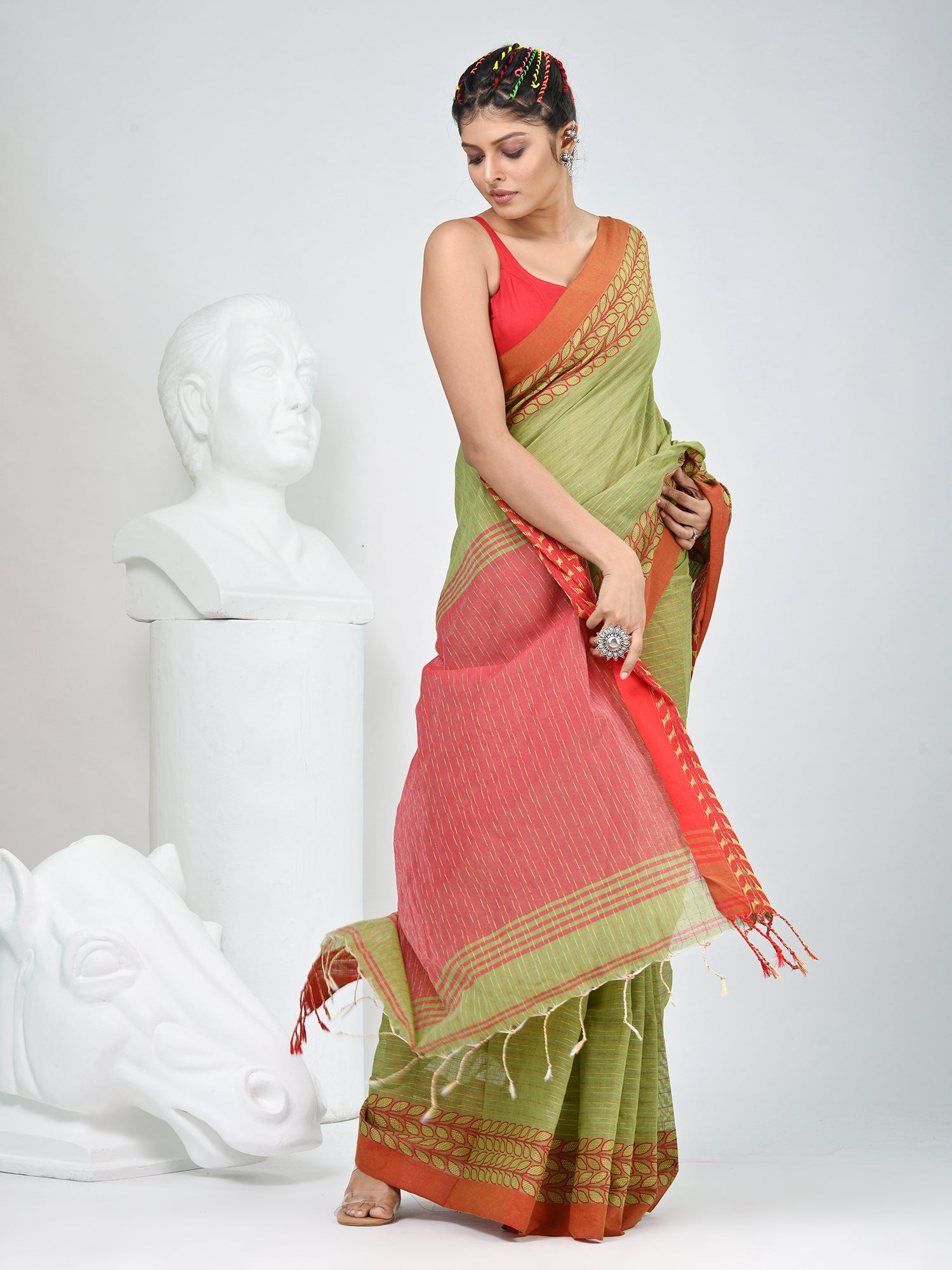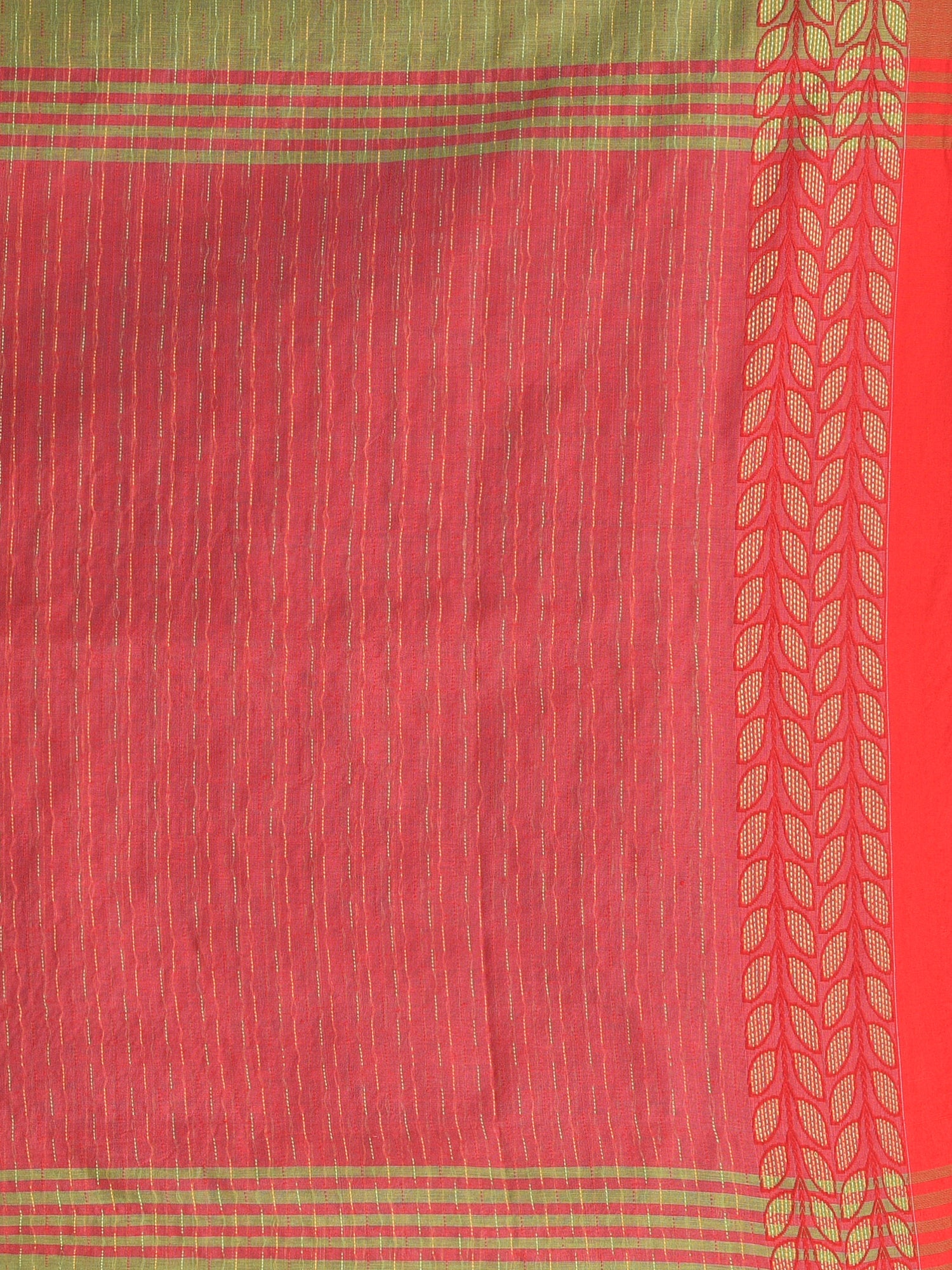 Green And Red Handspun Cotton Saree with Vibrant Borders
