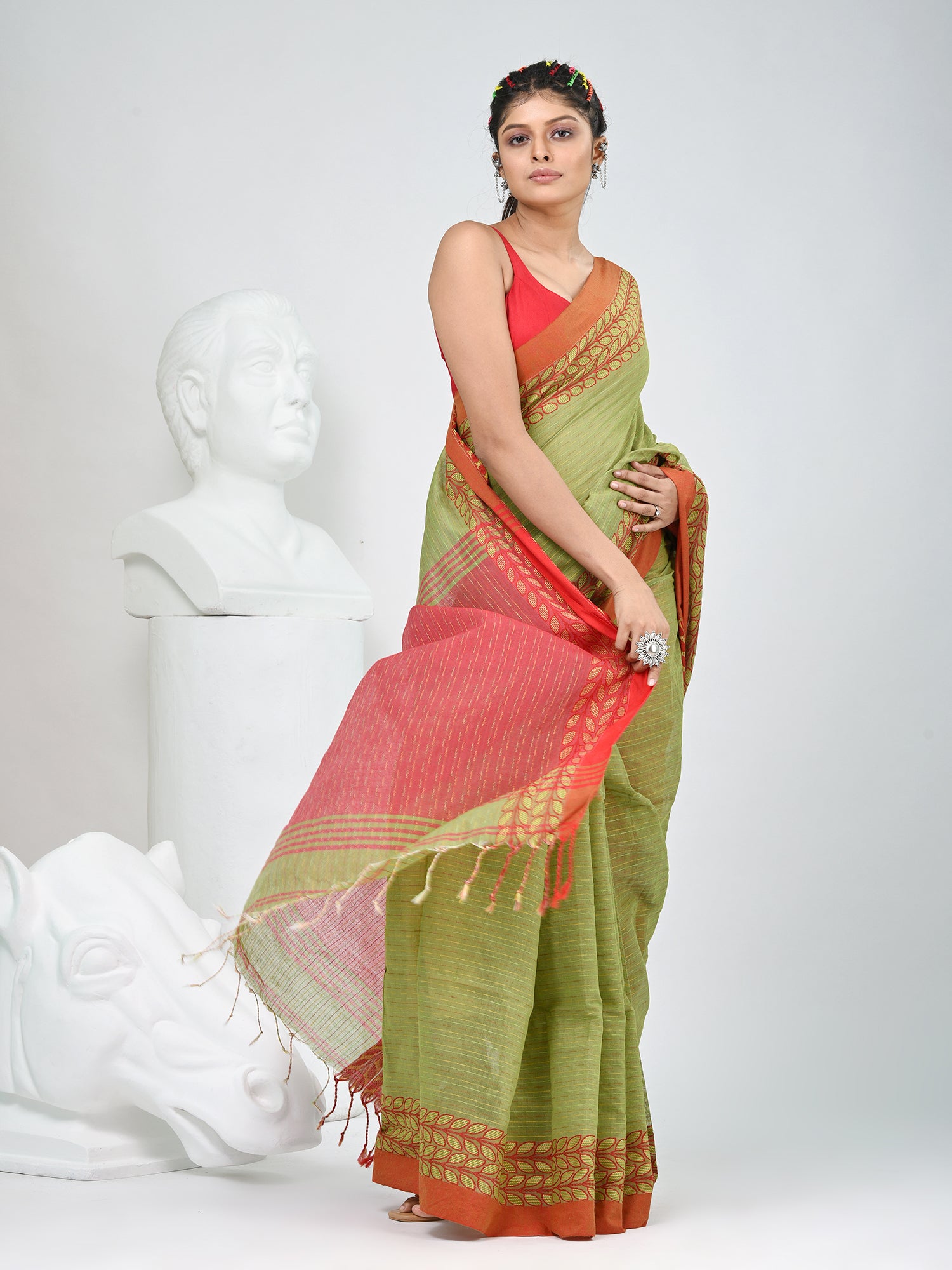 This stunning green handspun cotton saree is the perfect blend of tradition and modern aesthetics. The rich green body is complemented by vibrant red borders, adorned with delicate leaf motifs that add a touch of elegance. Crafted from soft, breathable cotton, this saree offers ultimate comfort without compromising on style. Whether you're attending a festive celebration or a special gathering, this piece will elevate your look with its striking combination of colors and intricate design details. Add this timeless classic to your wardrobe for an effortlessly chic appeal.