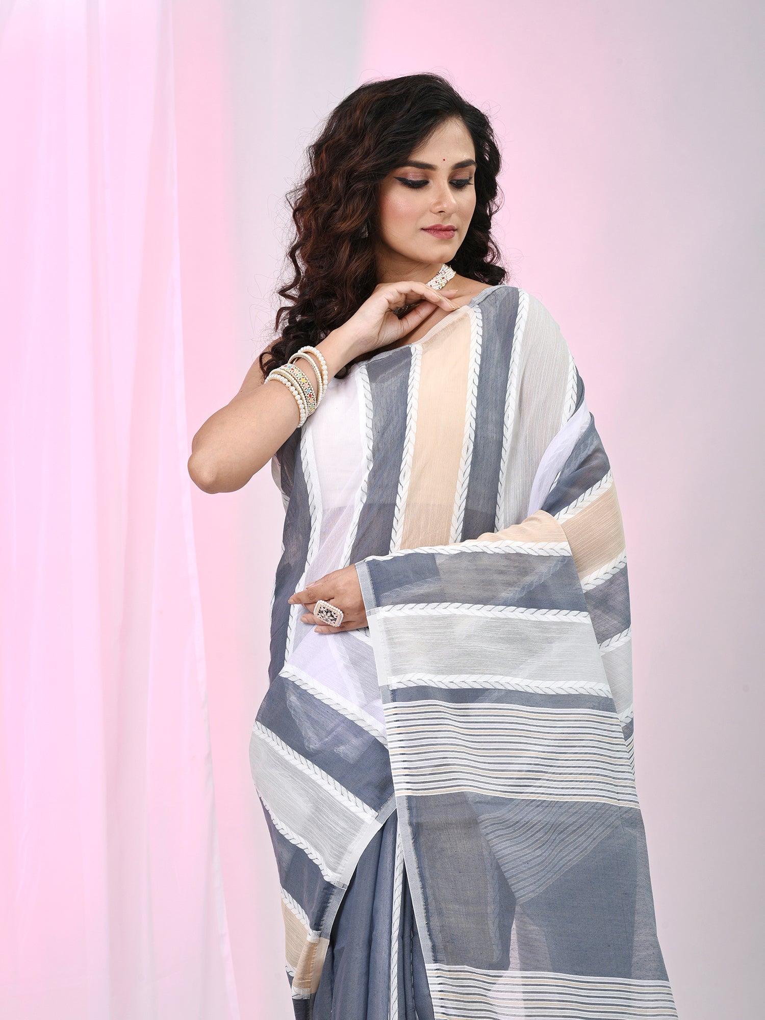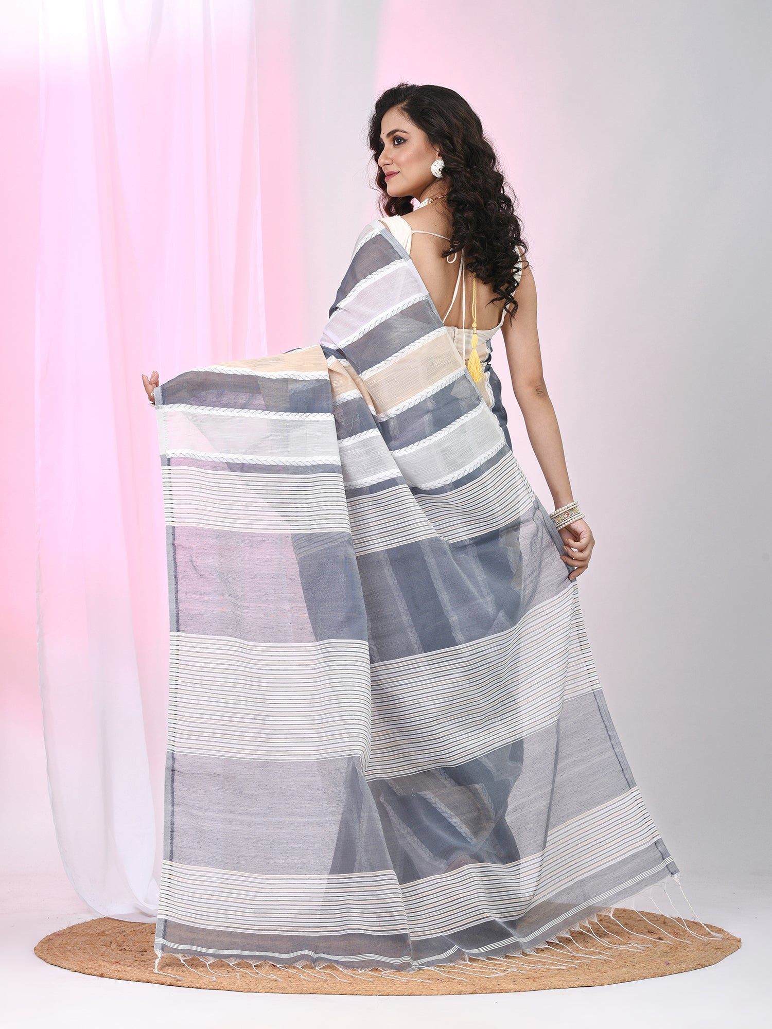 Exude sophistication with this handspun cotton saree featuring alternating stripes in elegant shades of grey, beige, and white. The chic combination of cool tones creates a soothing and timeless look, perfect for both casual and semi-formal occasions. The breathable cotton fabric ensures comfort throughout the day, making it ideal for warm-weather events, office wear, or relaxed gatherings. Paired with a matching blouse piece, this saree adds a touch of grace and effortless style to your wardrobe.