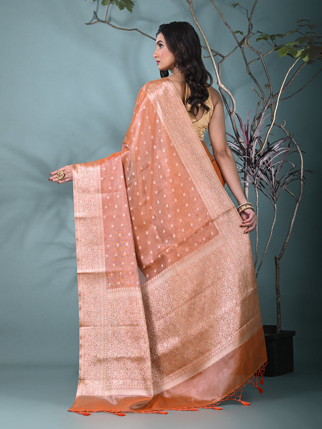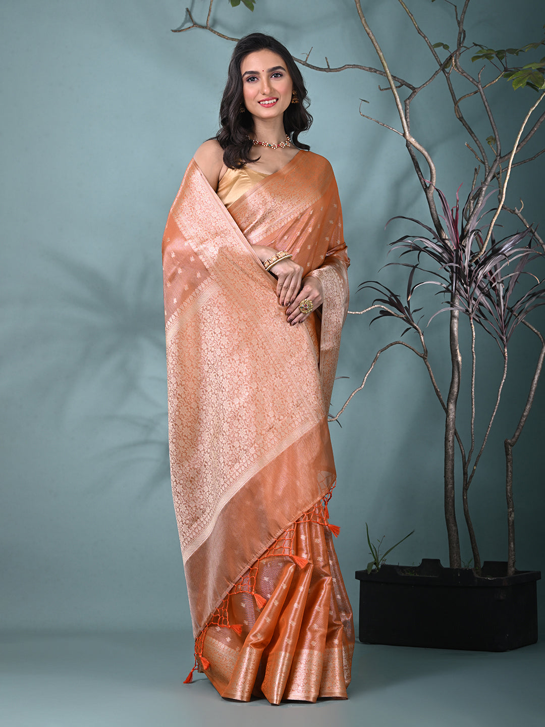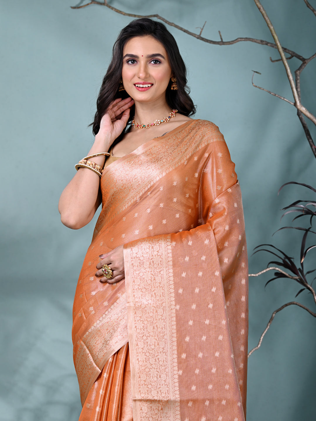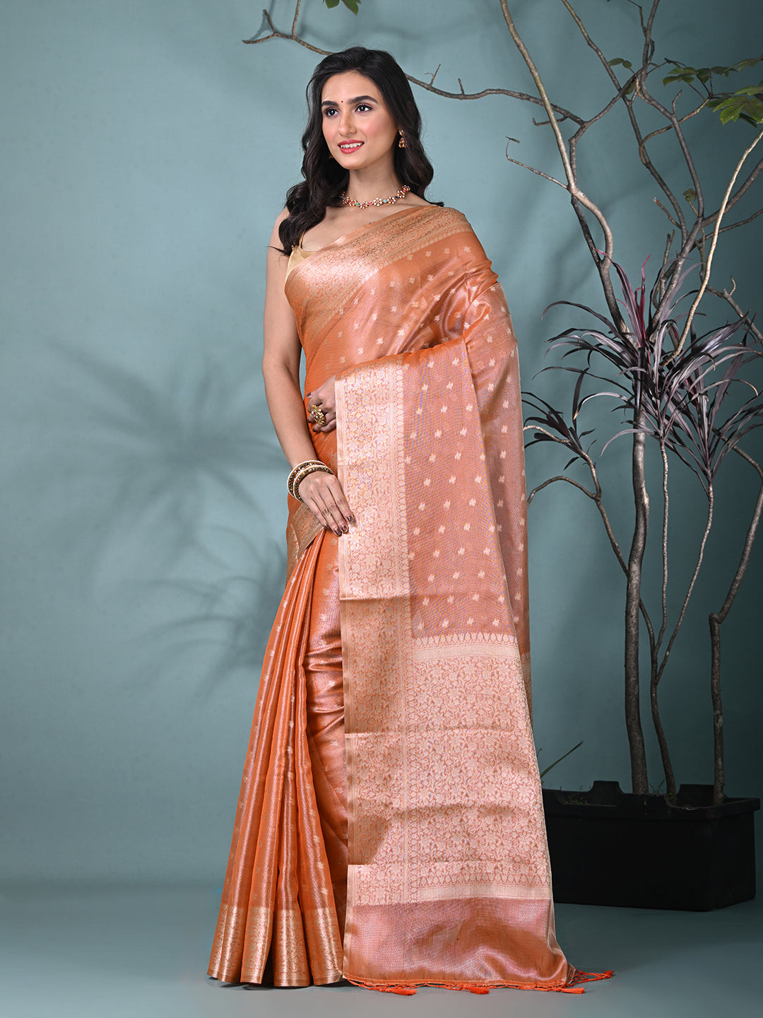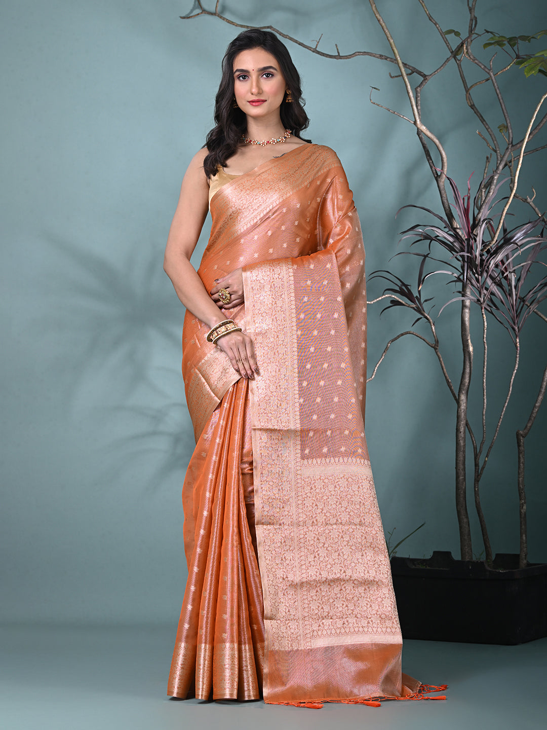 This graceful orange tissue saree combines timeless elegance with modern charm. Crafted from luxurious tissue fabric, it features delicate shimmering patterns and an intricately designed border that enhances its beauty. Perfect for formal occasions, weddings, or festive events, this saree offers a sophisticated and refined look. Paired with a matching blouse, it is sure to make a statement at any celebration.