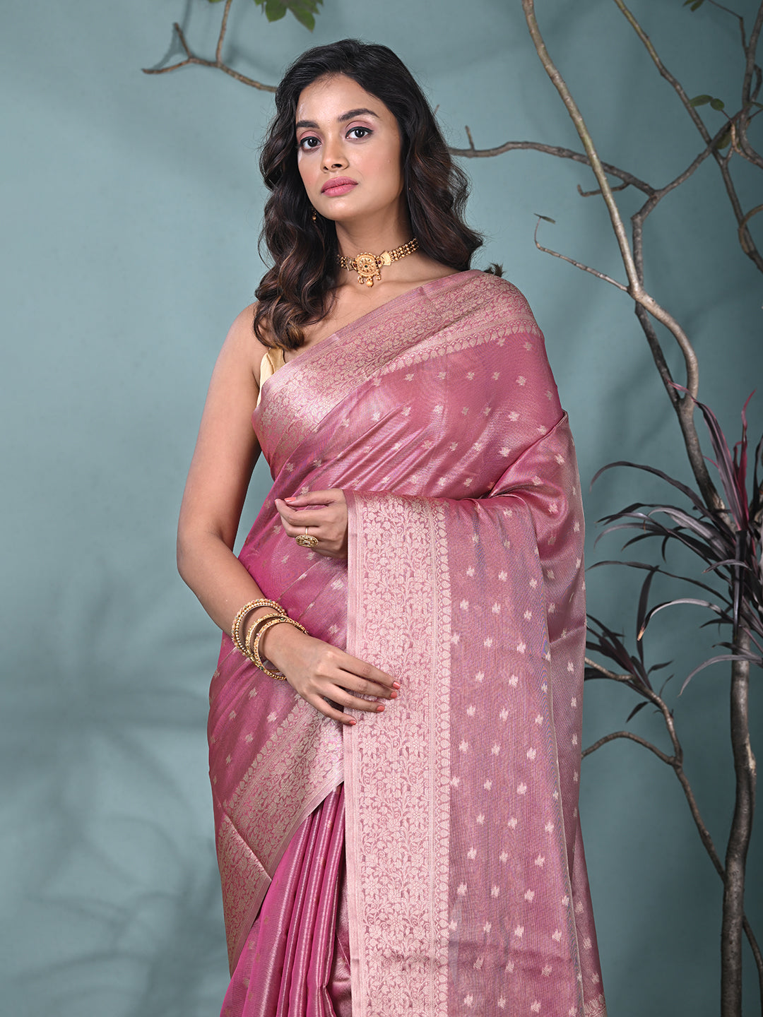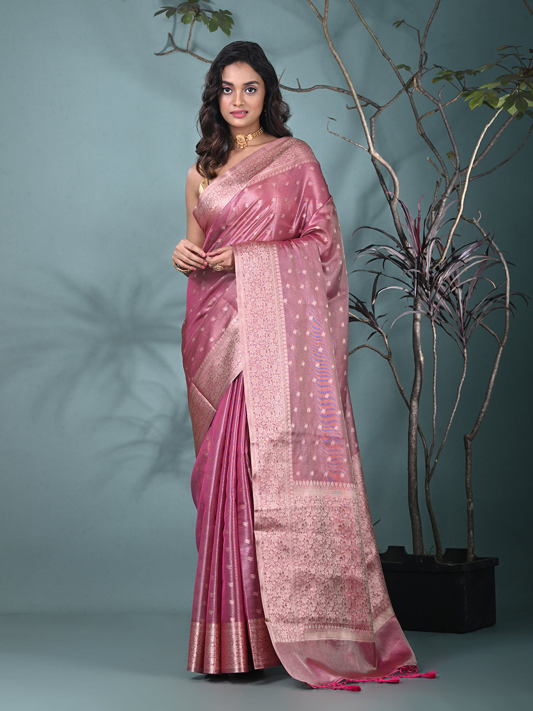 This graceful pink tissue saree combines timeless elegance with modern charm. Crafted from luxurious tissue fabric, it features delicate shimmering patterns and an intricately designed border that enhances its beauty. Perfect for formal occasions, weddings, or festive events, this saree offers a sophisticated and refined look. Paired with a matching blouse, it is sure to make a statement at any celebration.