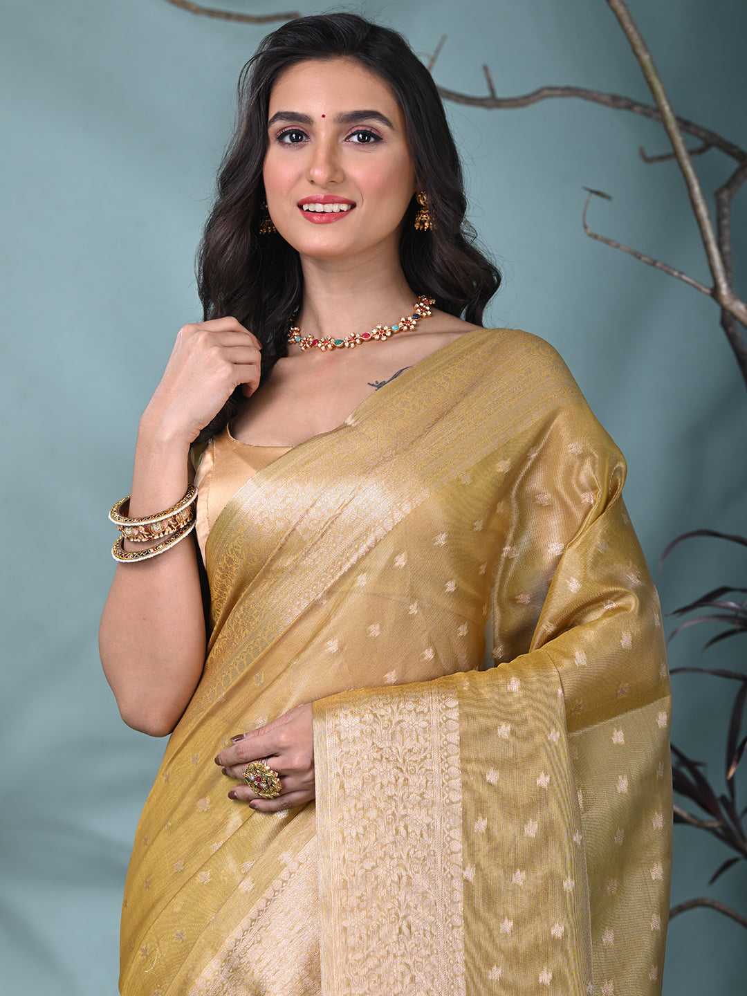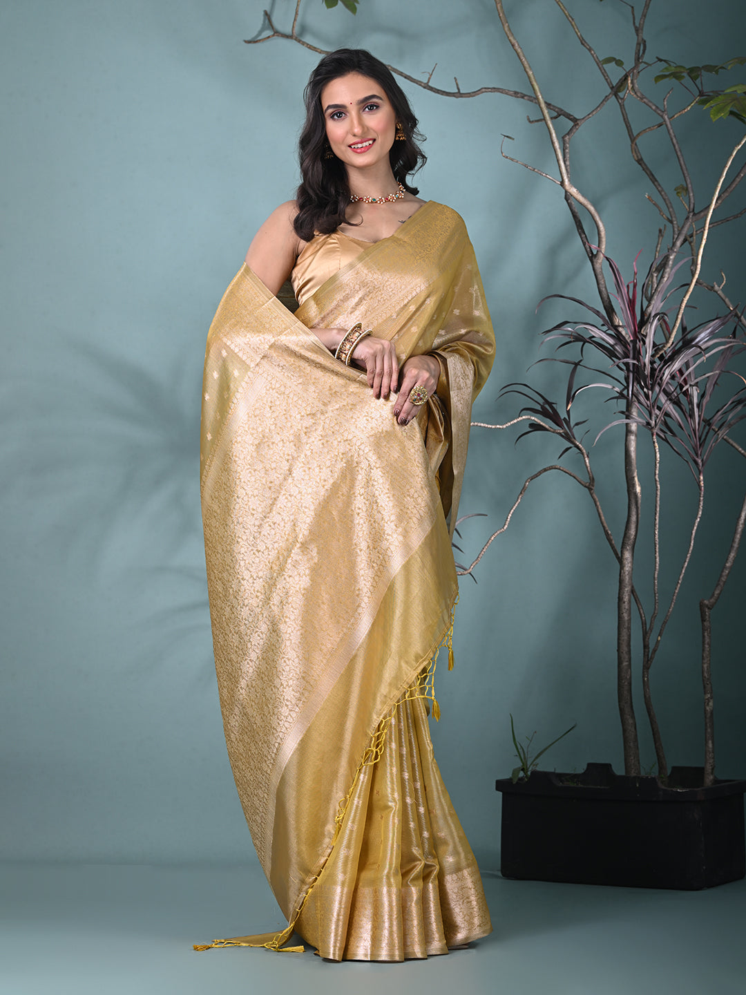 This graceful yellow tissue saree combines timeless elegance with modern charm. Crafted from luxurious tissue fabric, it features delicate shimmering patterns and an intricately designed border that enhances its beauty. Perfect for formal occasions, weddings, or festive events, this saree offers a sophisticated and refined look. Paired with a matching blouse, it is sure to make a statement at any celebration.