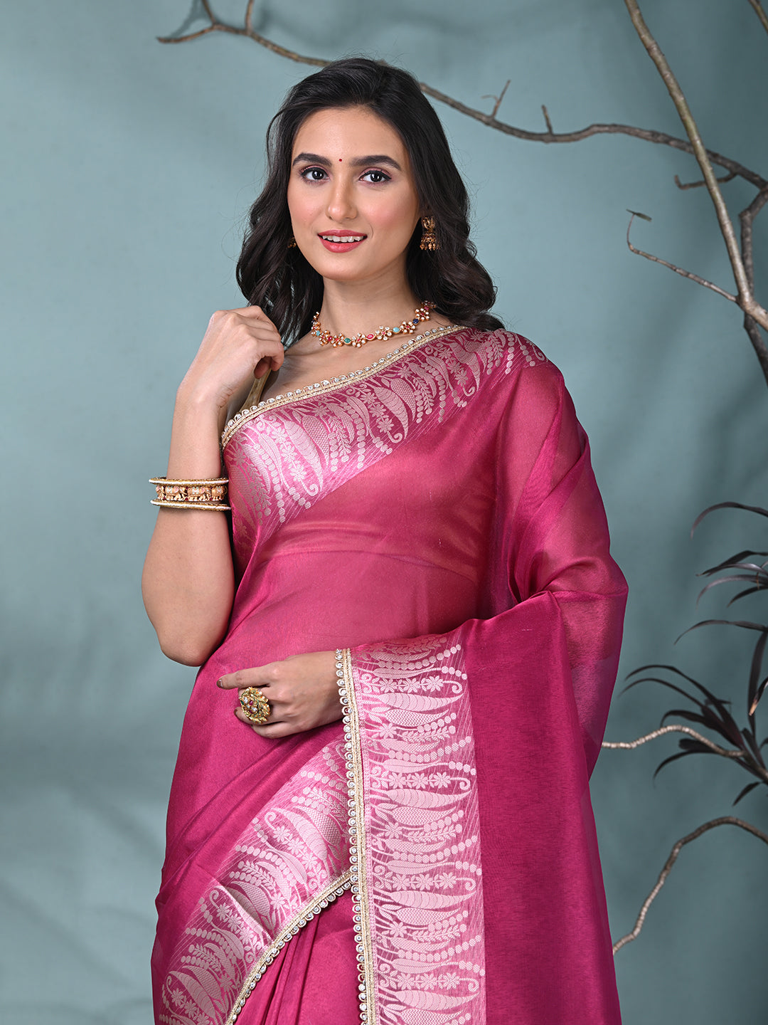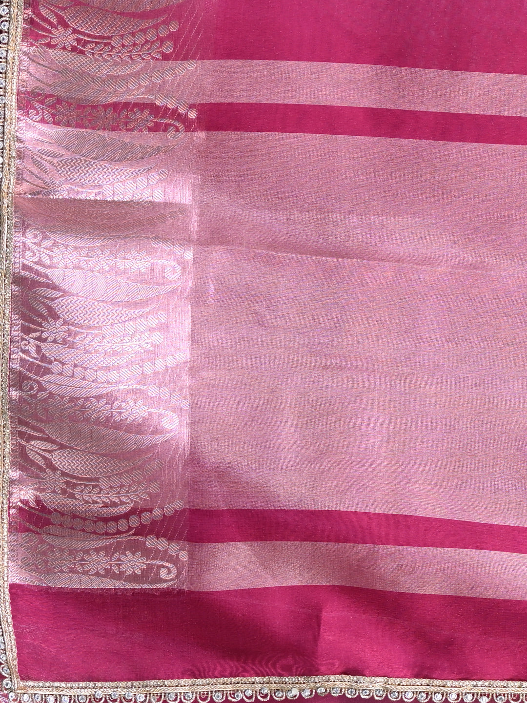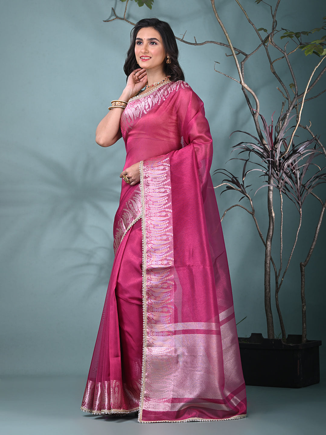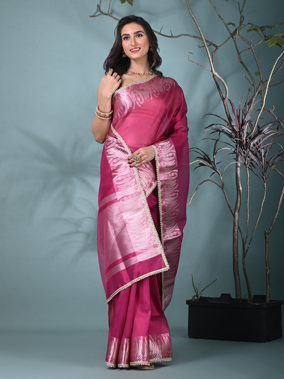 Fuchsia Tissue Saree with Intricate Silver Zari Border