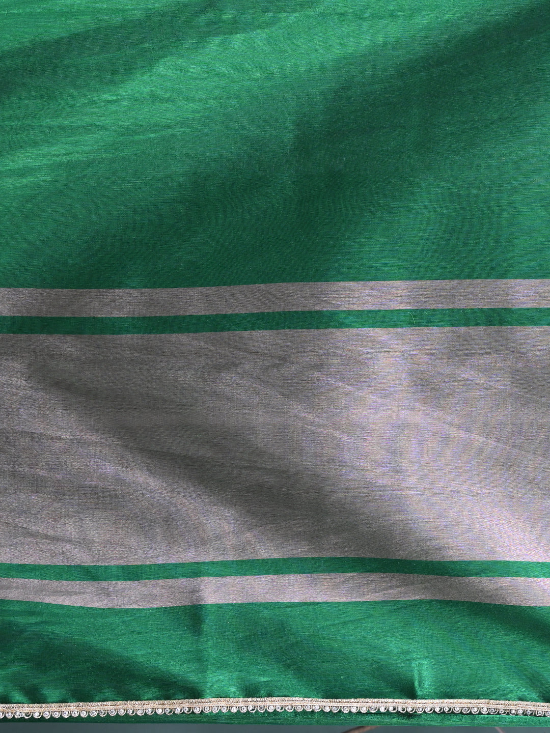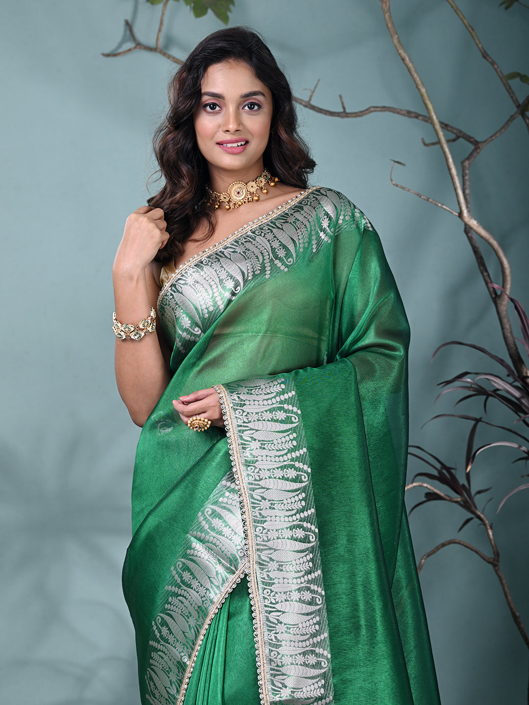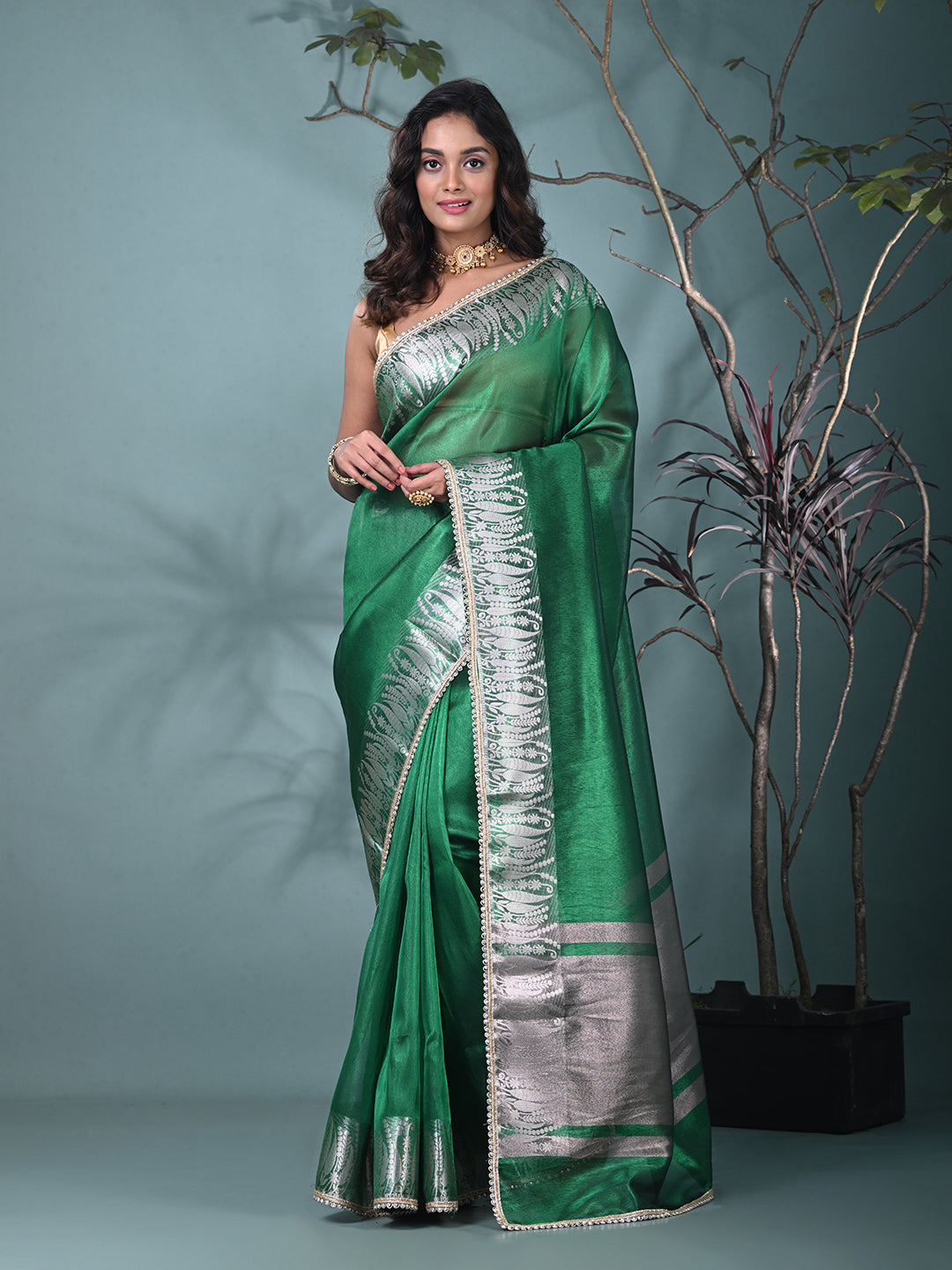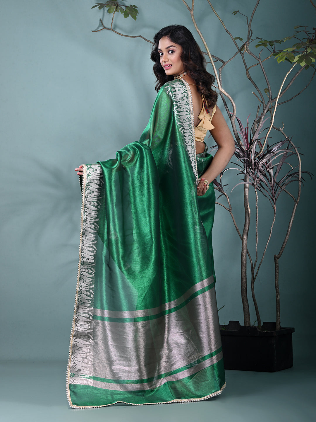 Green Tissue Saree with Intricate Silver Zari Border