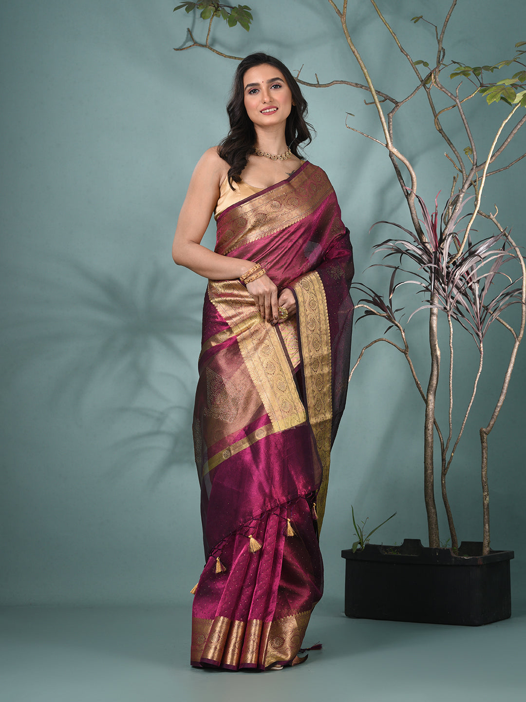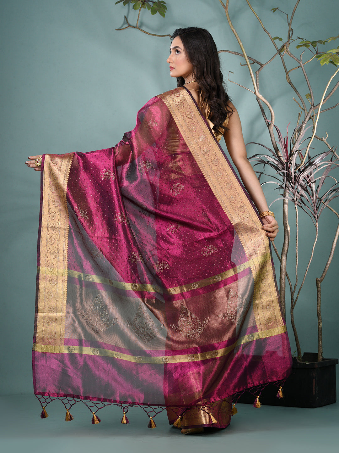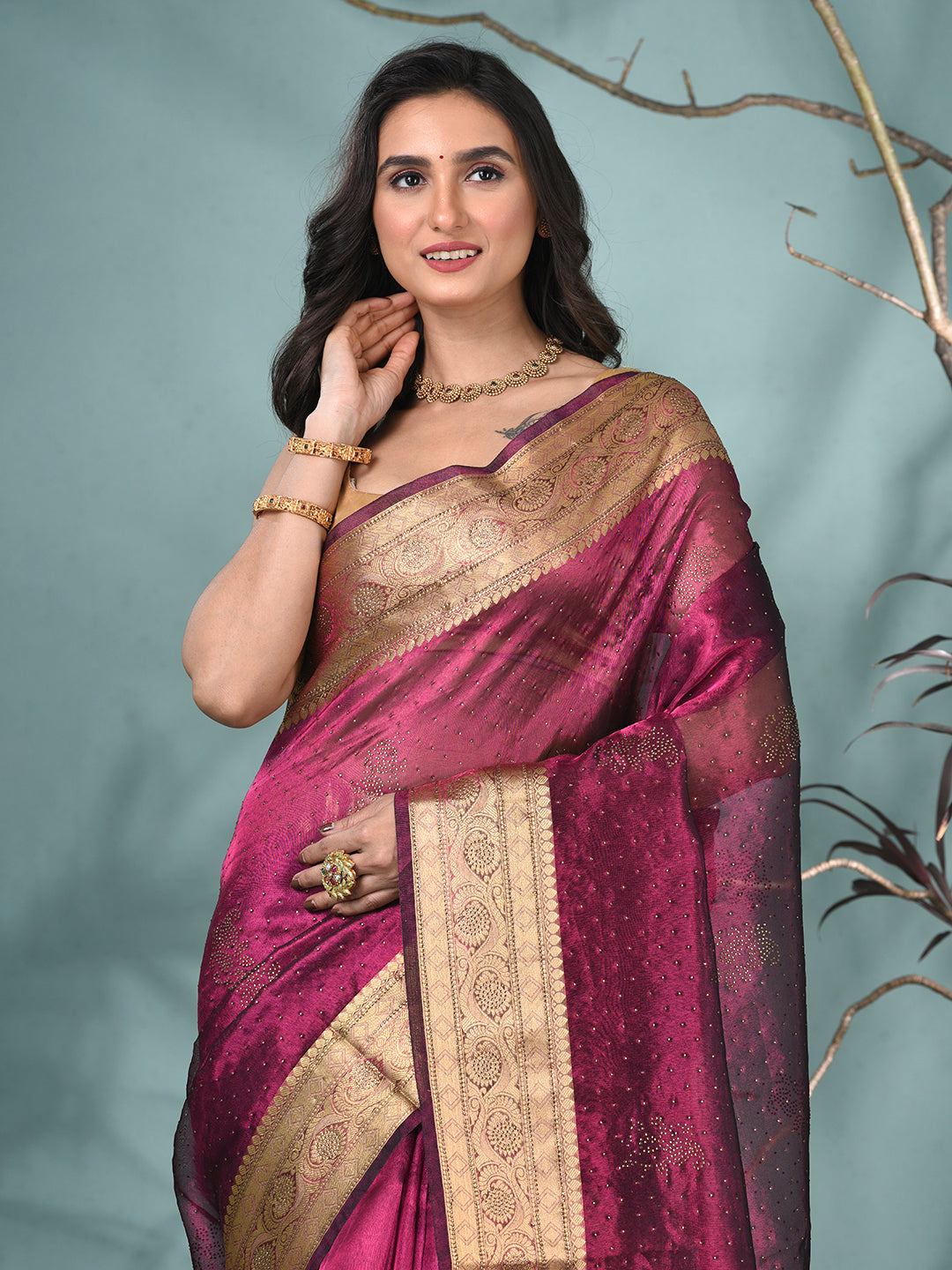 This enchanting Magenta tissue saree exudes grace and sophistication, perfect for upscale occasions such as weddings, receptions, and festive celebrations. The saree is made from high-quality tissue fabric, offering a subtle sheen that enhances its luxurious appeal. The border is beautifully accentuated with intricate stone detailing, adding an extra touch of glamour and refinement. Designed to stand out, this saree features elegant motifs that are delicately embroidered across the fabric, paired with the stunning stone embellishments that lend it an opulent feel. The contrast of the gold-tone border complements the rich magenta hue, making it an ideal choice for those seeking a sophisticated, yet eye-catching look.