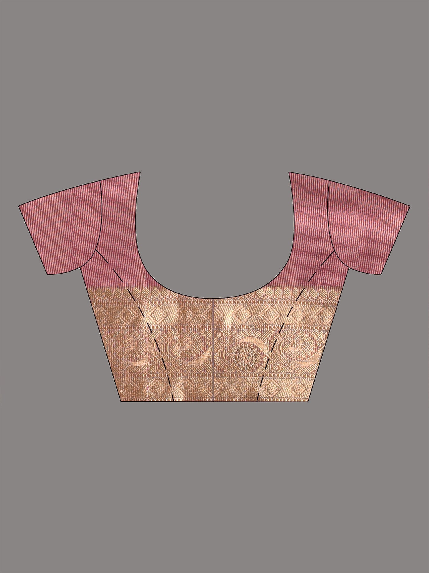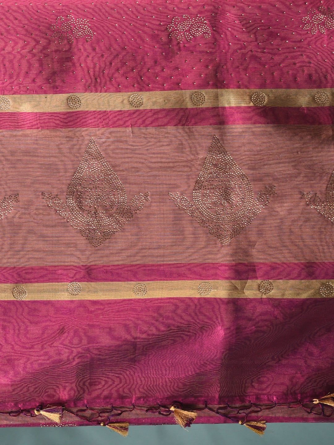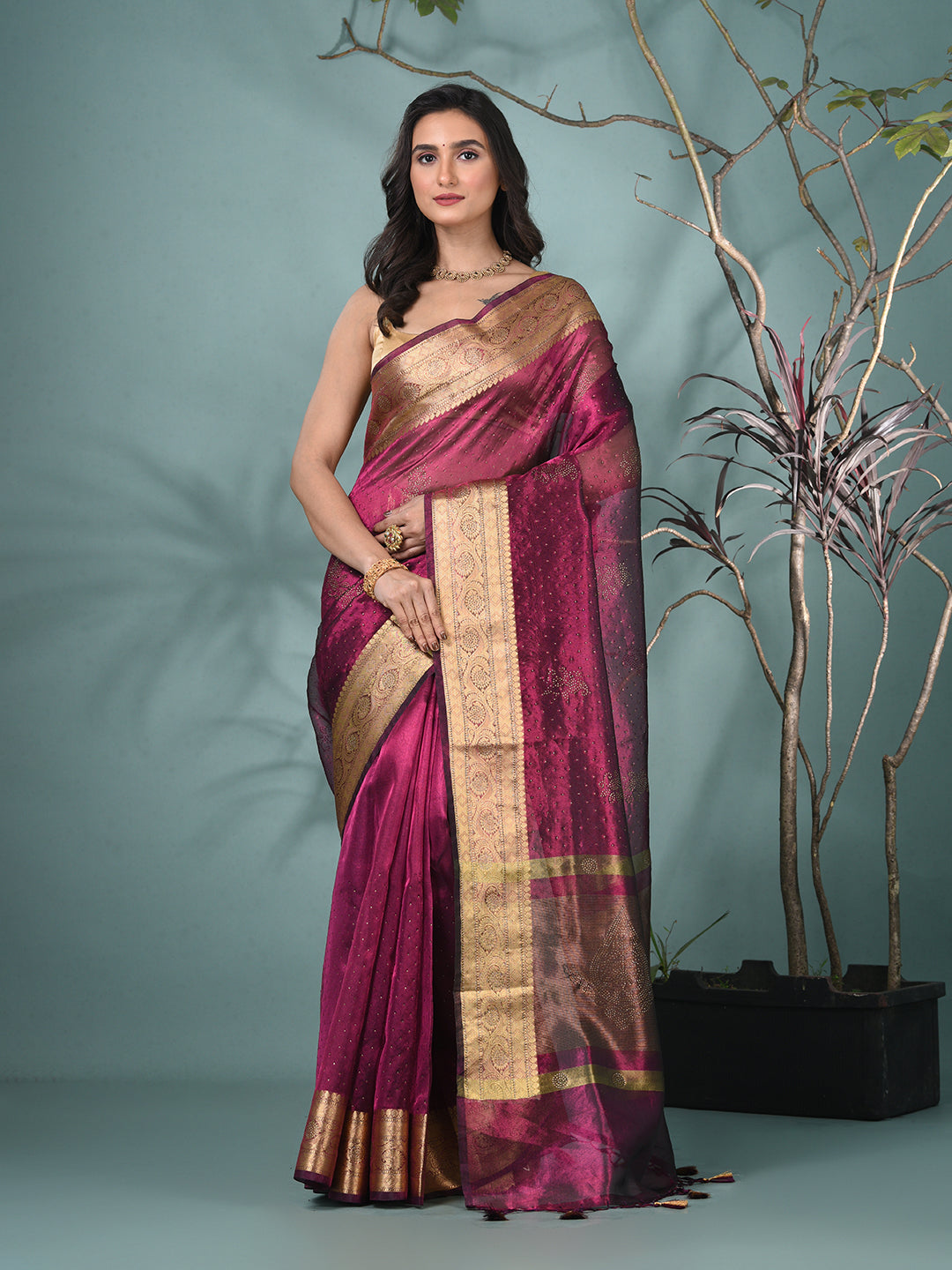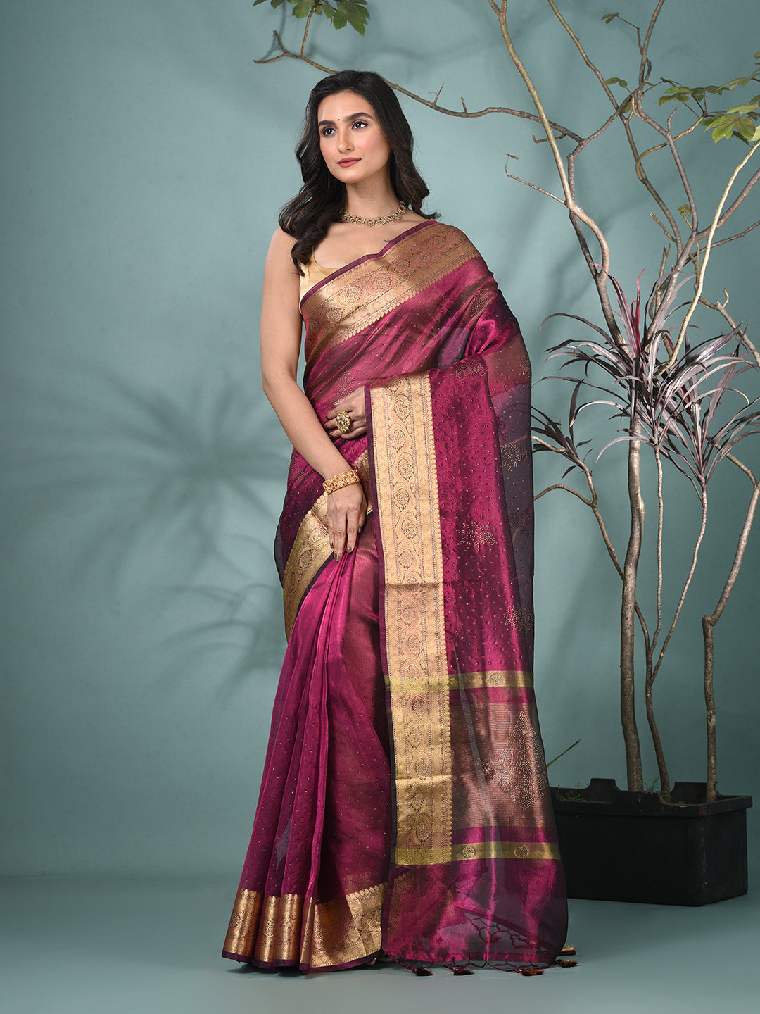 This enchanting Magenta tissue saree exudes grace and sophistication, perfect for upscale occasions such as weddings, receptions, and festive celebrations. The saree is made from high-quality tissue fabric, offering a subtle sheen that enhances its luxurious appeal. The border is beautifully accentuated with intricate stone detailing, adding an extra touch of glamour and refinement. Designed to stand out, this saree features elegant motifs that are delicately embroidered across the fabric, paired with the stunning stone embellishments that lend it an opulent feel. The contrast of the gold-tone border complements the rich magenta hue, making it an ideal choice for those seeking a sophisticated, yet eye-catching look.