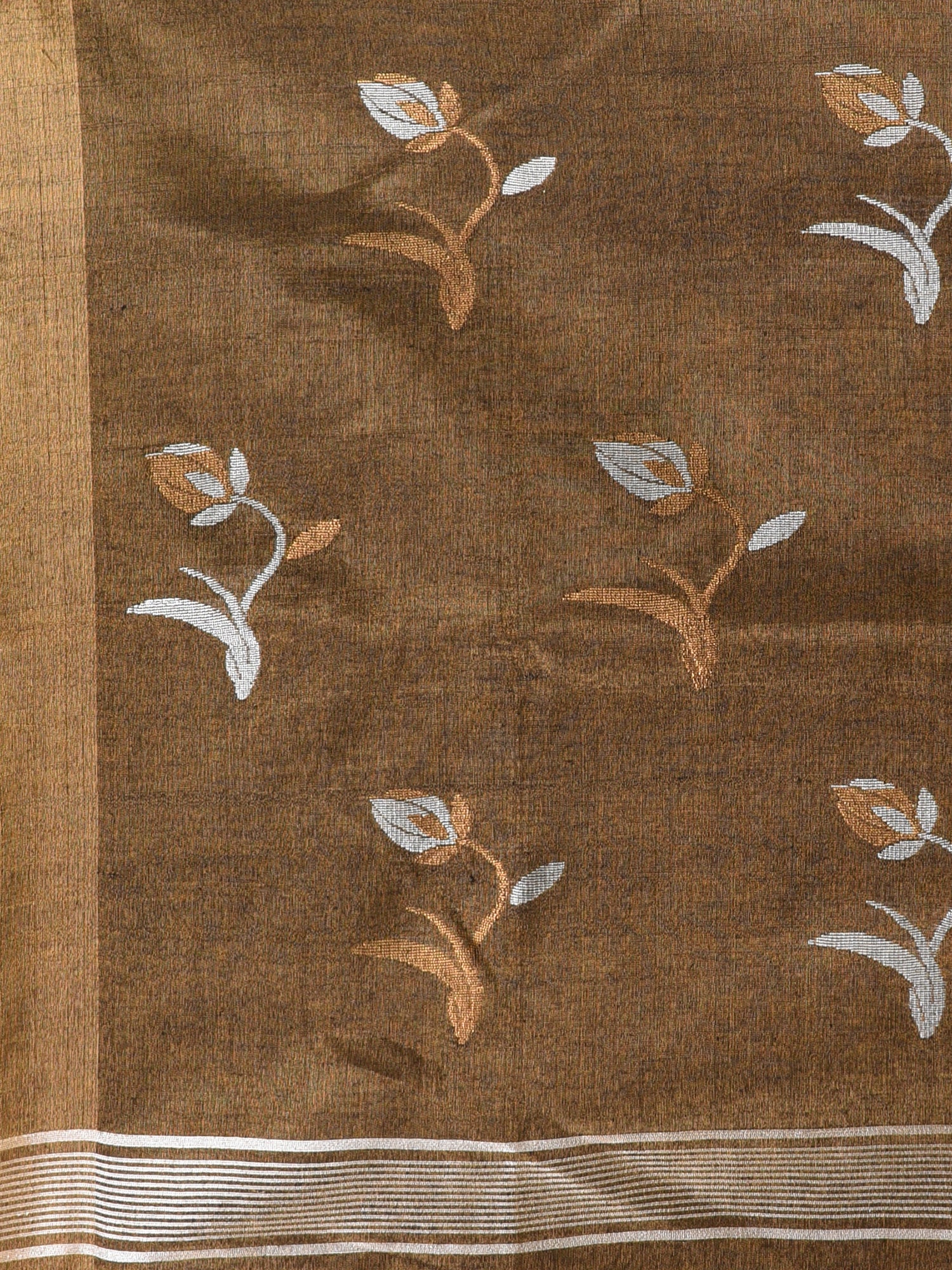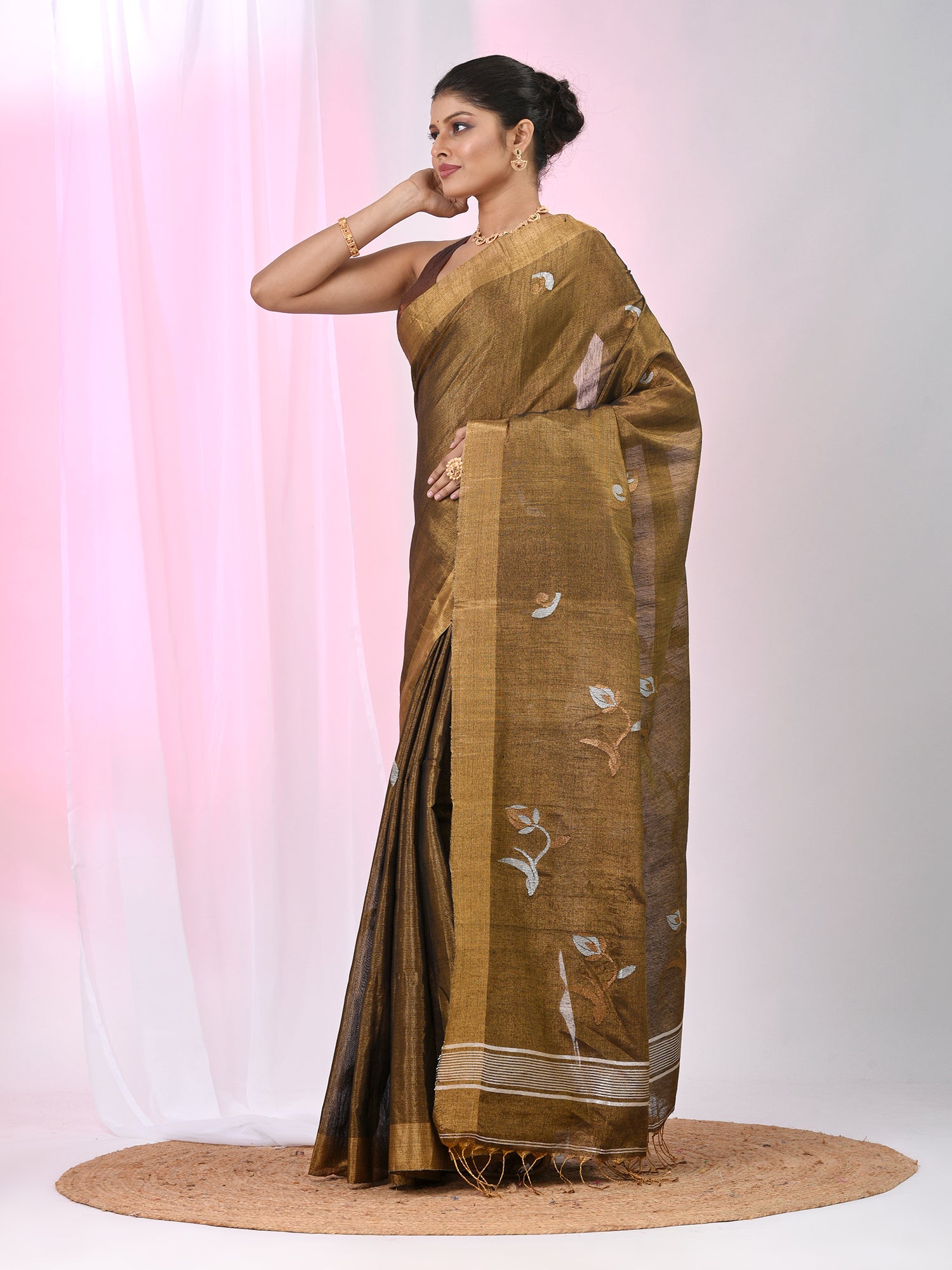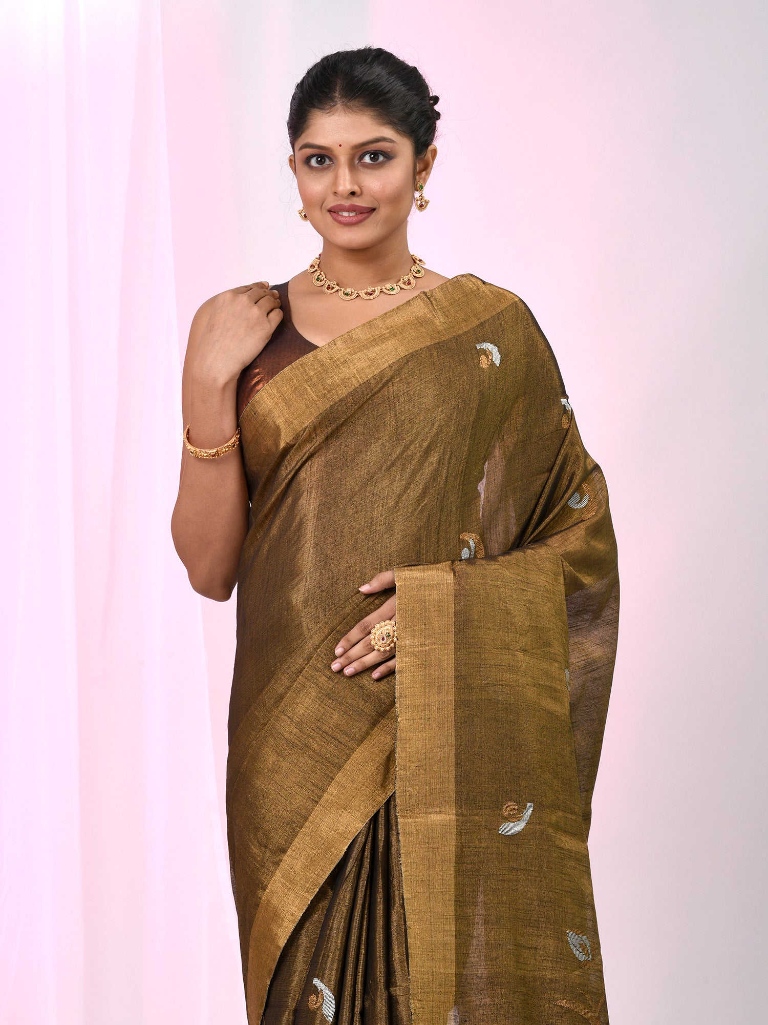 This luxurious tissue silk saree is a perfect blend of tradition and elegance. Featuring delicate ethnic motifs in shades of golden and white, it exudes sophistication and charm. The rich metallic hue is complemented by a golden border, adding a regal touch to the overall look. Ideal for festive occasions, weddings, and celebrations, this saree is designed to enhance your grace with its lightweight texture and stunning design. Pair it with traditional jewelry to complete your look.