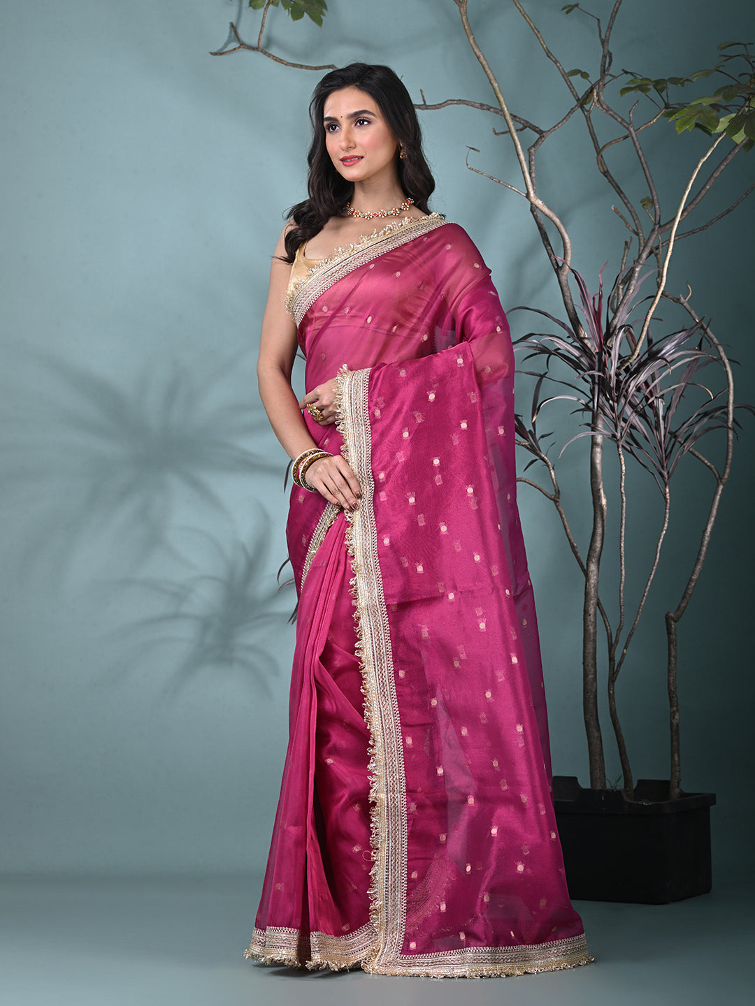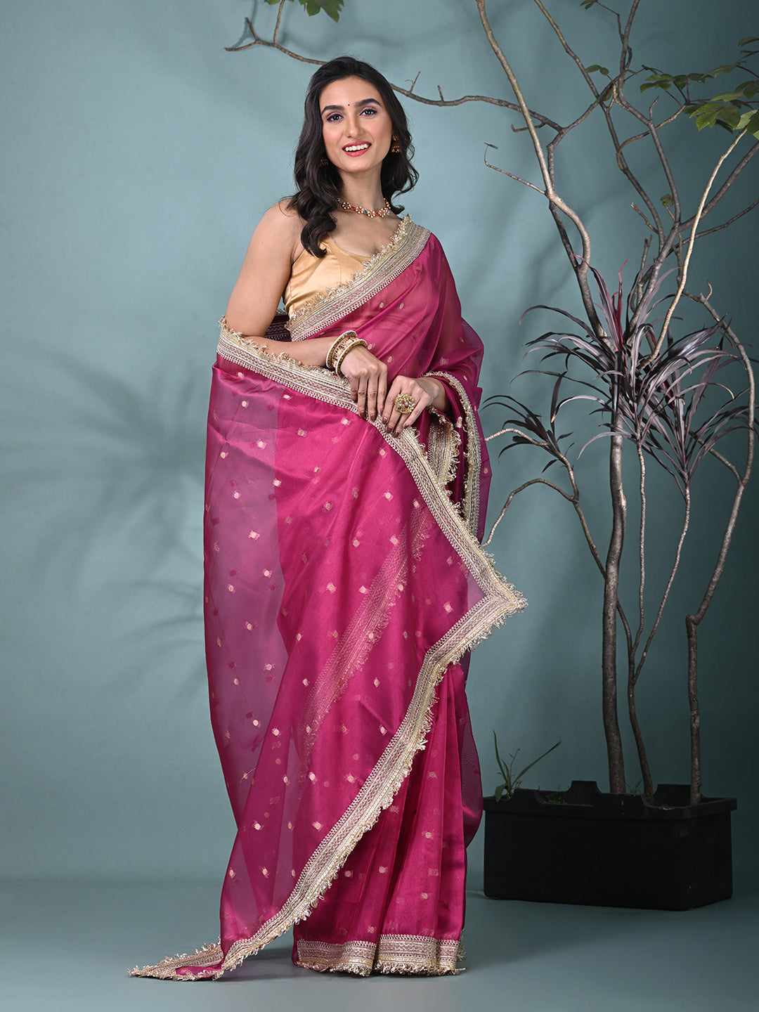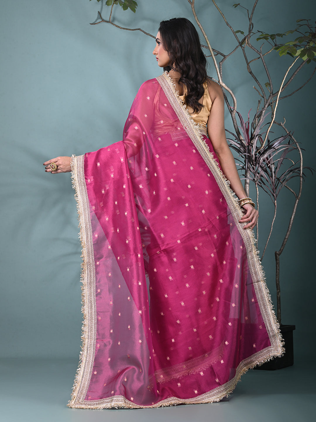 Elevate your festive wardrobe with this stunning pink tissue saree, designed to captivate attention at any special occasion. Crafted from premium tissue fabric, this saree offers a graceful sheen and lightweight feel, perfect for celebrations. The intricate Gotapatti work along the borders adds a touch of traditional elegance, making it a standout piece for weddings, parties, and cultural events. The saree is designed with timeless appeal, featuring delicate motifs throughout the fabric that enhance its charm. The contrasting golden-hued border with Gotapatti embroidery brings a sophisticated richness to the overall look. Pair it with a chic blouse and statement accessories for a complete ensemble that blends modern flair with classic artistry.