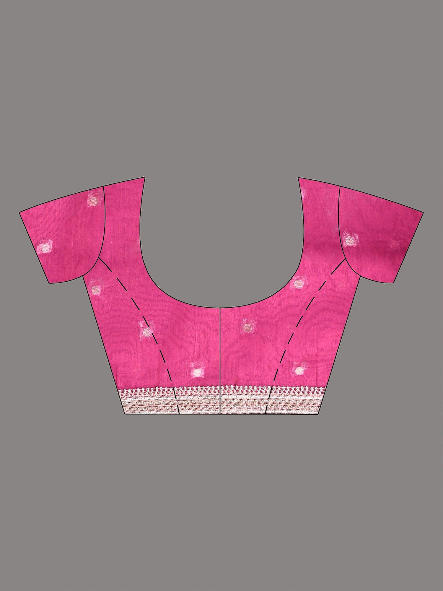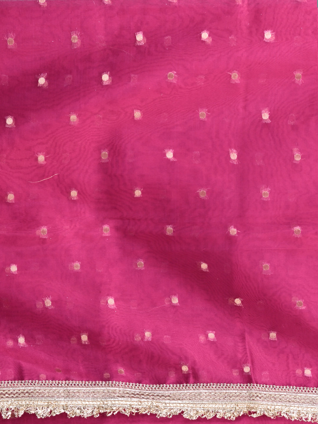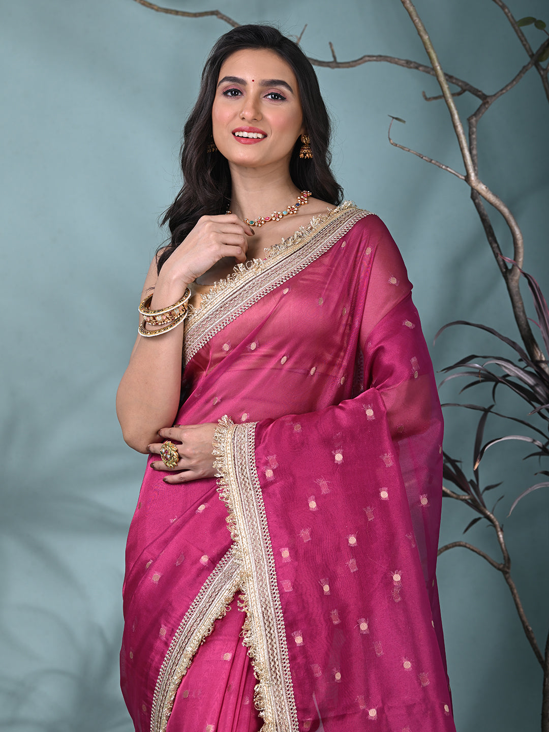 Elevate your festive wardrobe with this stunning pink tissue saree, designed to captivate attention at any special occasion. Crafted from premium tissue fabric, this saree offers a graceful sheen and lightweight feel, perfect for celebrations. The intricate Gotapatti work along the borders adds a touch of traditional elegance, making it a standout piece for weddings, parties, and cultural events. The saree is designed with timeless appeal, featuring delicate motifs throughout the fabric that enhance its charm. The contrasting golden-hued border with Gotapatti embroidery brings a sophisticated richness to the overall look. Pair it with a chic blouse and statement accessories for a complete ensemble that blends modern flair with classic artistry.